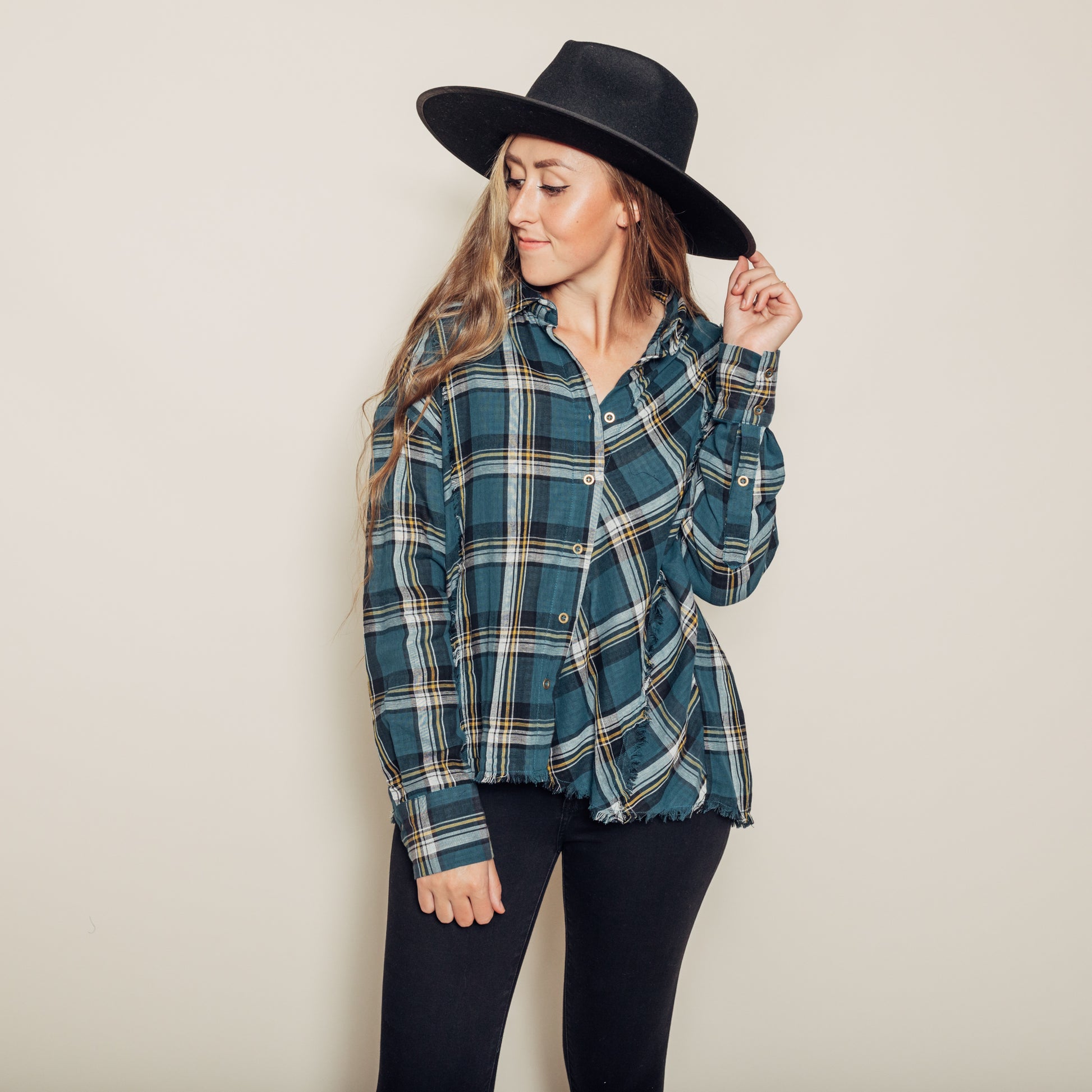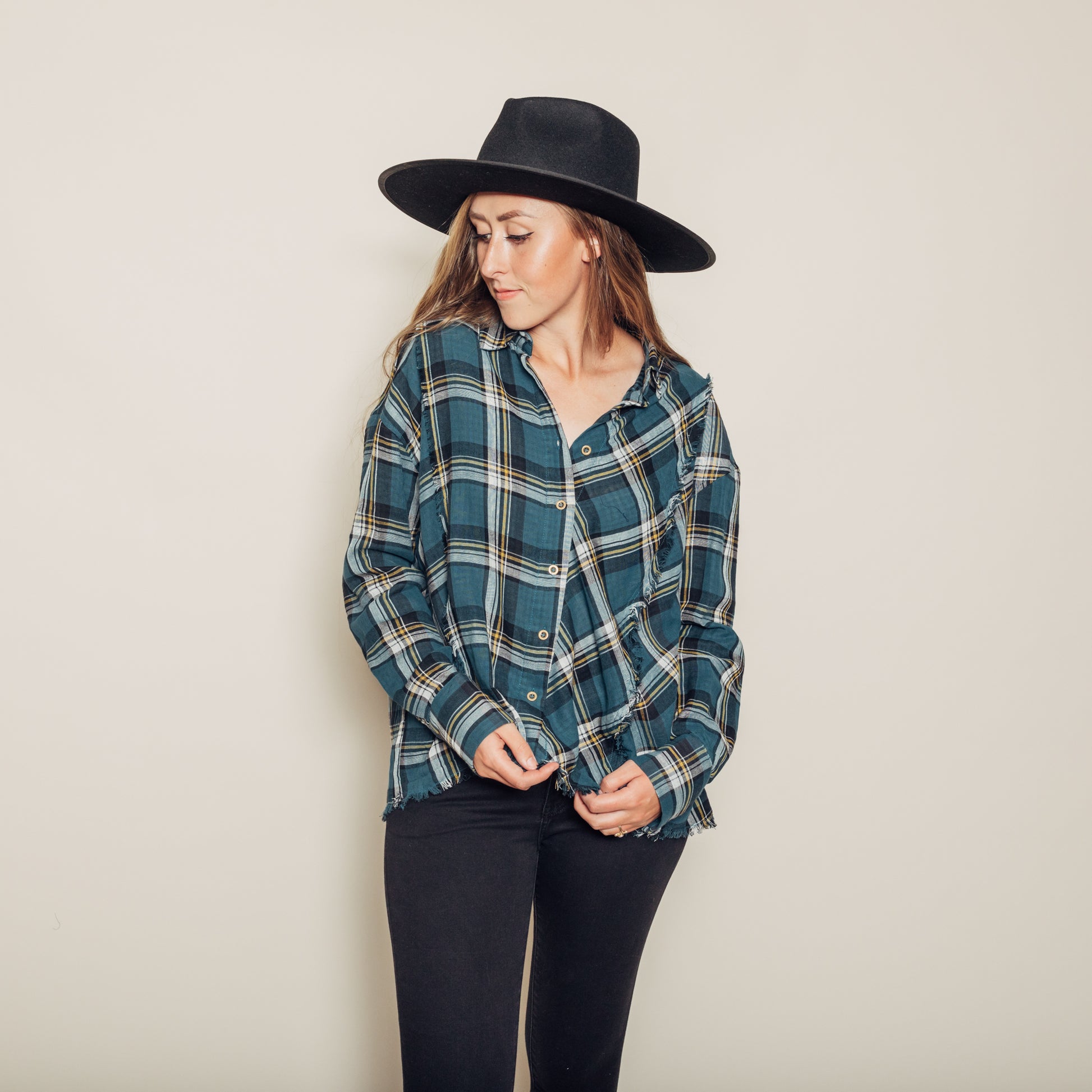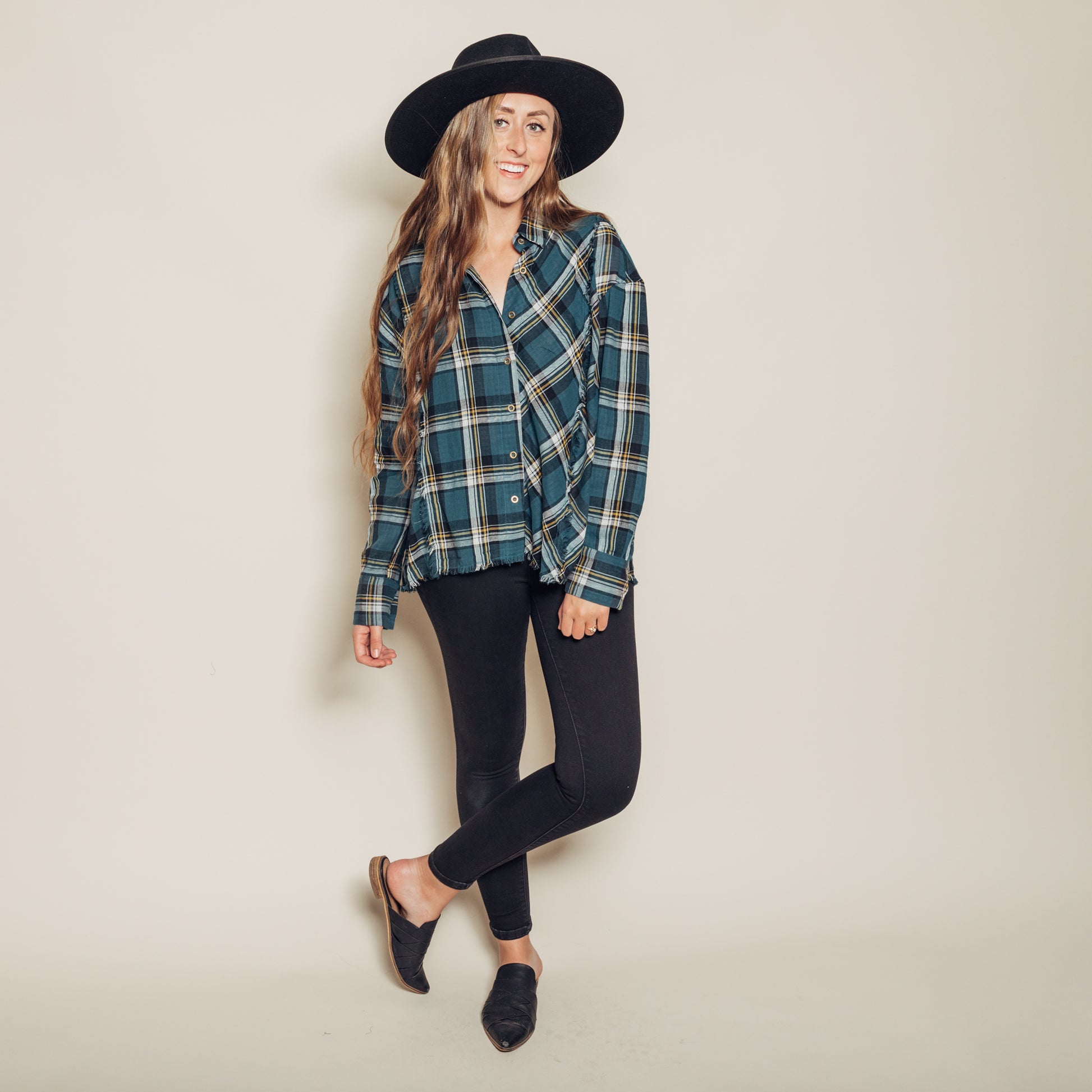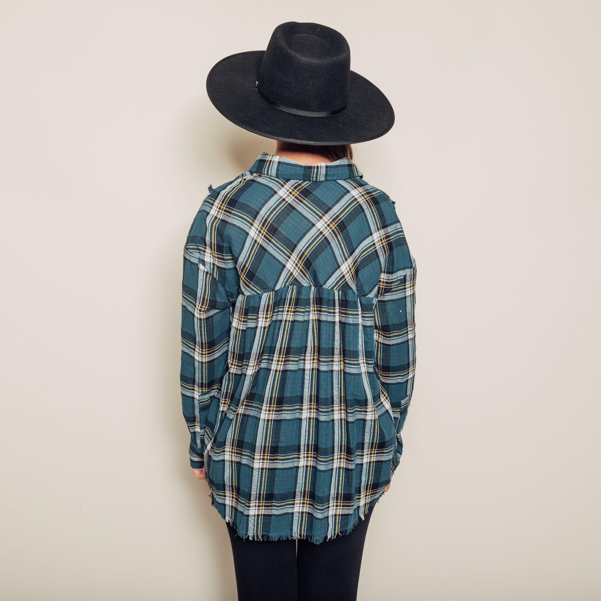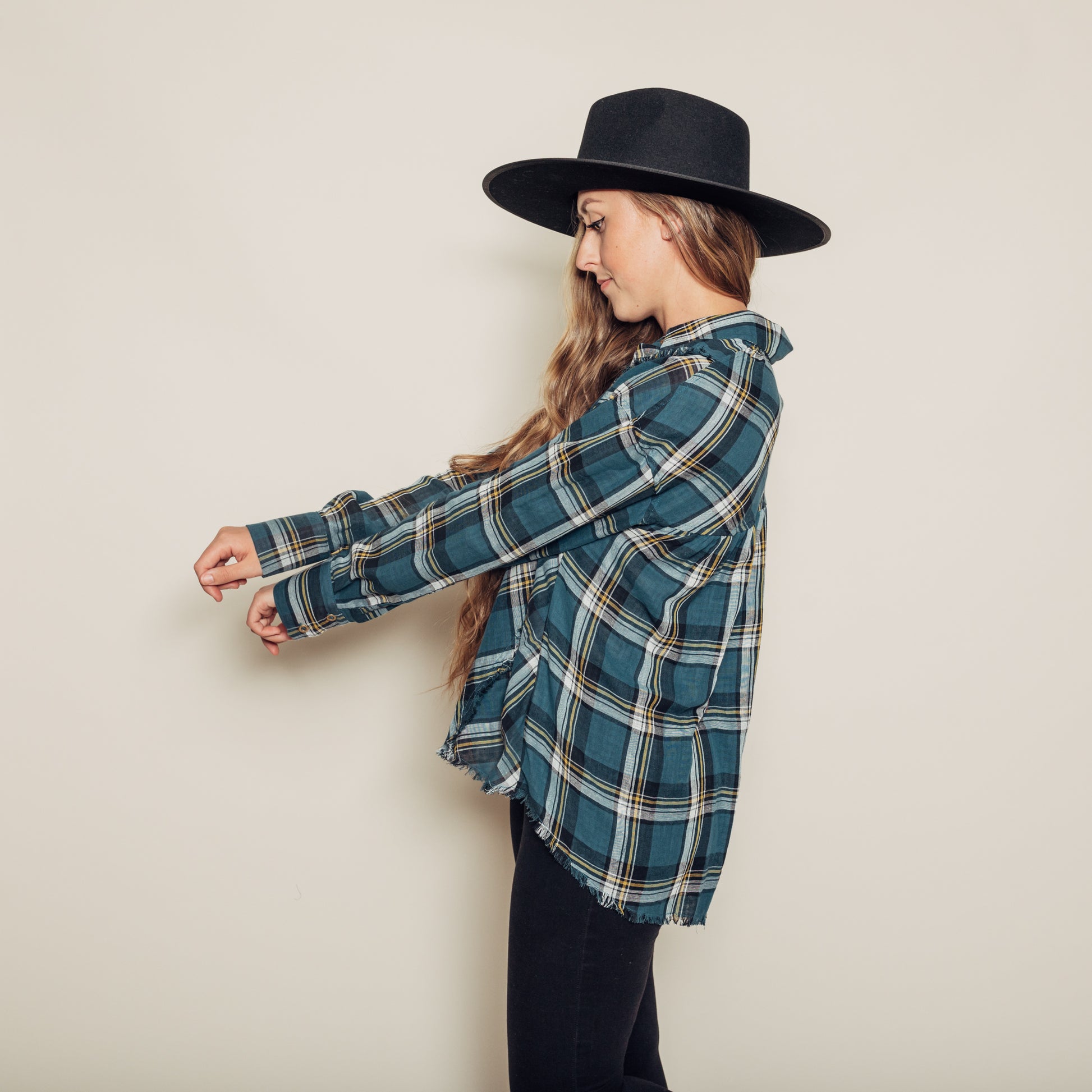 The Alex Top is a lightweight top with functional buttons. It has a loose fit, and it's longer in the back than in it is in the front. The inside has a little different pattern than the outside. It also has raw edges. I am 5'9" and wearing a size small. The fabric content is 100% cotton.