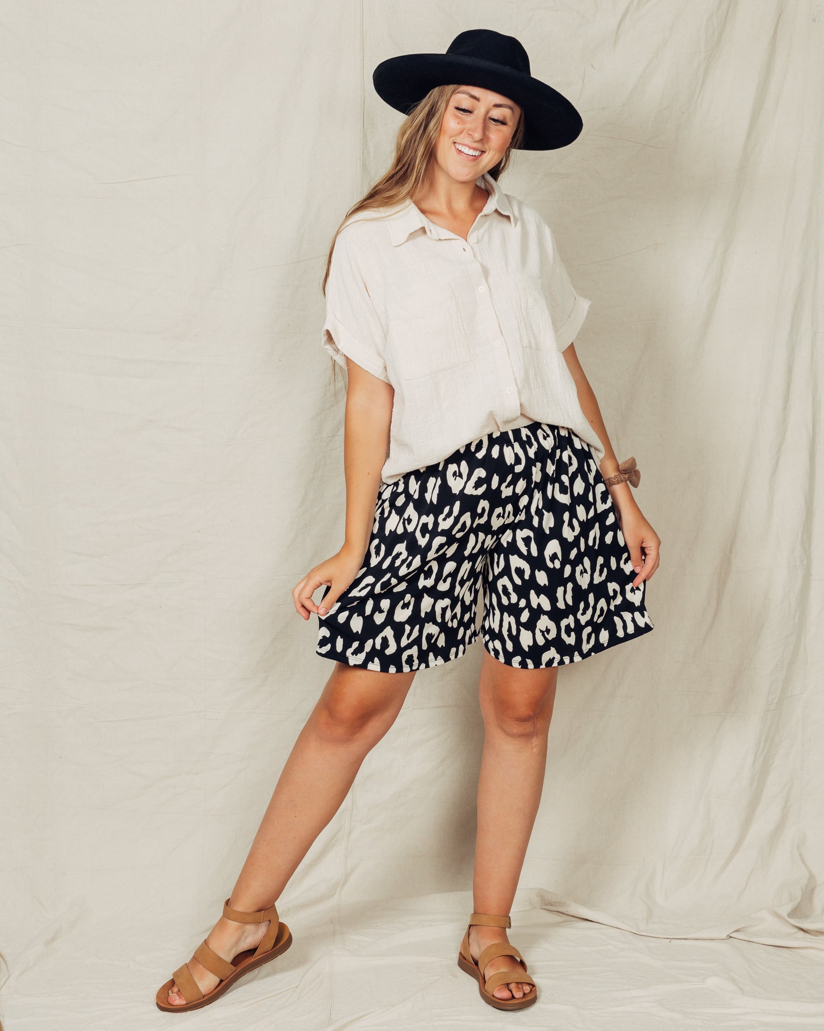 Our Arabella Shorts are one of the most loved items EVER in the shop. They look like a skirt, but they are shorts. Each pair has pockets, and they are pretty perfect for hot weather. The sizing is pretty flexible, and the waistband is SUPER stretchy. If you are wanting them to be longer, I would recommend sizing up. I am 5'9" and wearing a size small. The fabric content is 96% polyester, and 4% spandex.