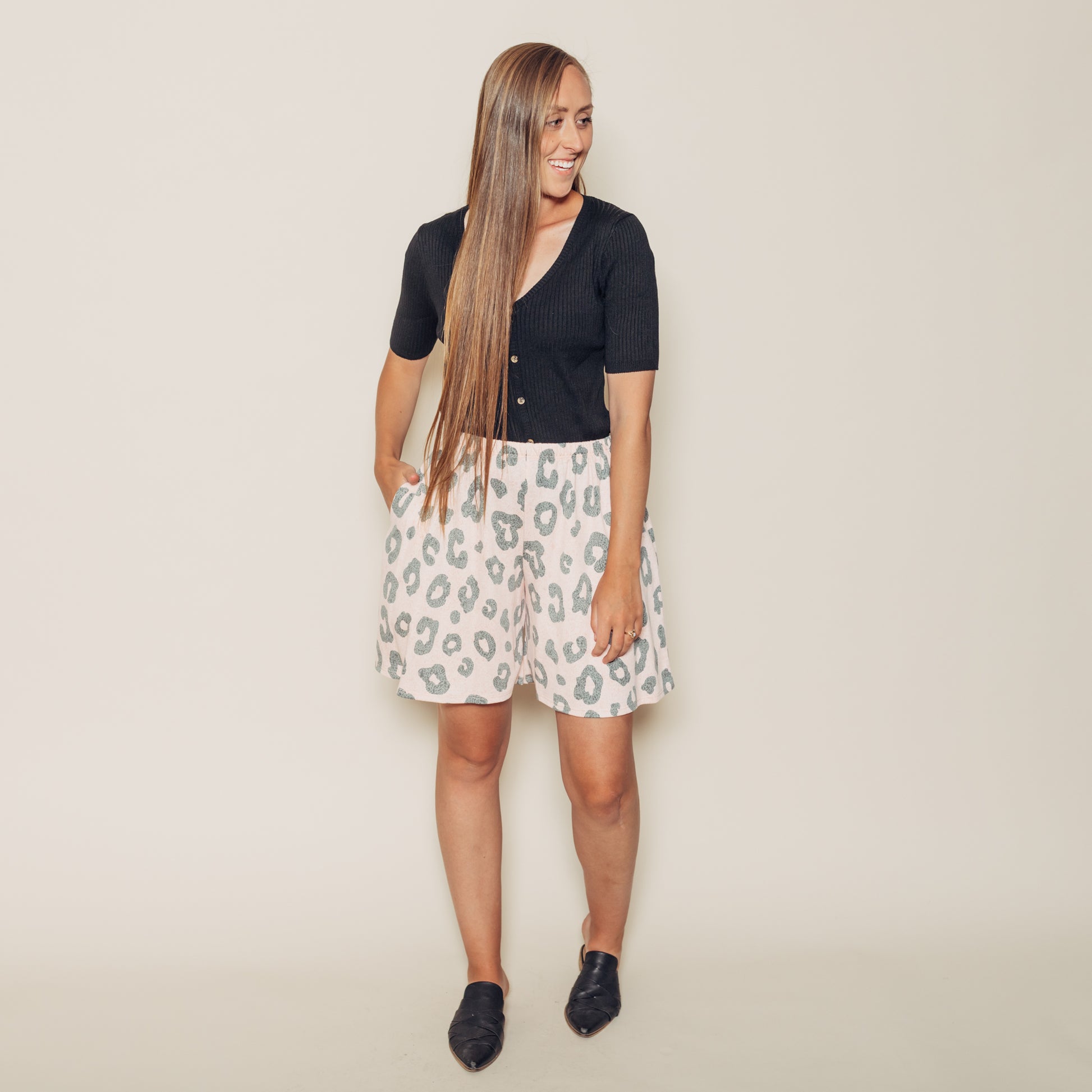 Our Arabella Shorts are one of the most loved items EVER in the shop. They look like a skirt, but they are shorts. Each pair has pockets, and they are pretty perfect for hot weather. The sizing is pretty flexible, and the waistband is SUPER stretchy. If you are wanting them to be longer, I would recommend sizing up. I am 5'9" and wearing a size small. The fabric content is 75% polyester, 20% rayon, and 5% spandex.
