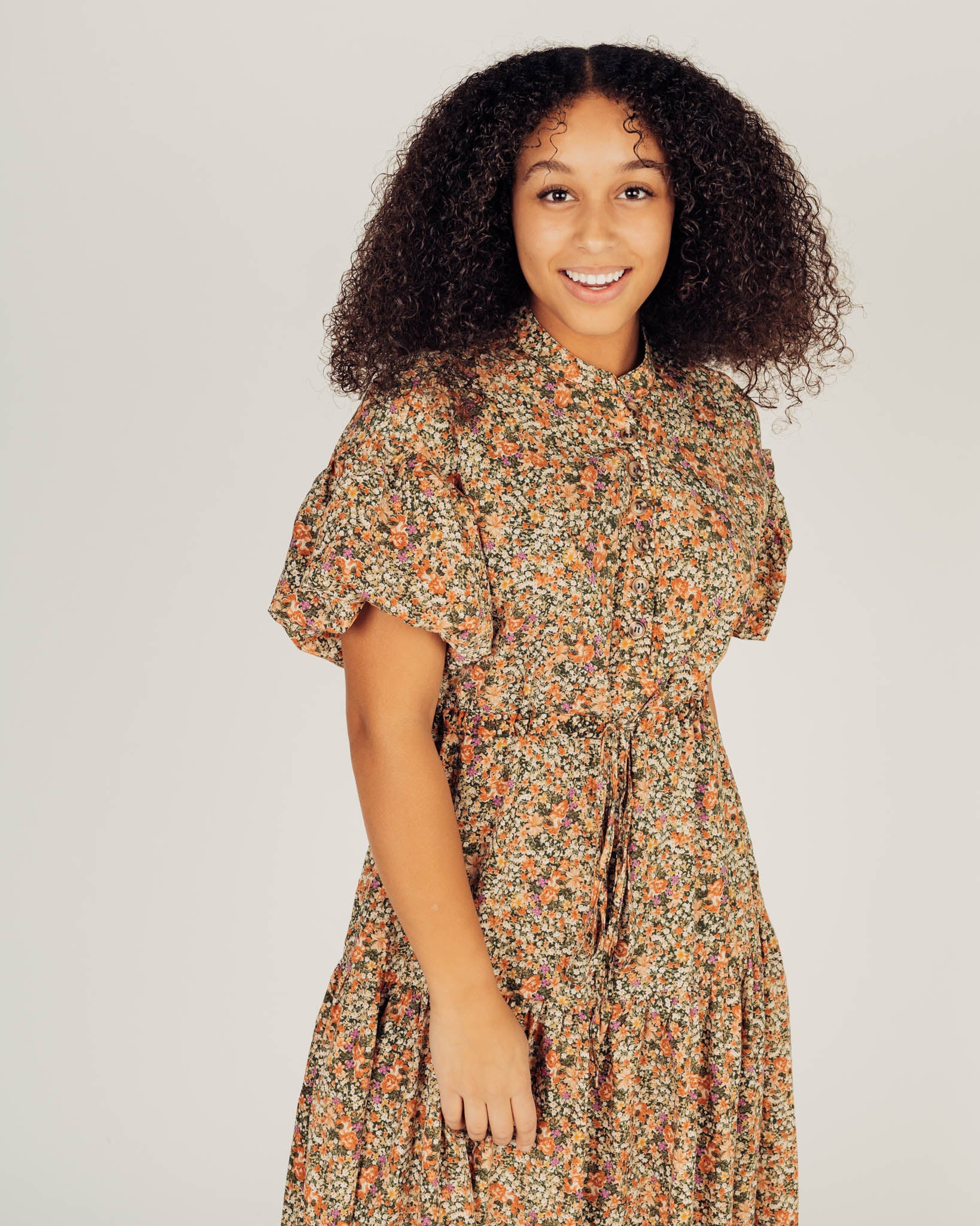model is wearing size small. top has functional buttons all the way to the waist. waistband ties as small as you want. fully lined. 100% polyester.