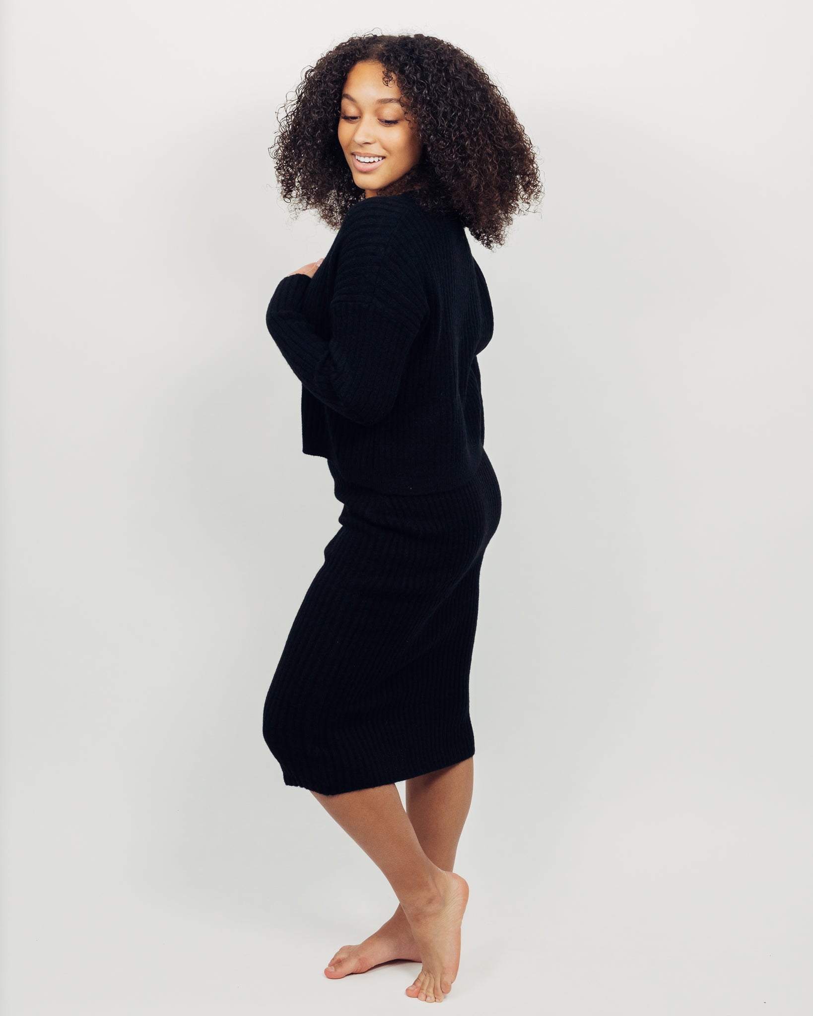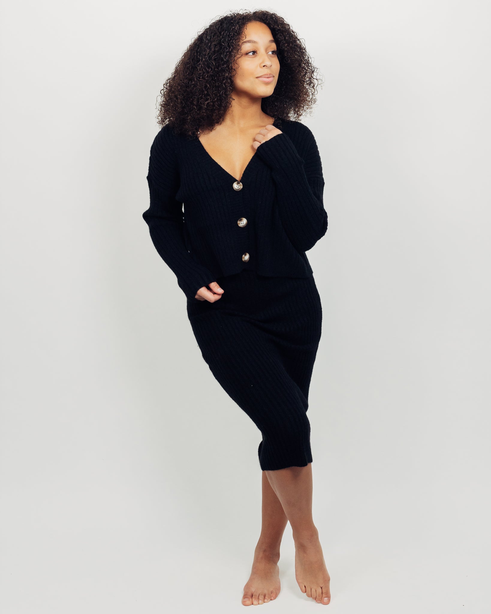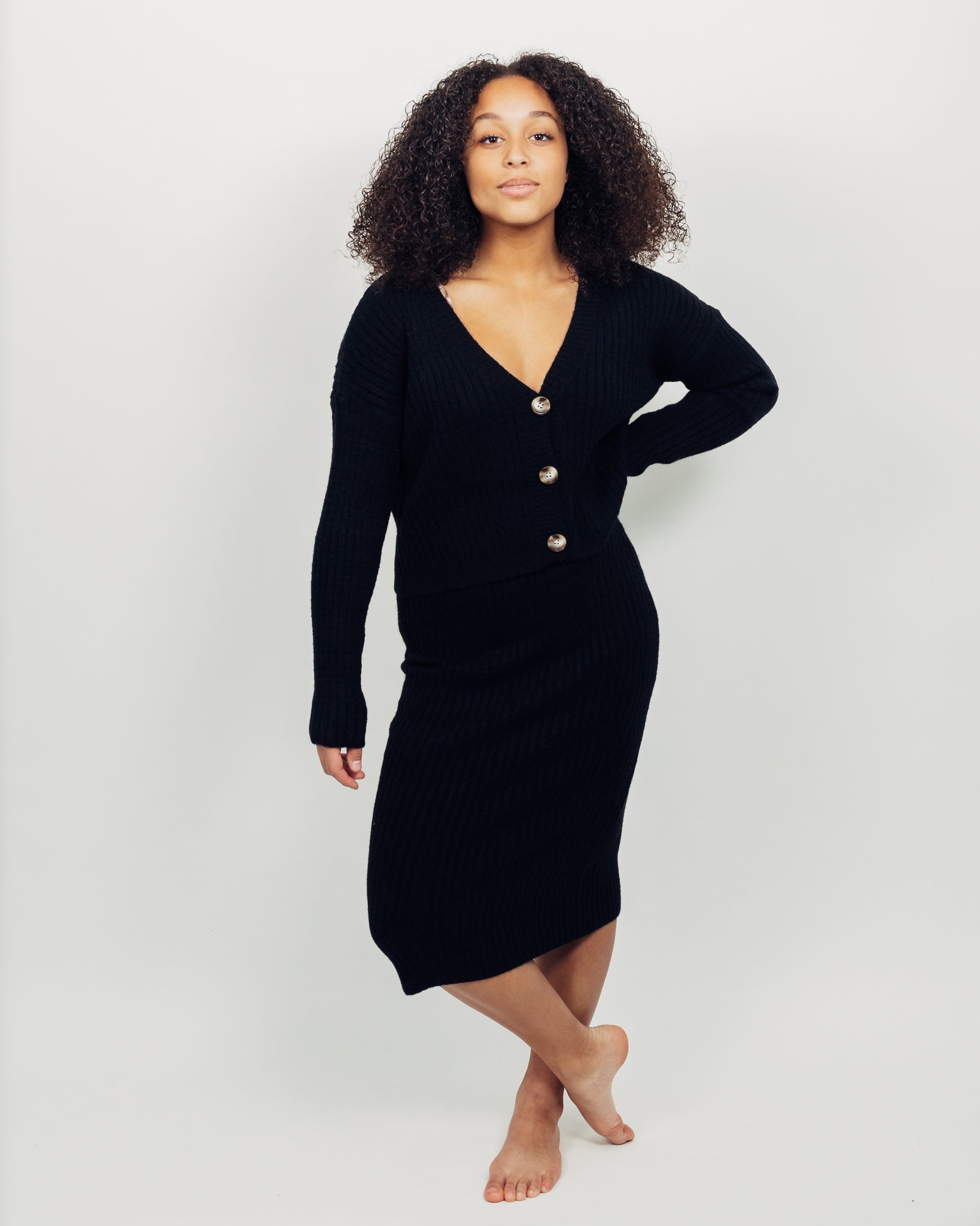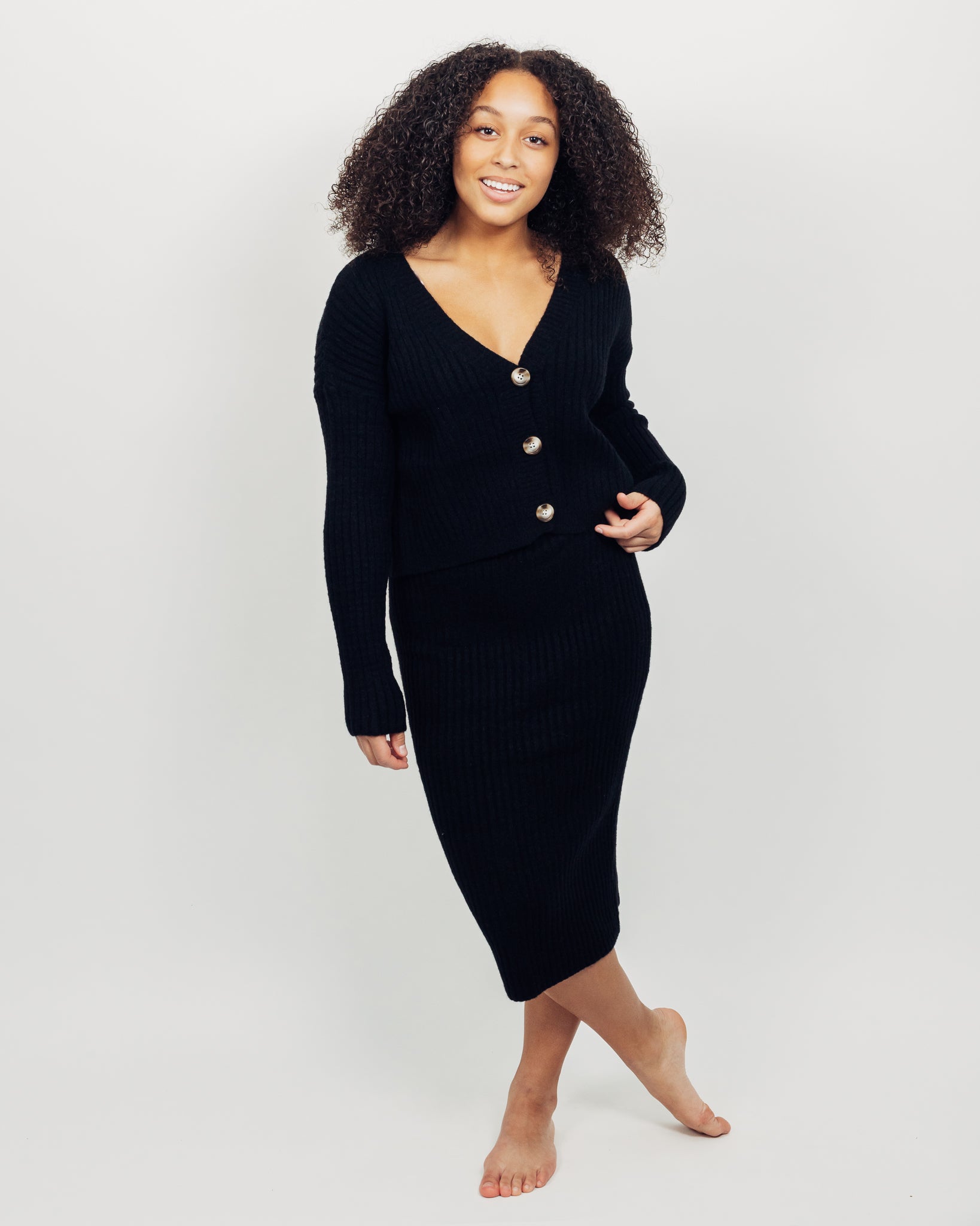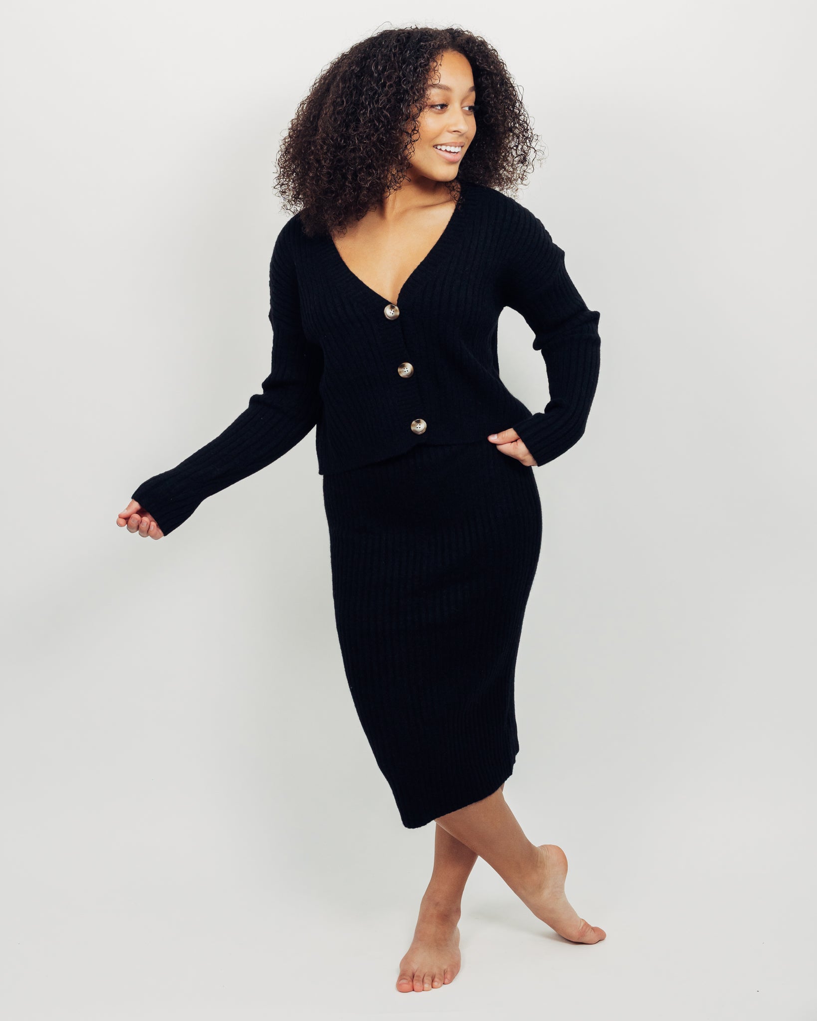 Model is wearing a size small. This is a pencil skirt and cardigan set, and it is pretty stretchy! The fabric content is 48% viscose, 24% nylon, 28% PBT