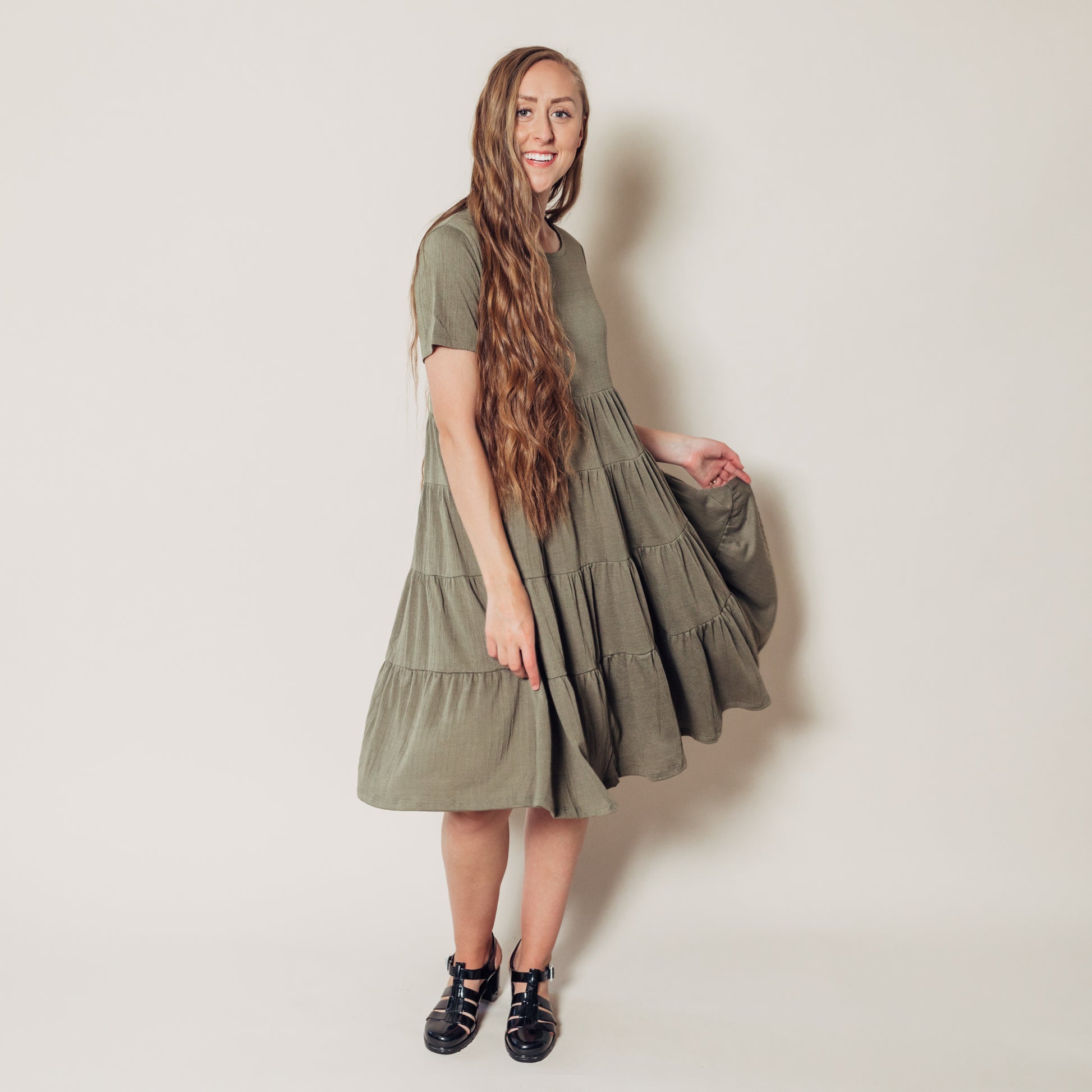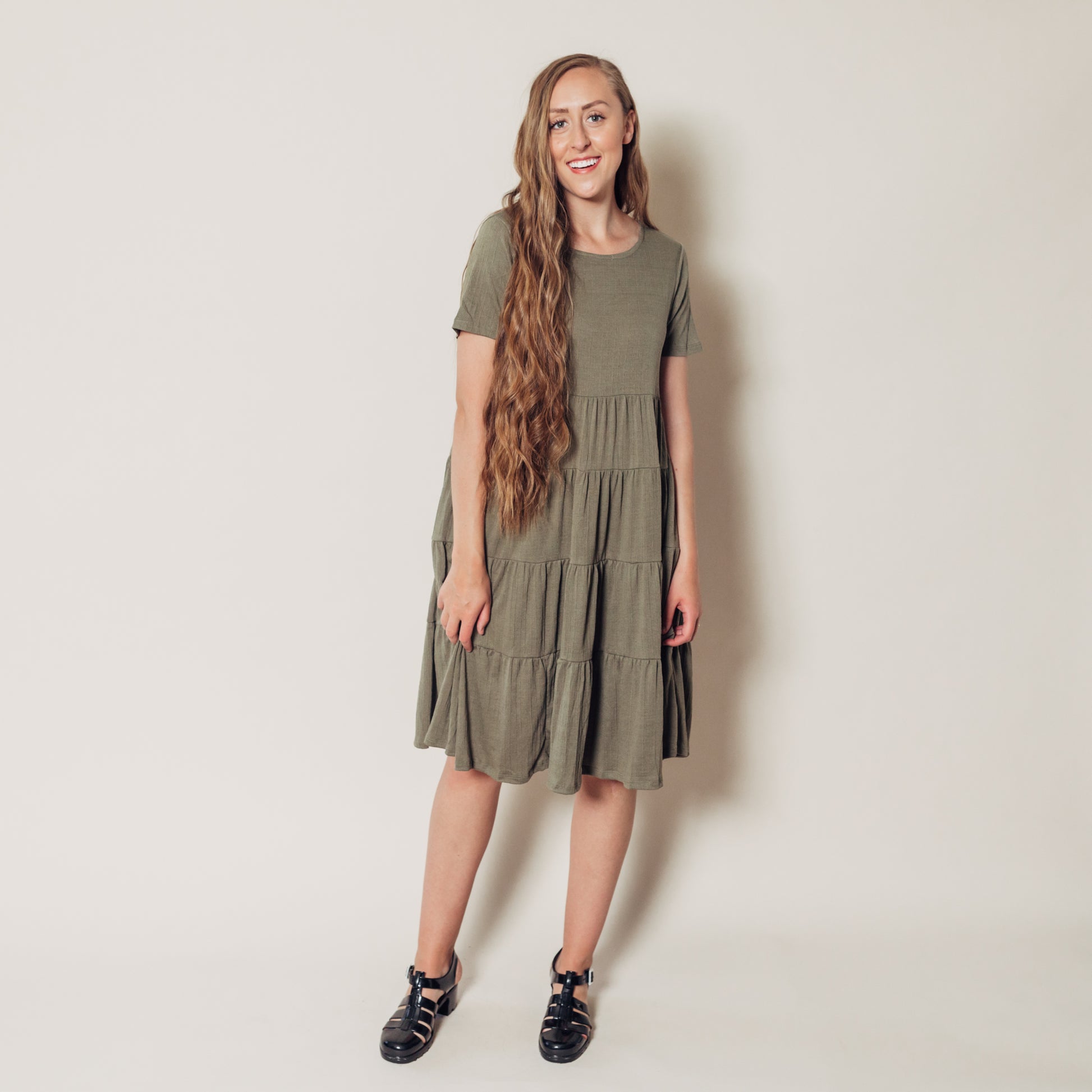 The Charli Dress will easily become a favorite because it is so effortless. The tiers in the skirt are so cute, and it flows so beautifully! The fabric is butter soft and stretchy, but the seams are not stretchy. It is bump friendly, but I would recommend sizing up if you have a bump. The fabric content is 95% rayon and 5% spandex. I am 5'9" and wearing a size small.