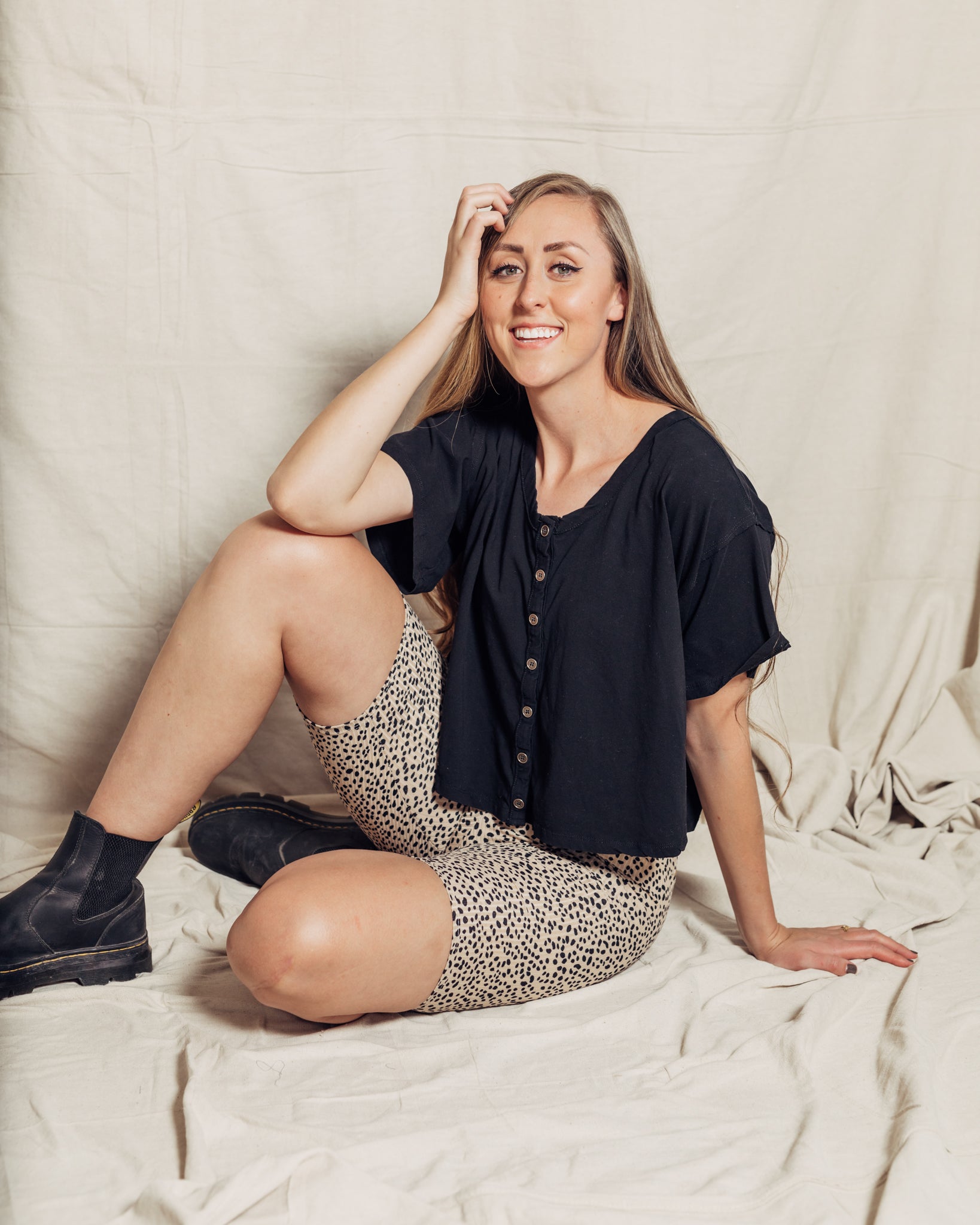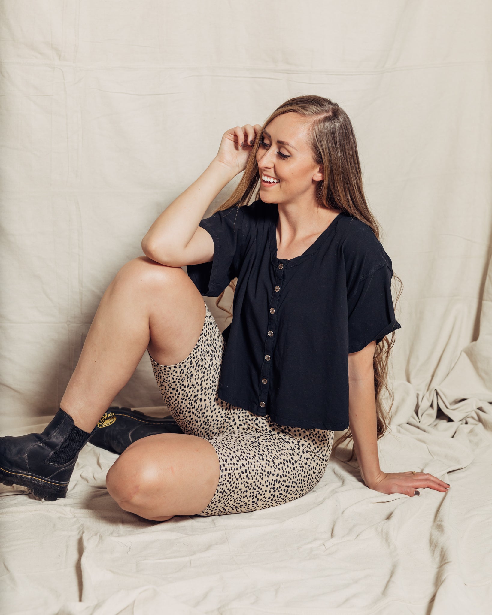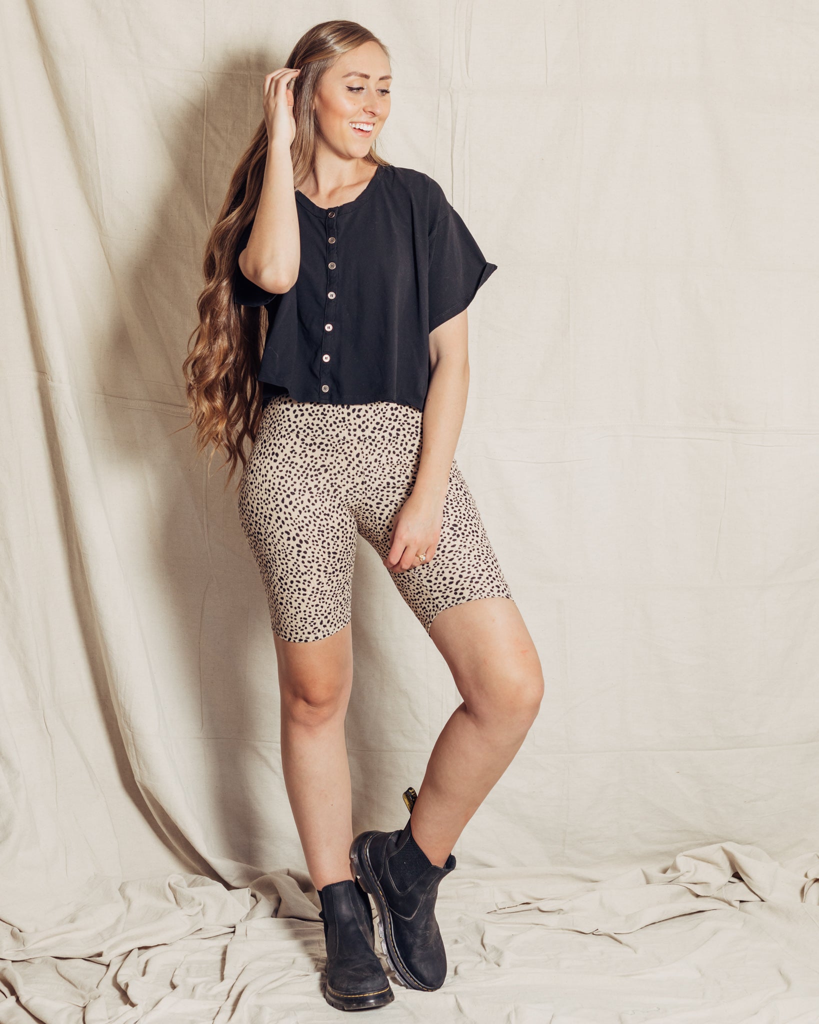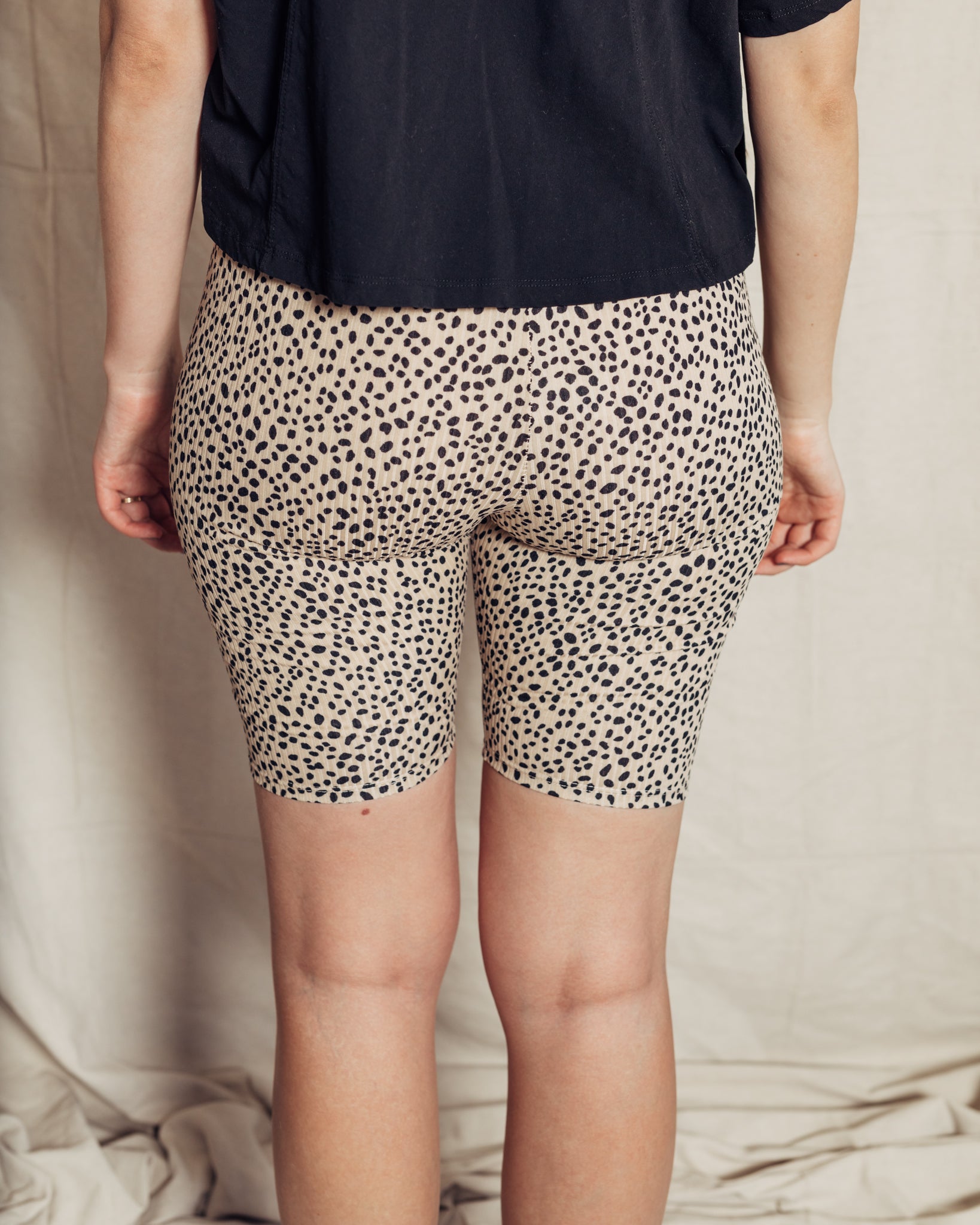 The Cheetah Bike Shorts are great for everyday and for working out or hiking. I am 5'9" and wearing a large because I have a bigger booty. The fabric content is 96% polyester and 4% spandex.