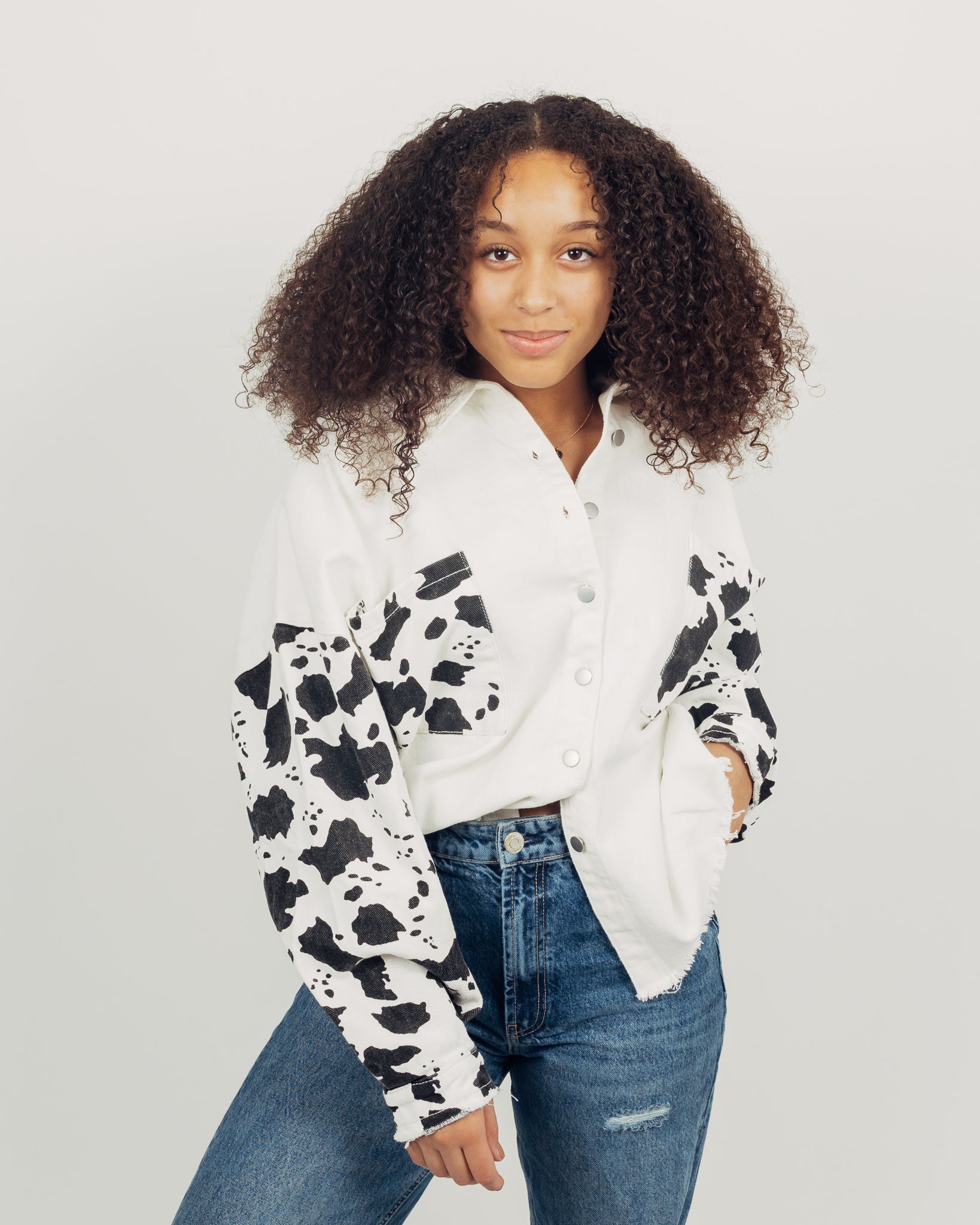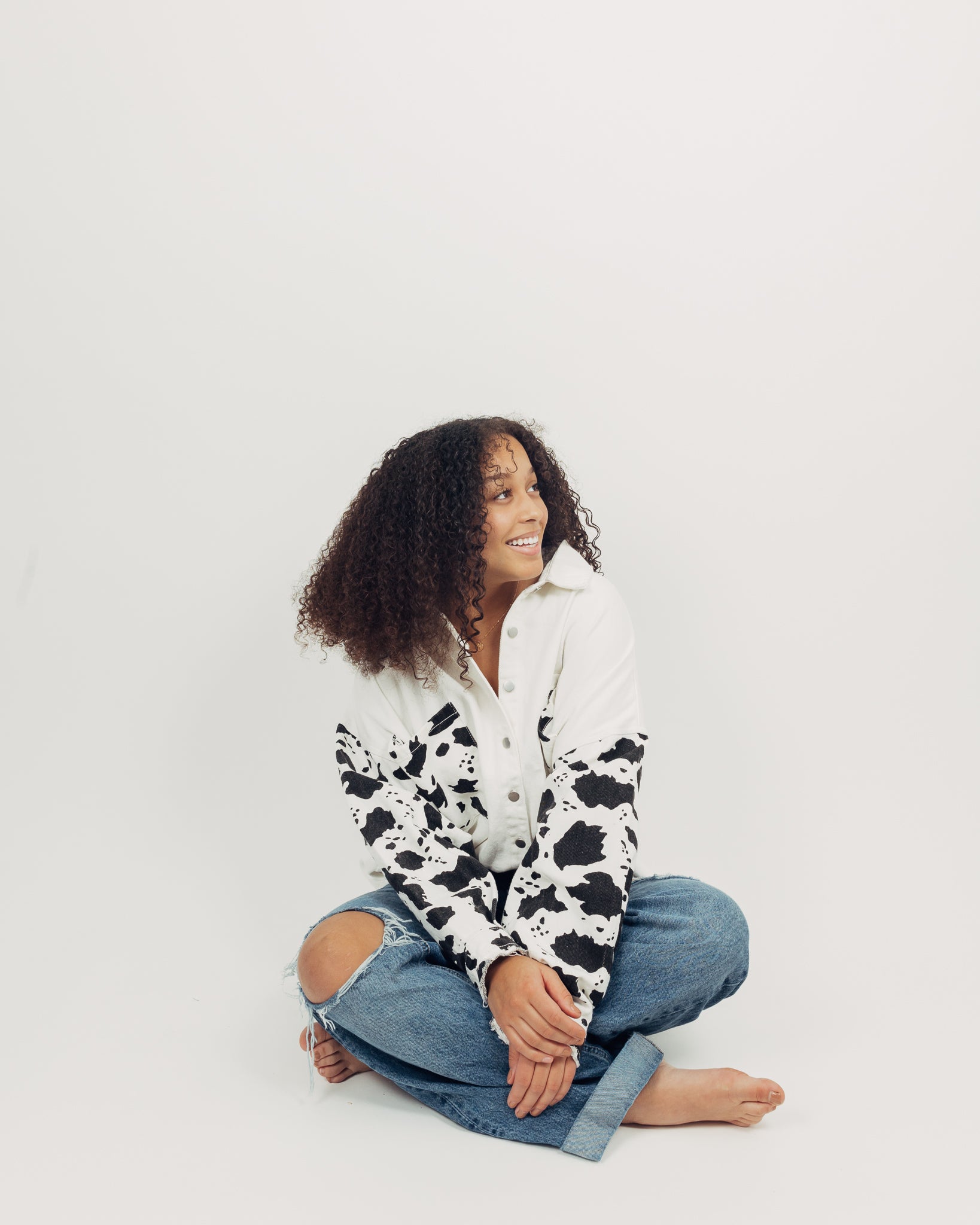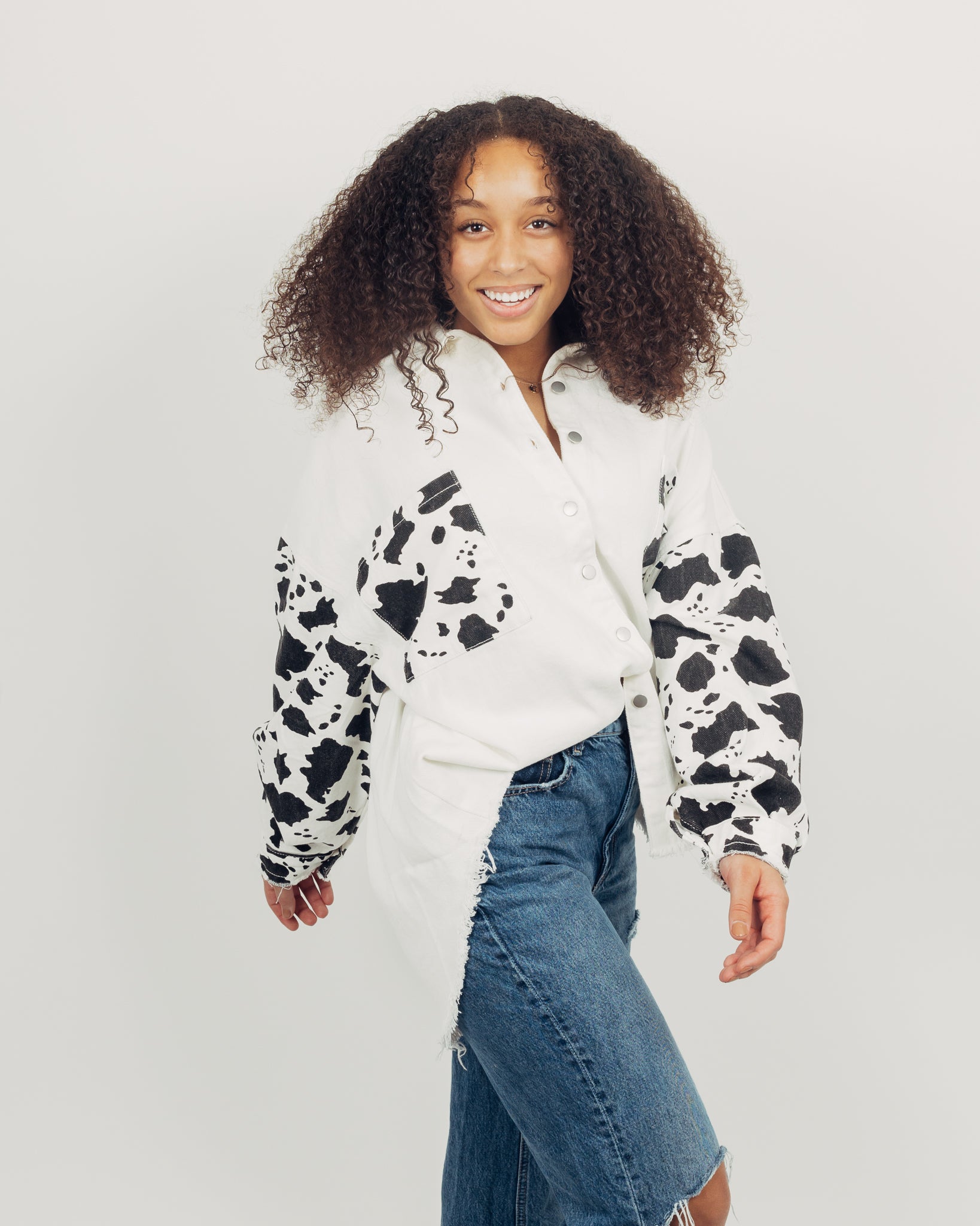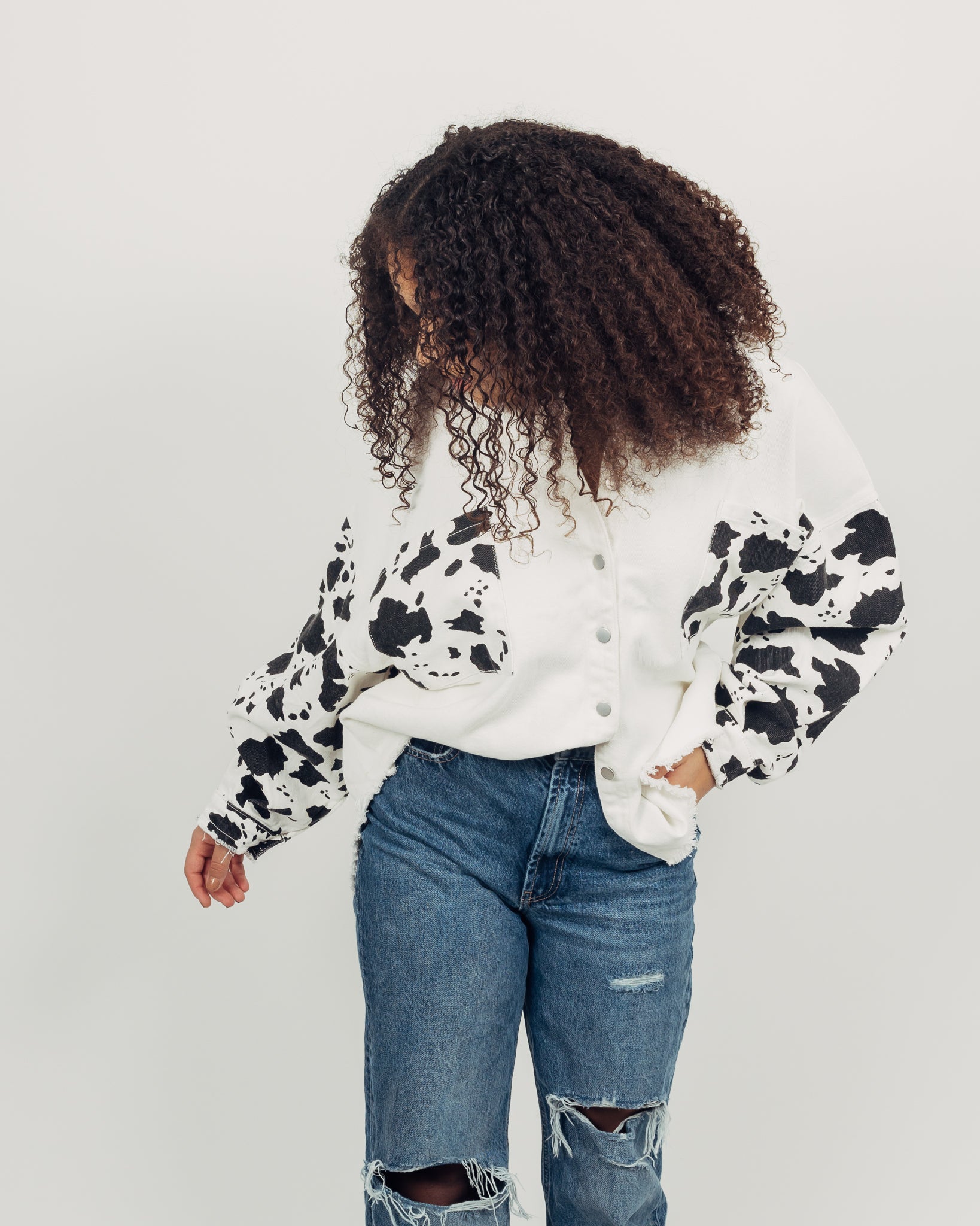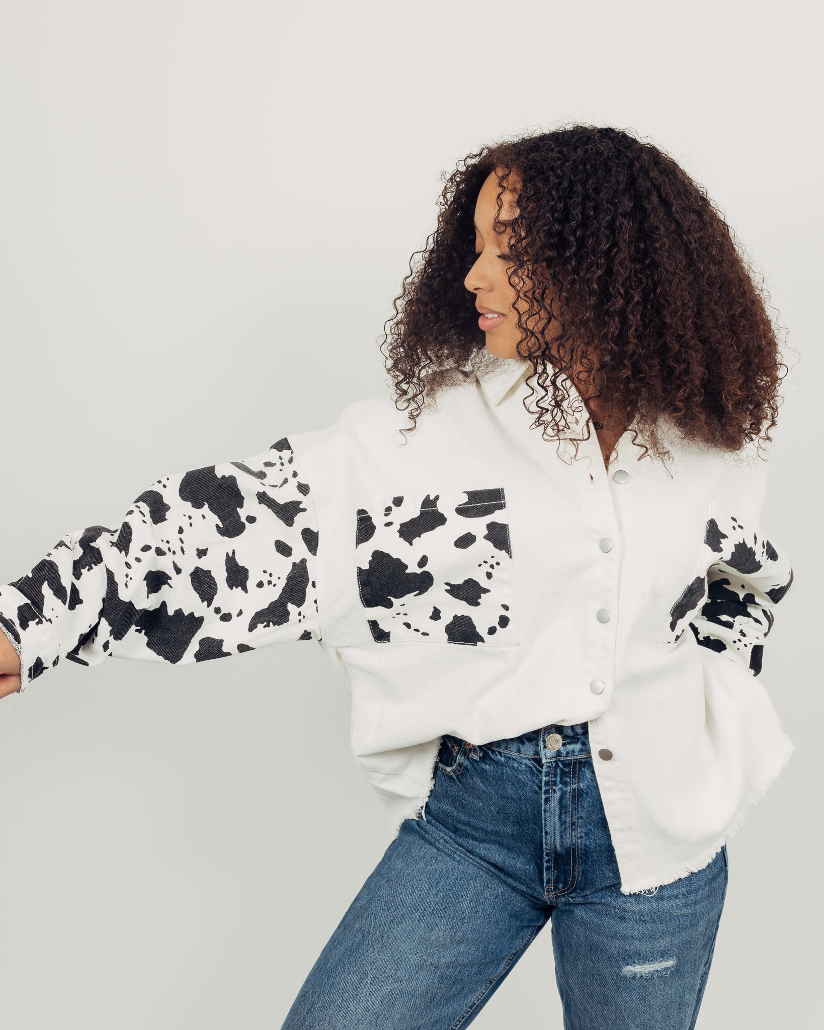 The Cow Shacket is one of my favorite things that the shop has ever had. It is a black white jacket with leopard sleeves and leopard pockets. It has functional buttons, and it's also not stiff. Some denim jackets are pretty stiff, but this one is not. I am 5'9" and wearing a size small. It can be worn as a shirt or a jacket. The fabric content is 100% cotton.