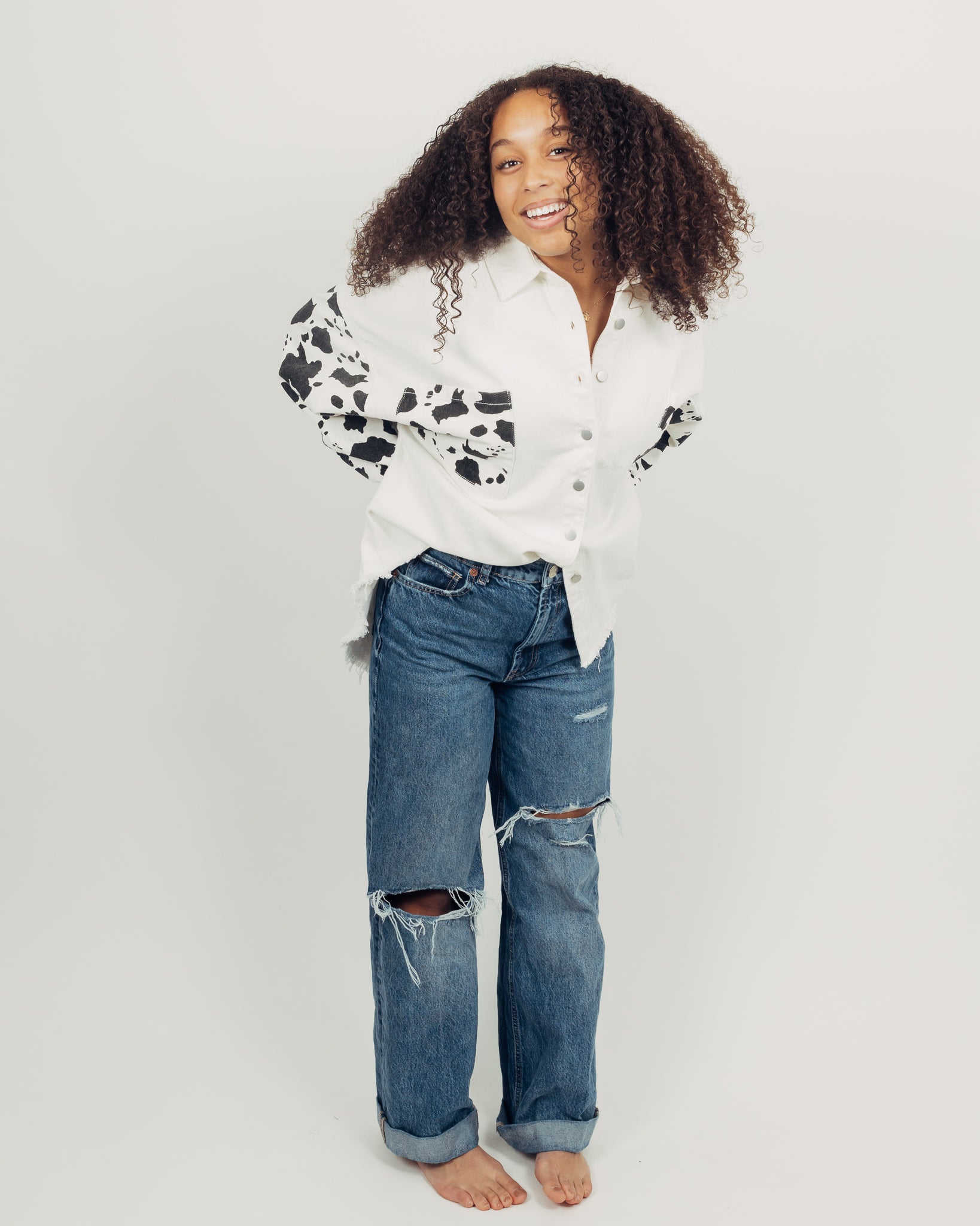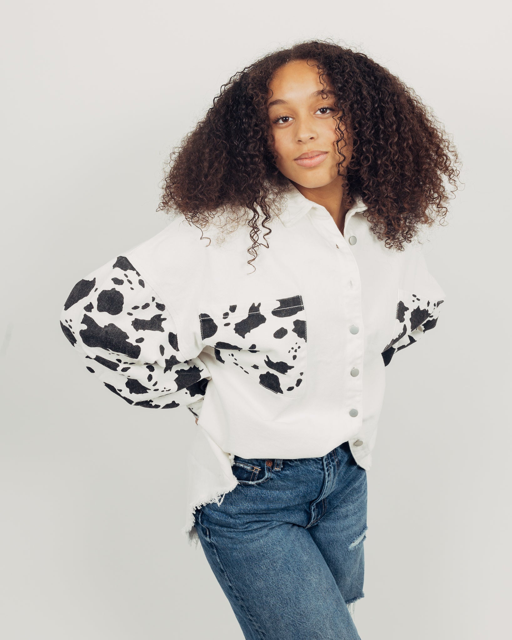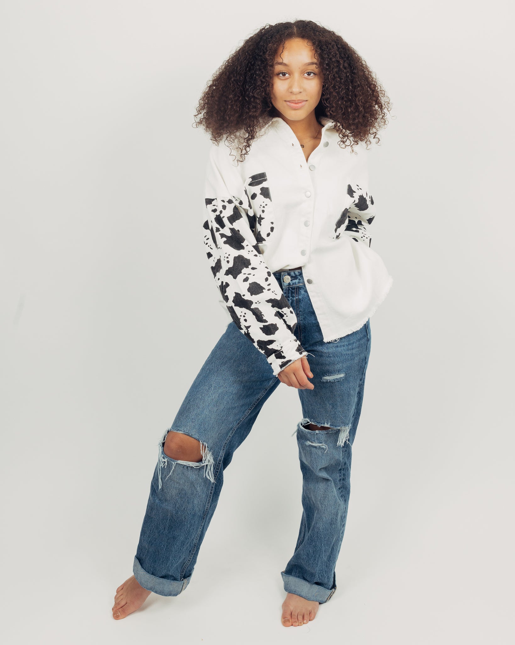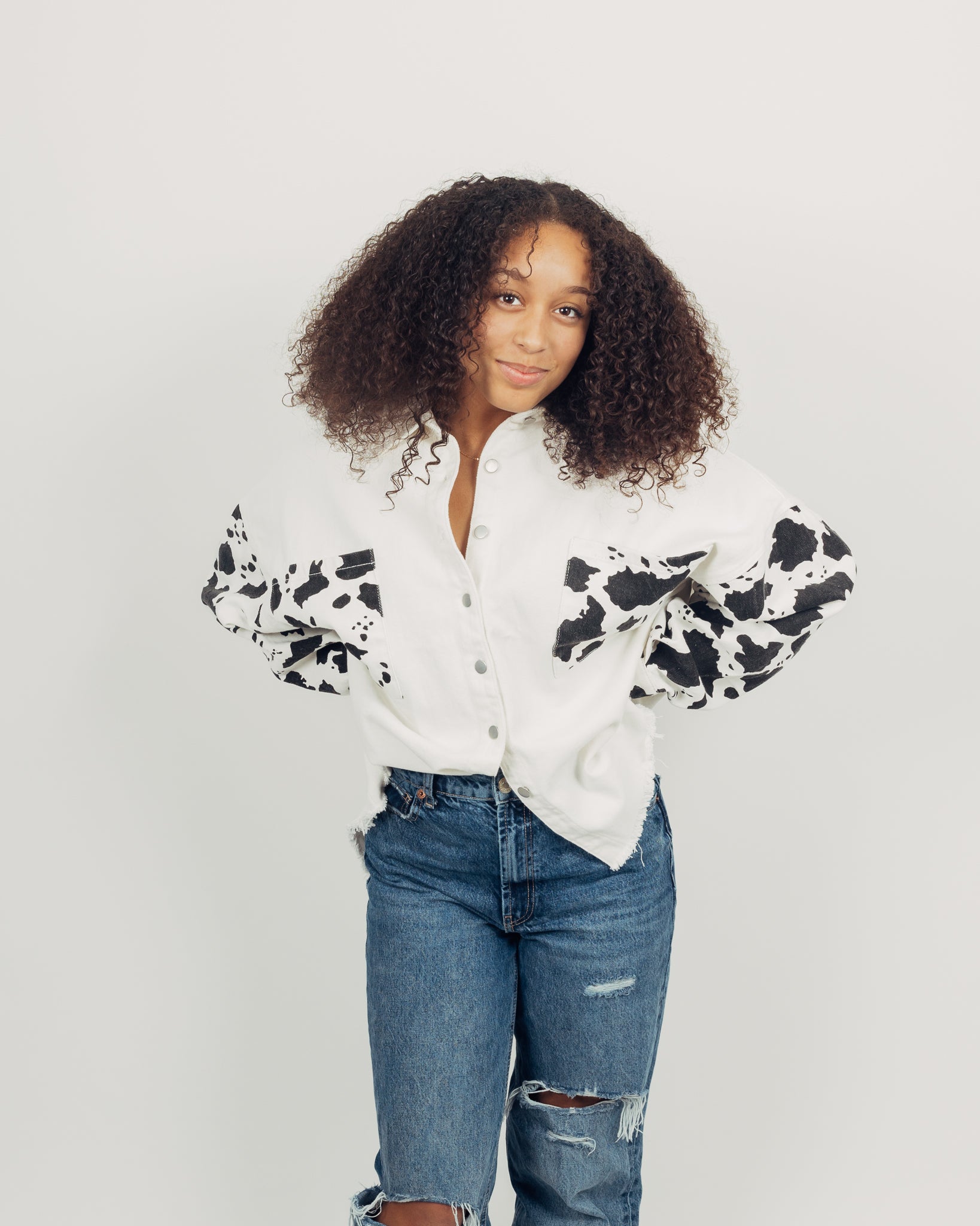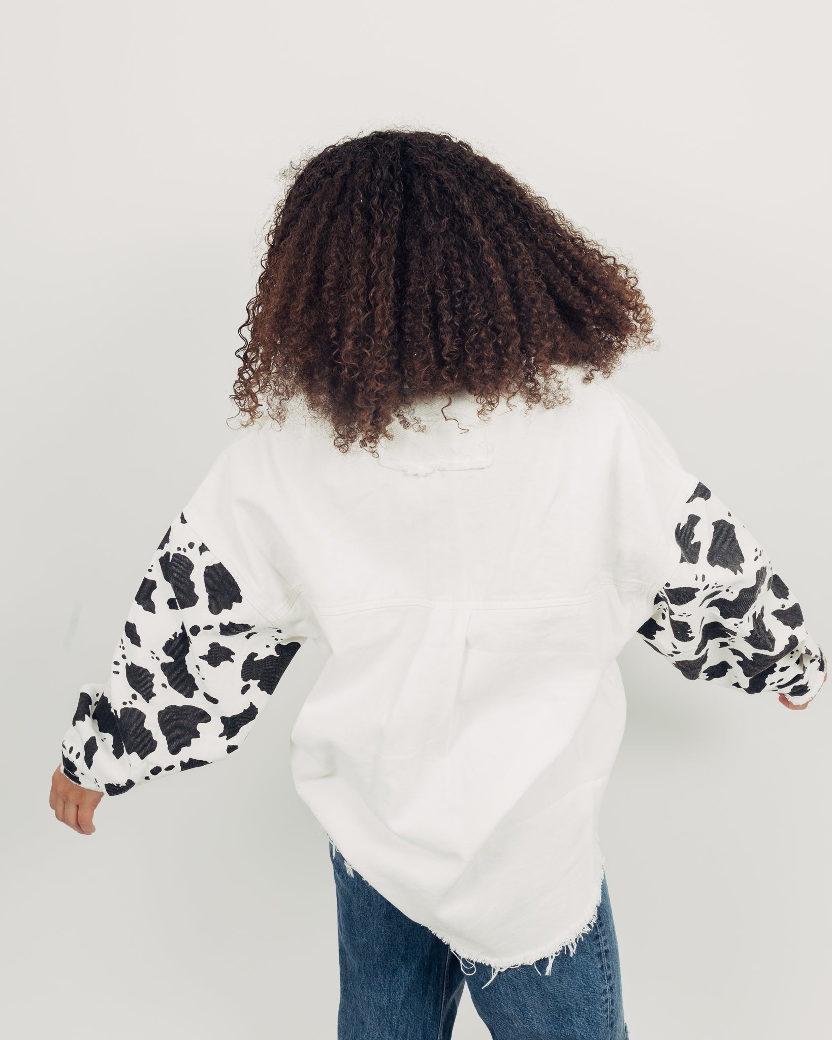 The Cow Shacket is one of my favorite things that the shop has ever had. It is a black white jacket with leopard sleeves and leopard pockets. It has functional buttons, and it's also not stiff. Some denim jackets are pretty stiff, but this one is not. I am 5'9" and wearing a size small. It can be worn as a shirt or a jacket. The fabric content is 100% cotton.