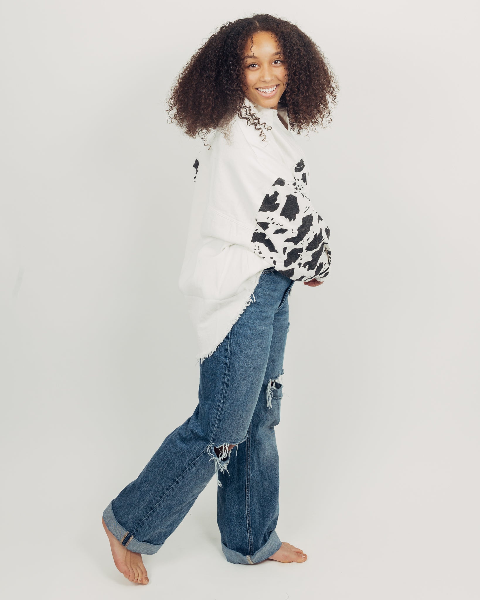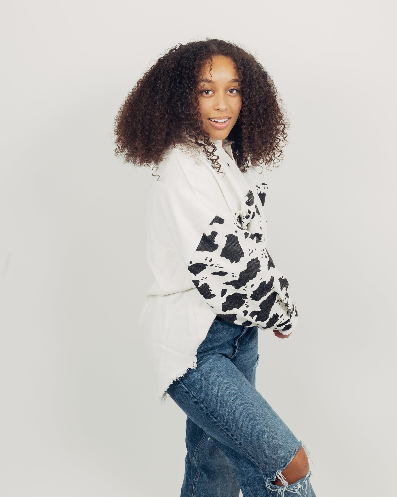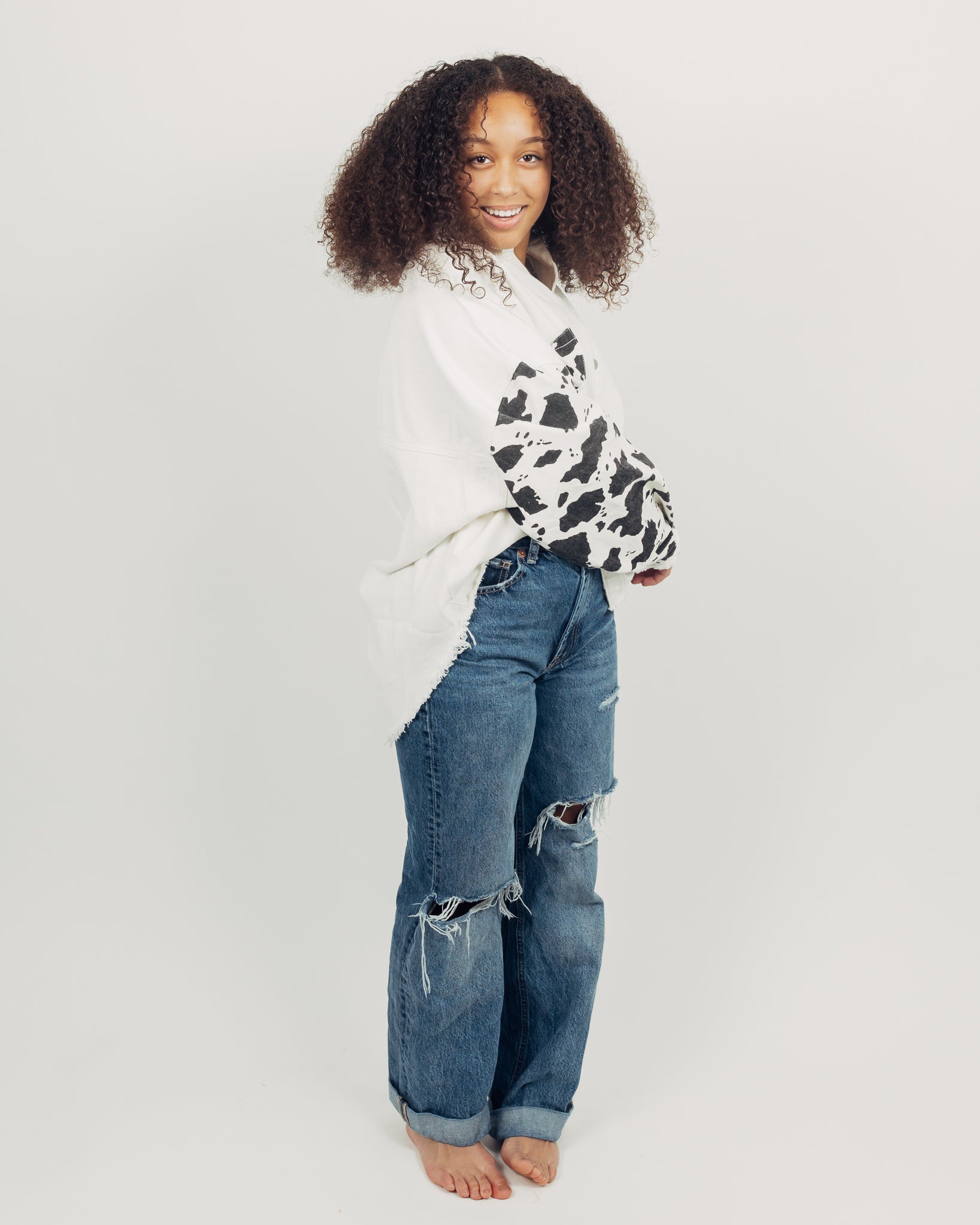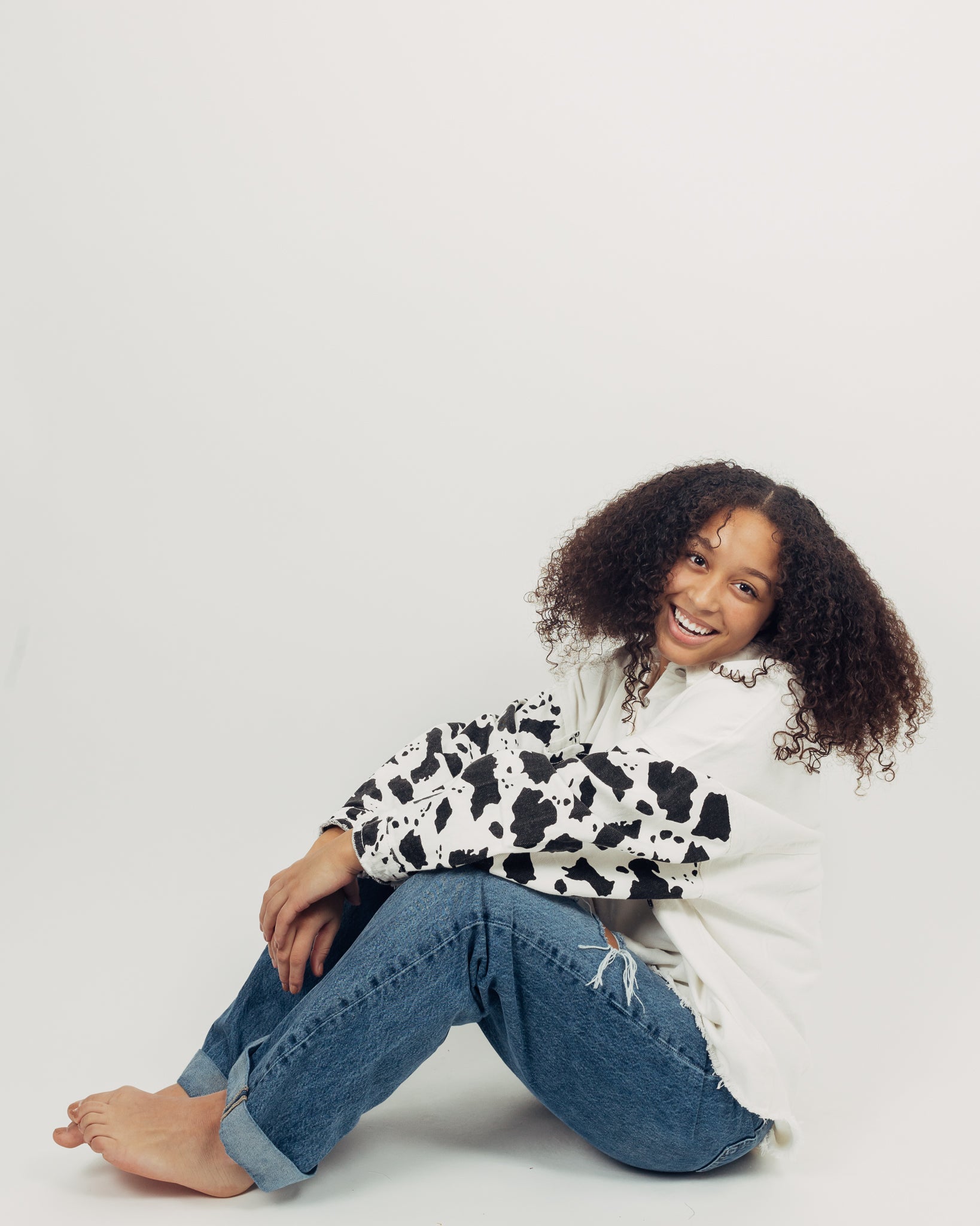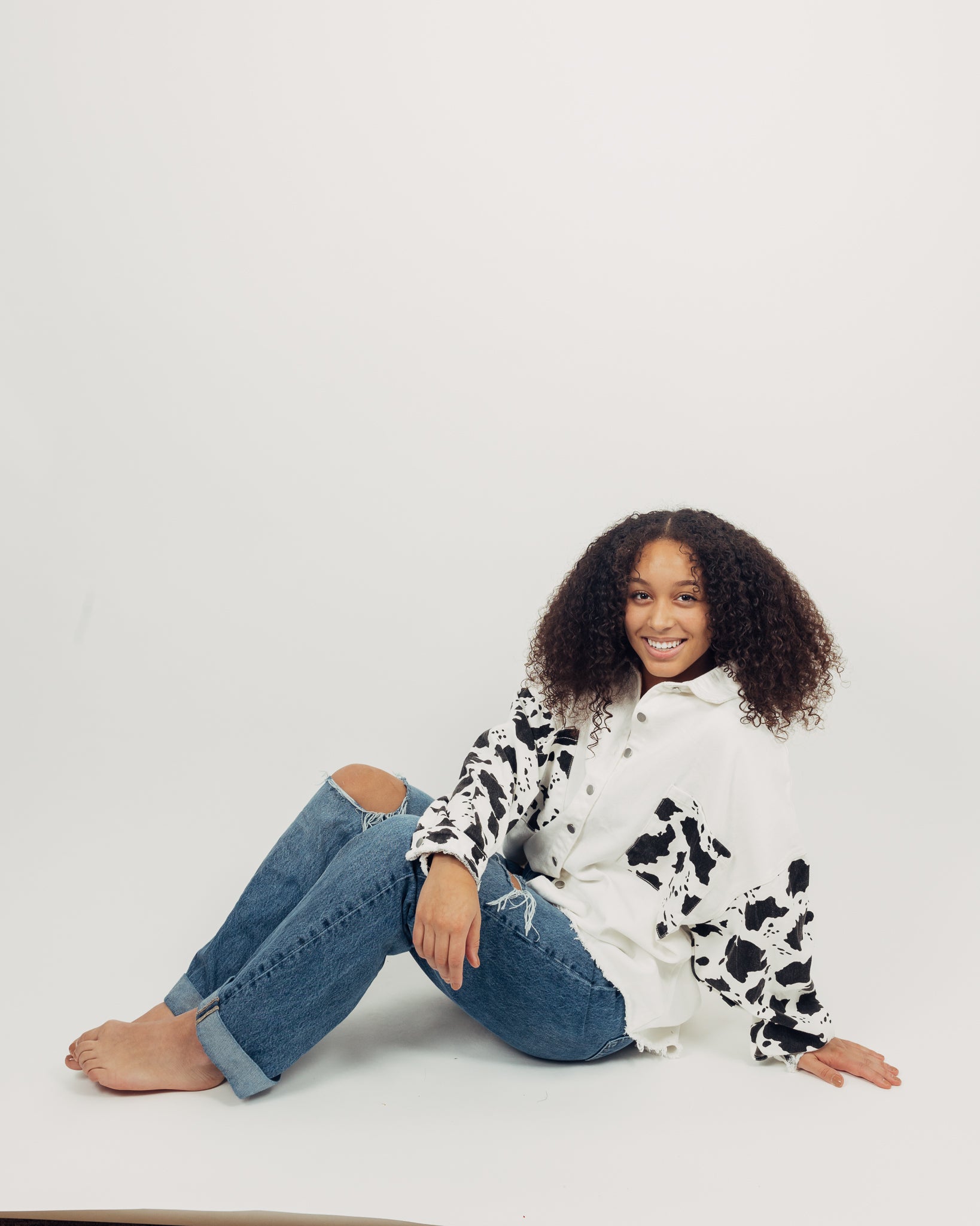 The Cow Shacket is one of my favorite things that the shop has ever had. It is a black white jacket with leopard sleeves and leopard pockets. It has functional buttons, and it's also not stiff. Some denim jackets are pretty stiff, but this one is not. I am 5'9" and wearing a size small. It can be worn as a shirt or a jacket. The fabric content is 100% cotton.