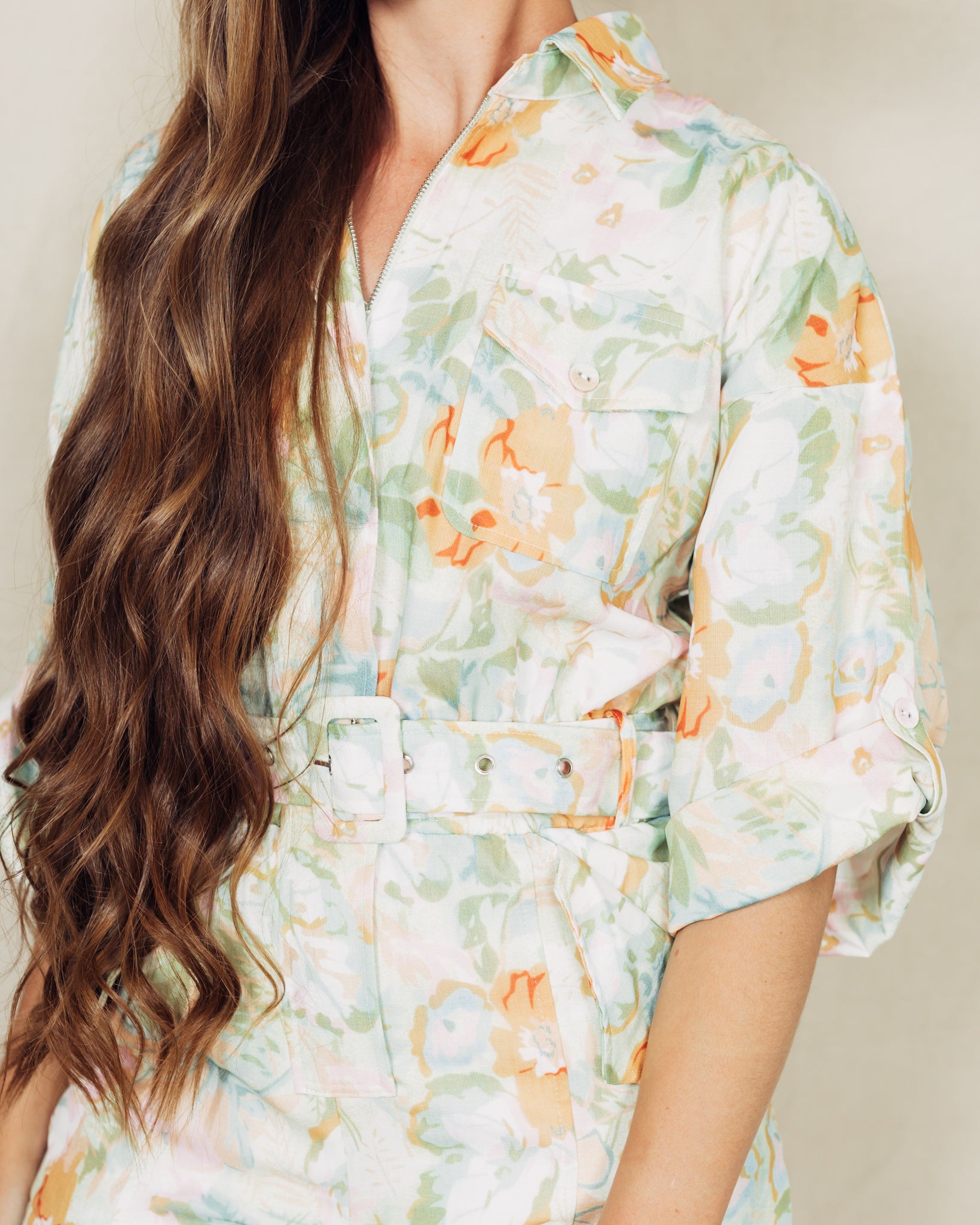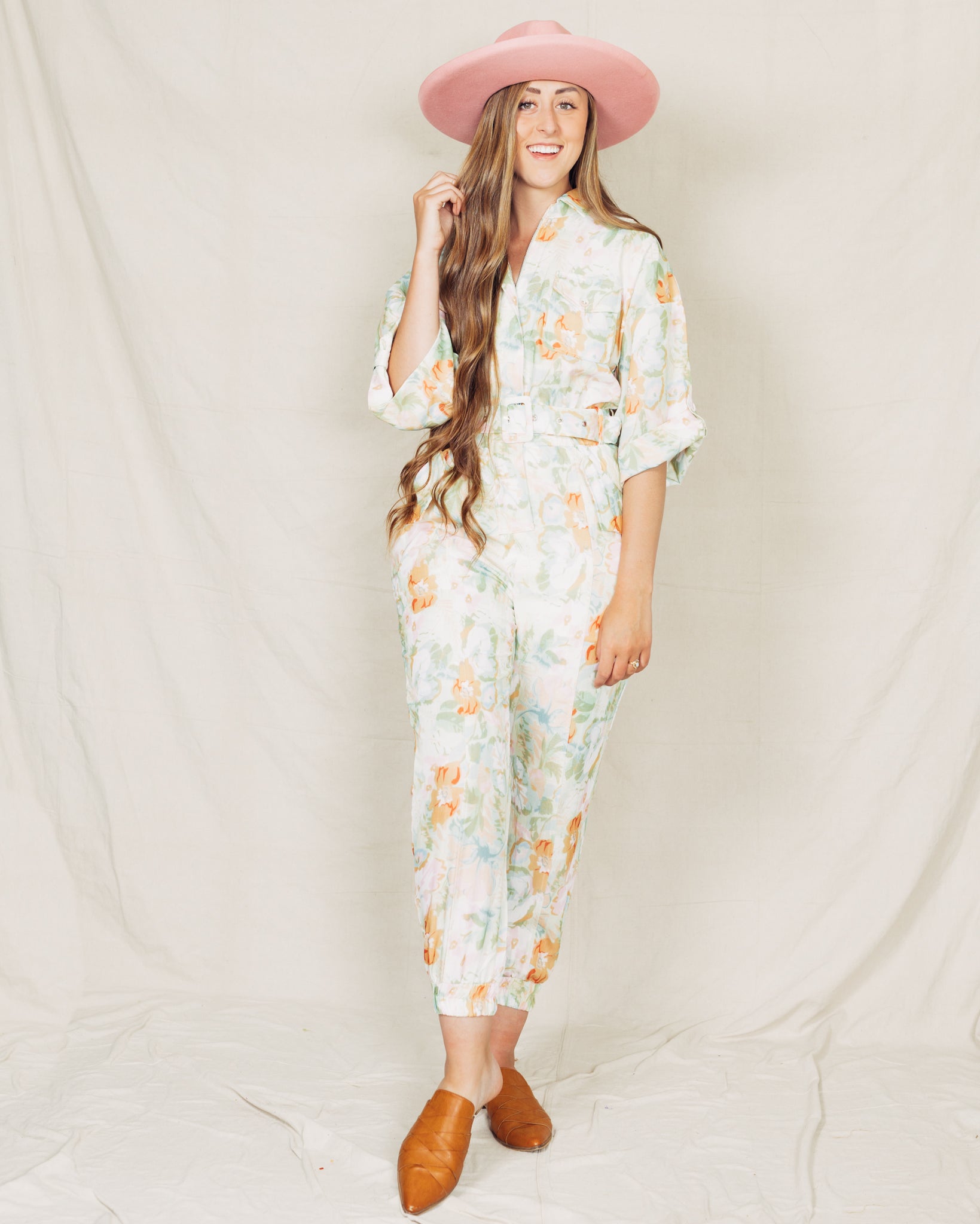 THIS ITEM IS FINAL SALE. The Dillon Jumpsuit has a zipper closure to make getting in and out super easy! The waistband has a belt that is fully adjustable. I am 5'9" and wearing a size medium. The fabric content is 100% polyester and the lining is 100% rayon.