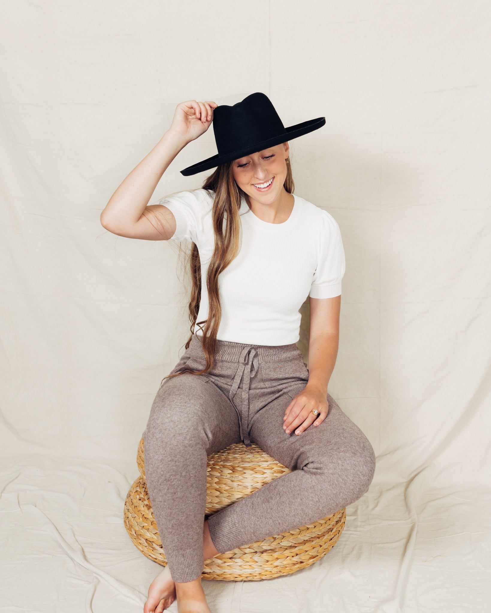 The Elena Pants are the comfiest pants you will ever own. I LOVE THEM! They have so much stretch in every single direction and the move with you. I am 5'9" and wearing a size small. The fabric content is 55% nylon and 45% viscose.
