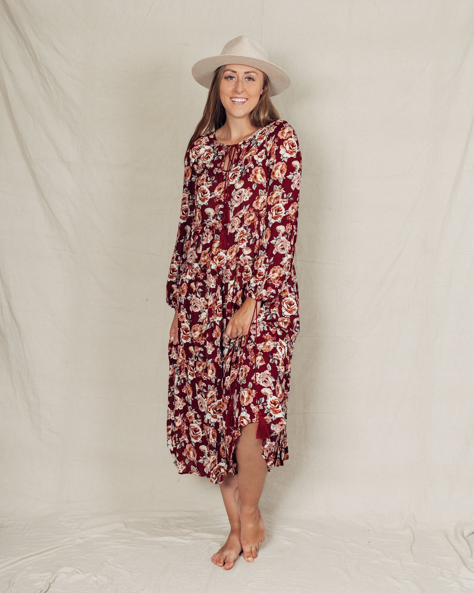 The Ella Dress is lightweight and non-sheer. The wrists have a tie on them, and the neckline has a tie at the neck, too. I am 5'9" and wearing a size small. The fabric content is 100% rayon.