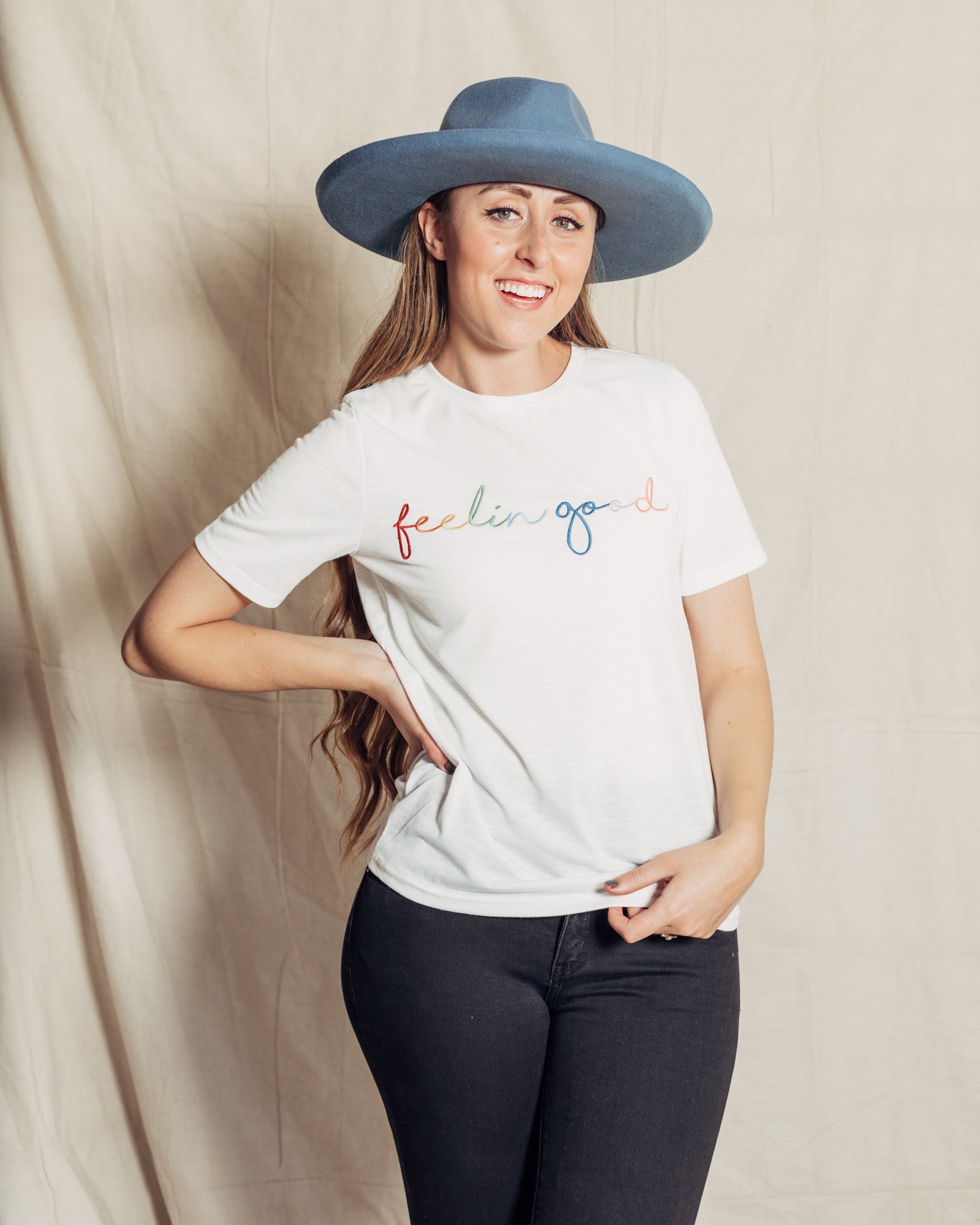 The Feeling Good Tee is soft and stretchy!!! It's the cutest tee to pair with pants or even a skirt. I am 5'9" and wearing a size small. The fabric content is 95% polyester and 5% spandex.