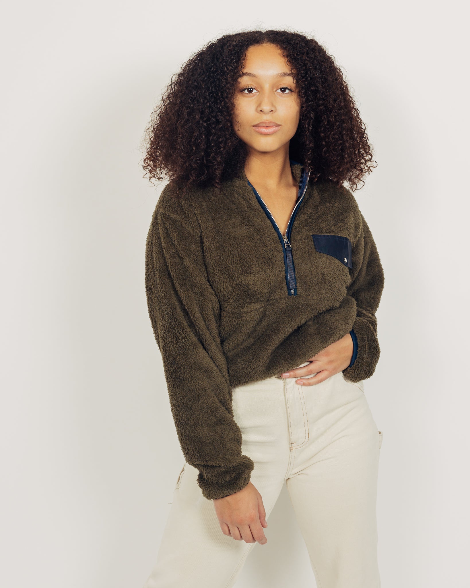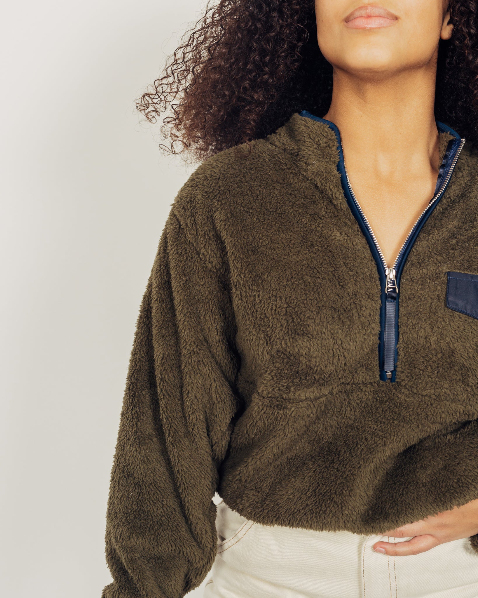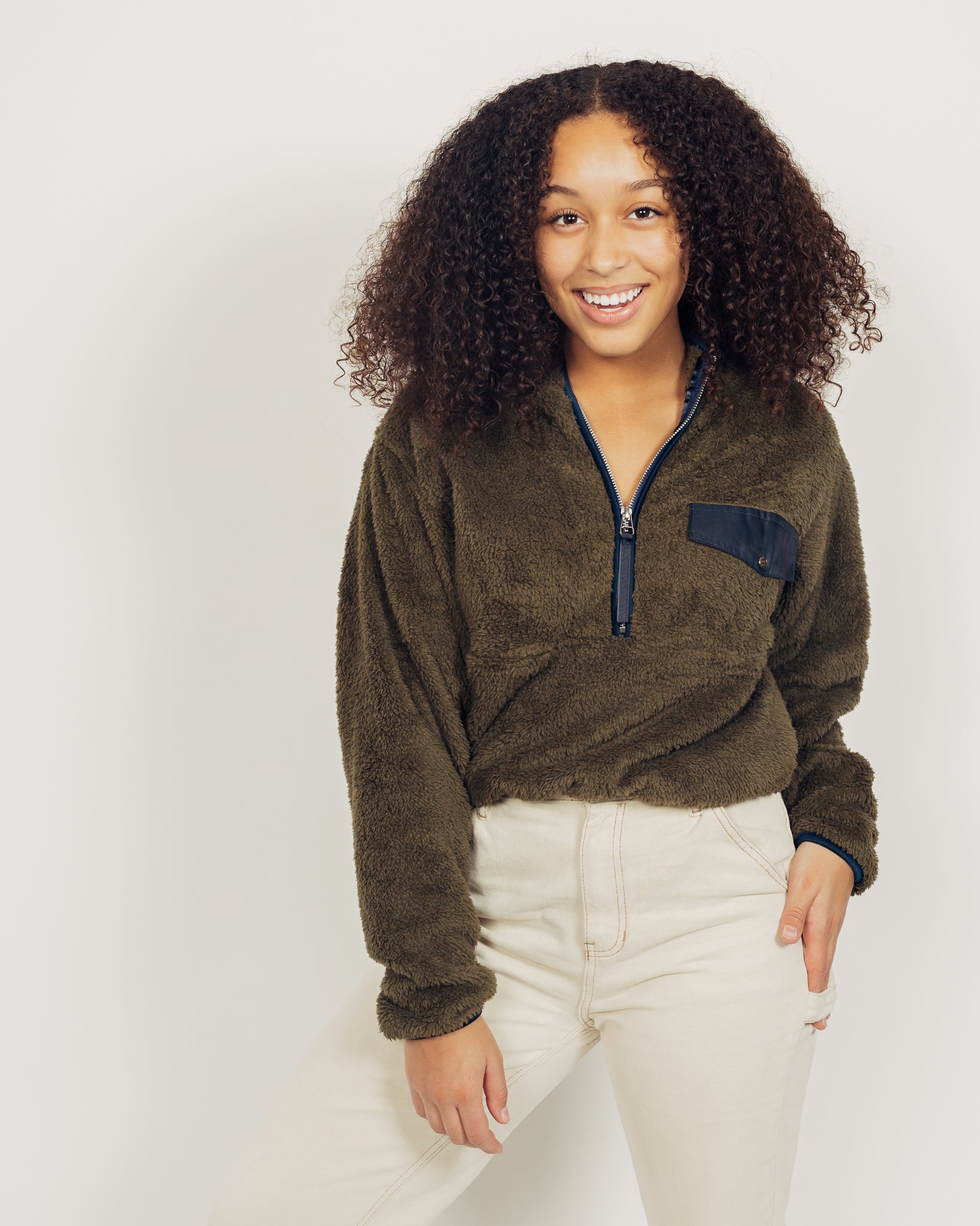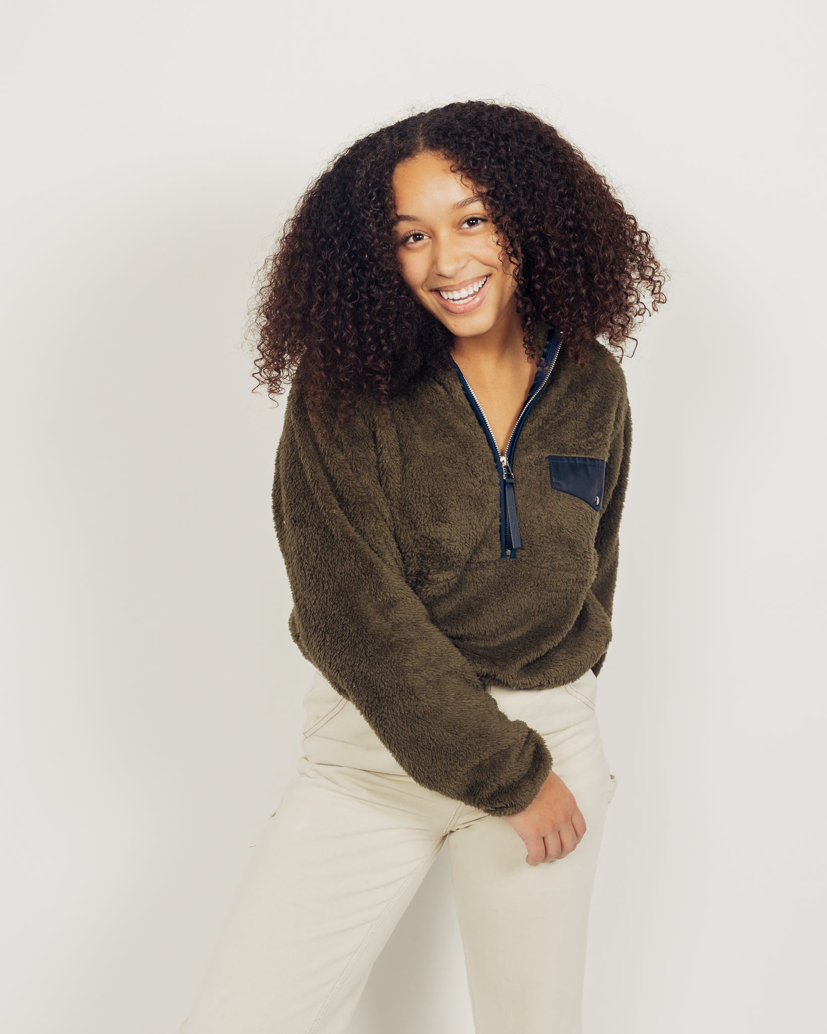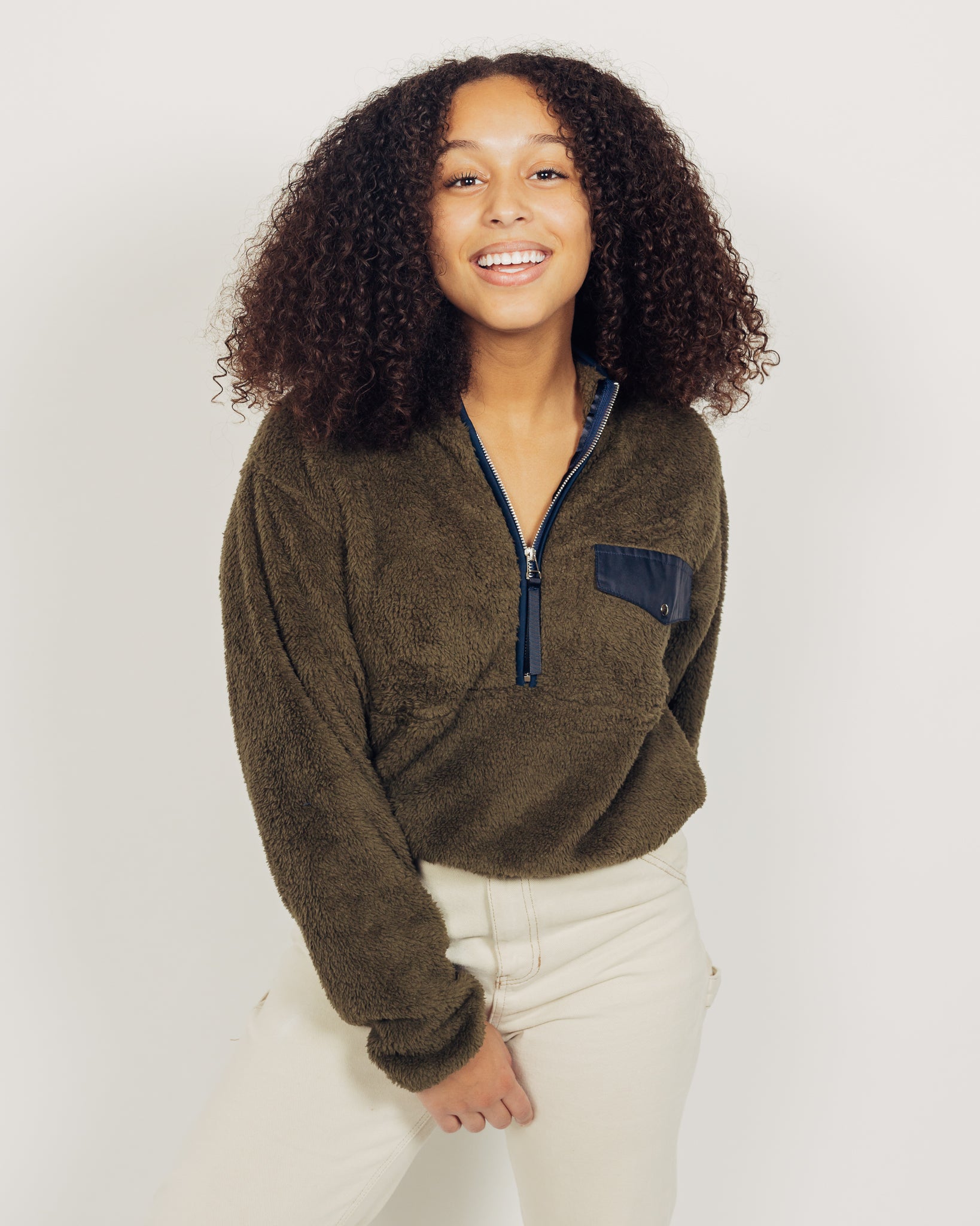 The Harlie Pullover is so soft and cozy! It has pockets and a functional zipper in the front. Model is wearing a size small, and the fabric is 100% polyester.