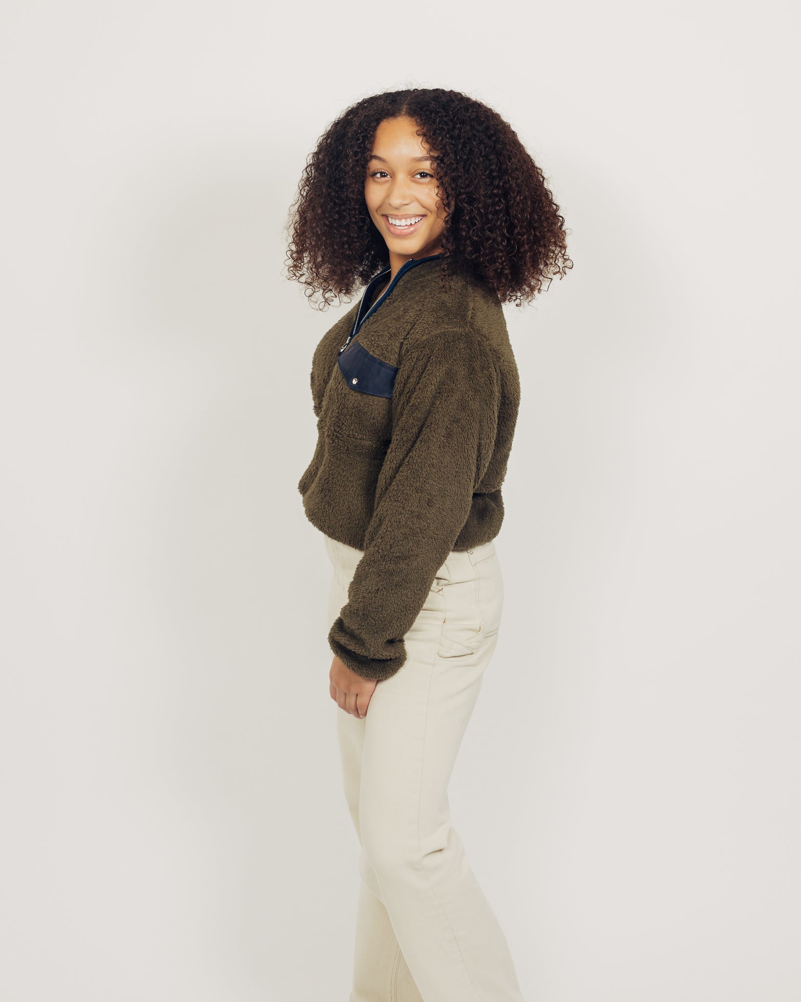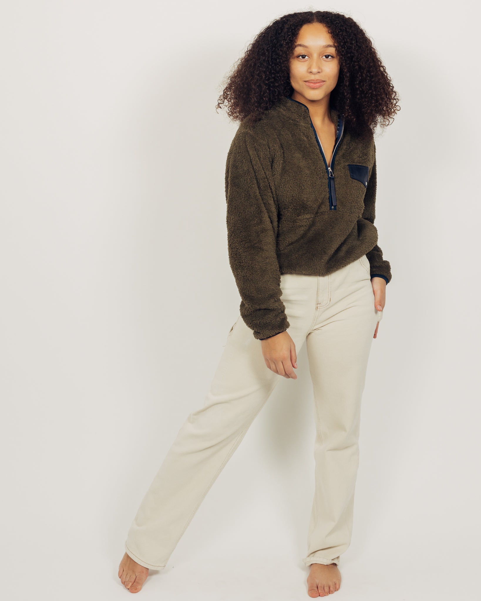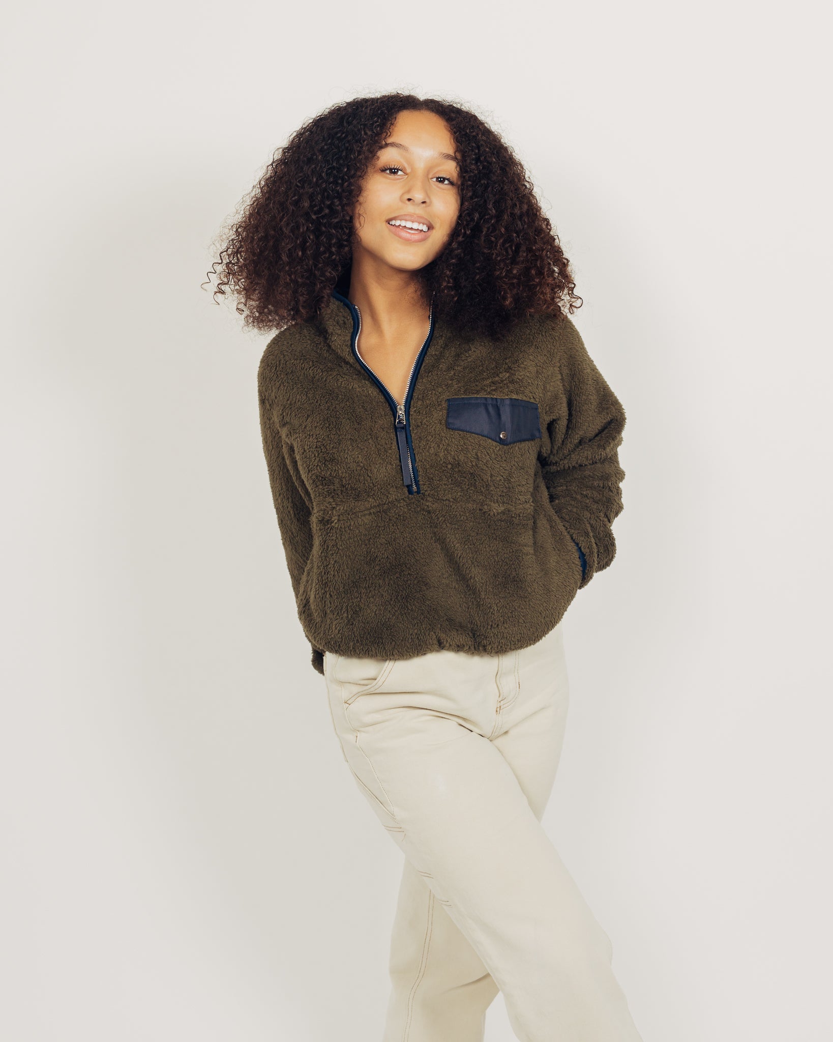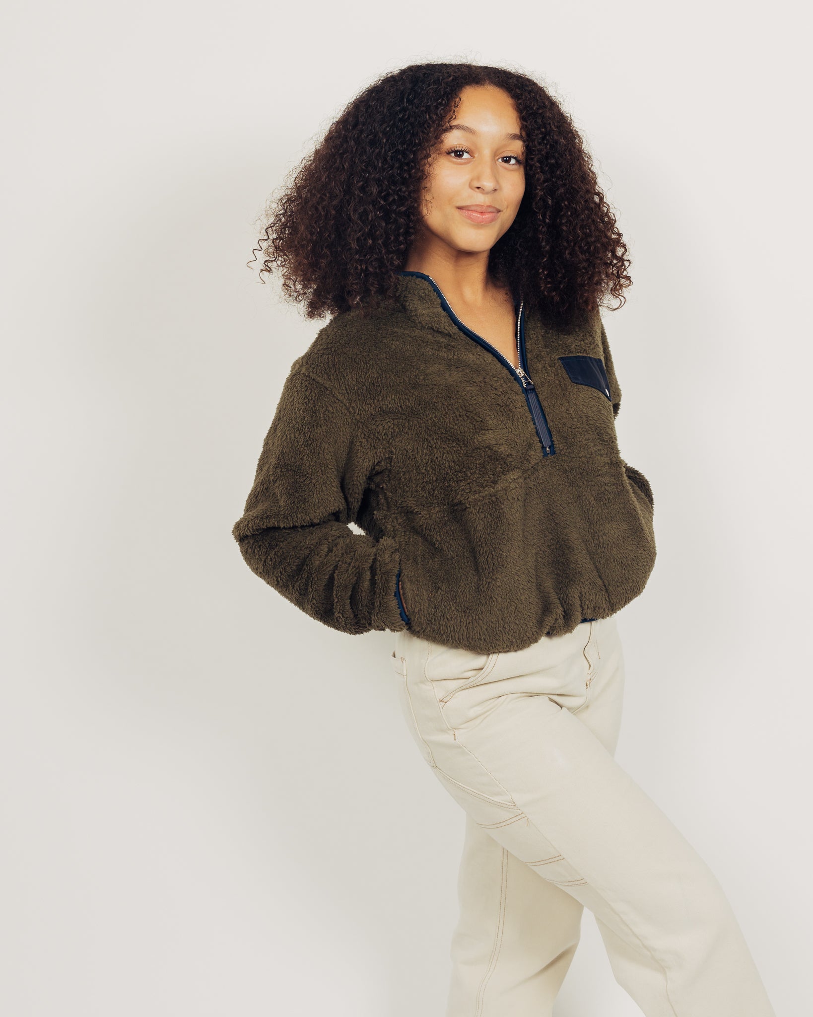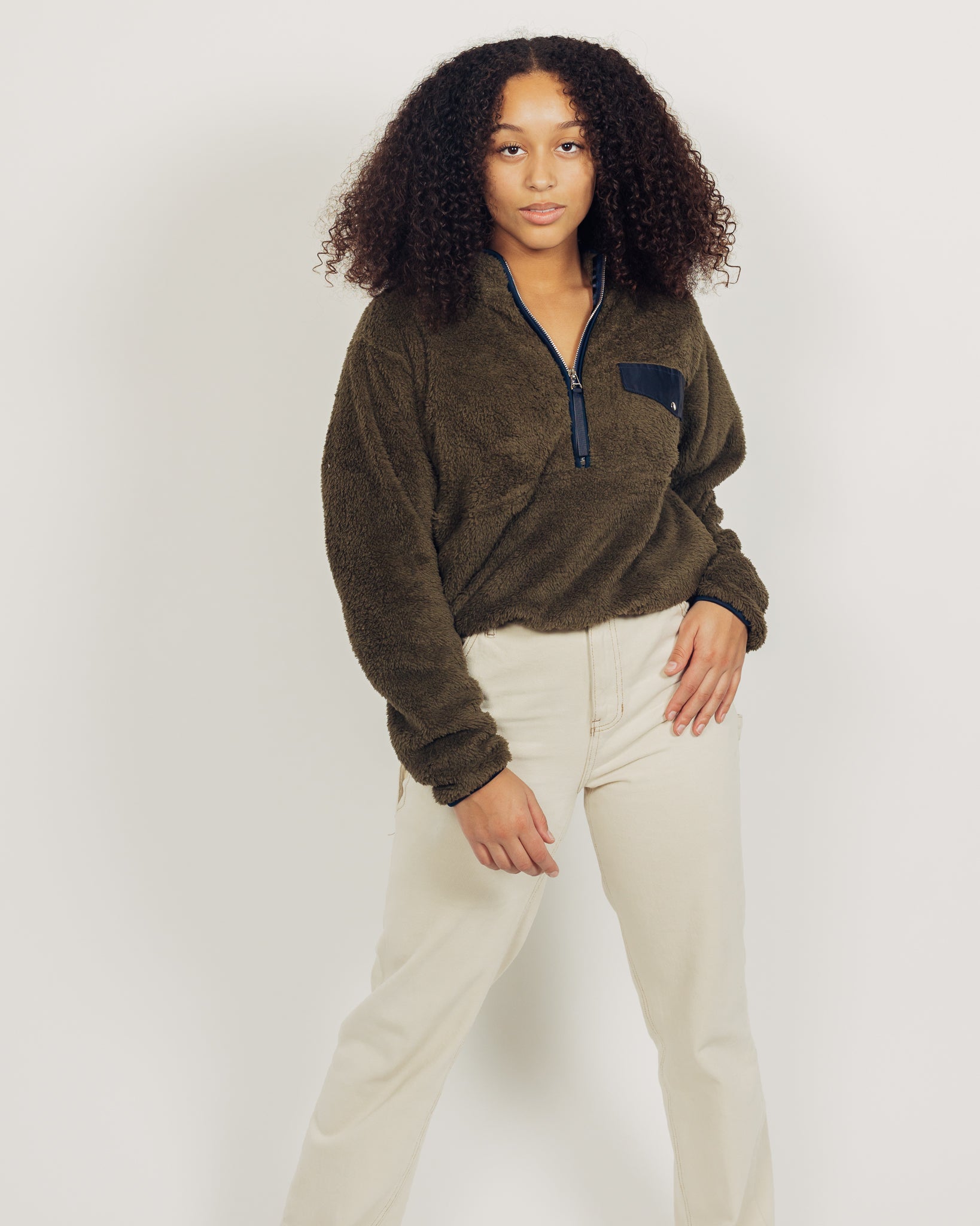 The Harlie Pullover is so soft and cozy! It has pockets and a functional zipper in the front. Model is wearing a size small, and the fabric is 100% polyester.