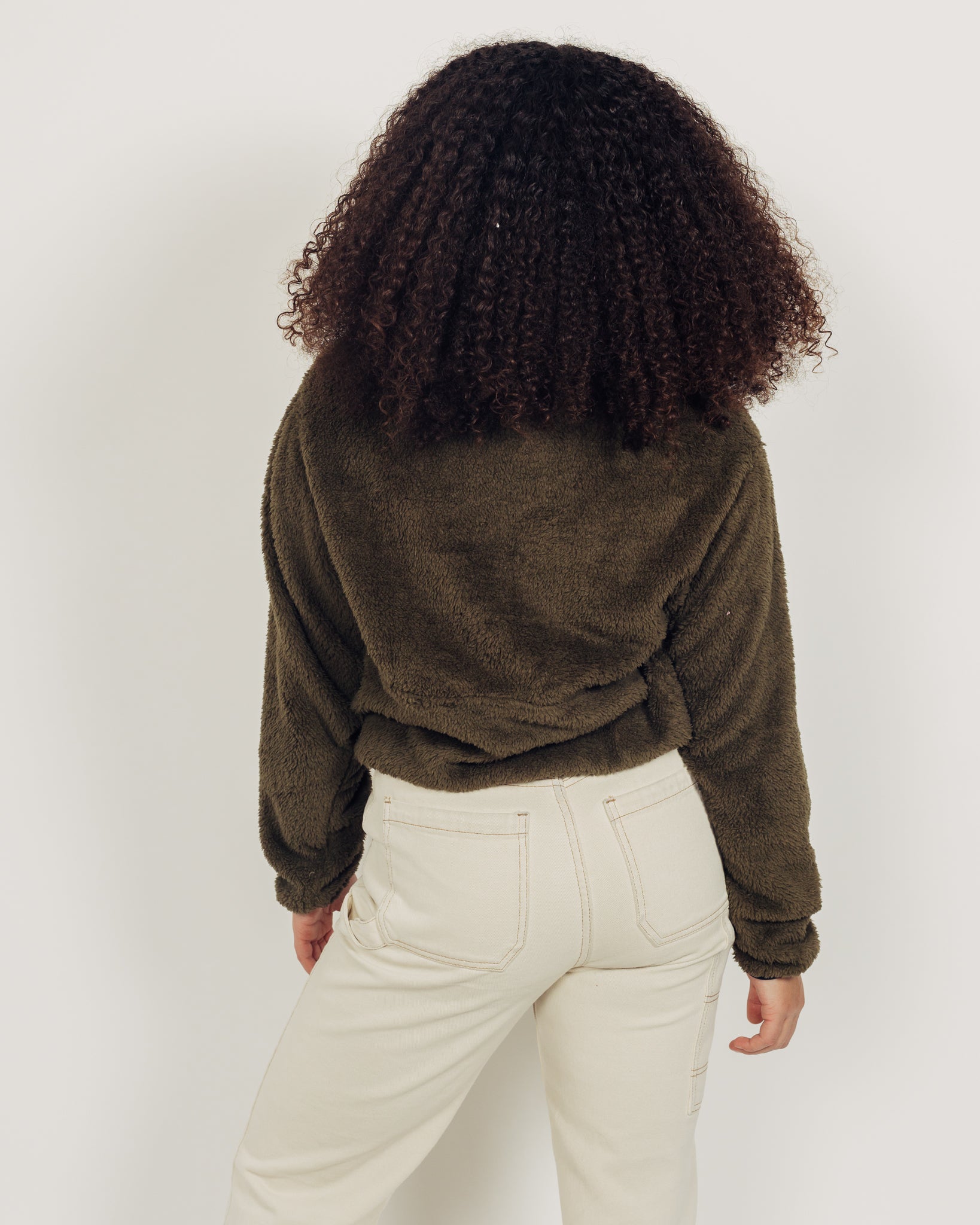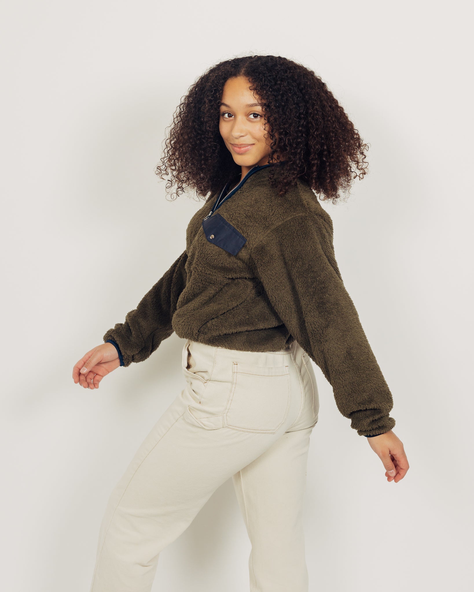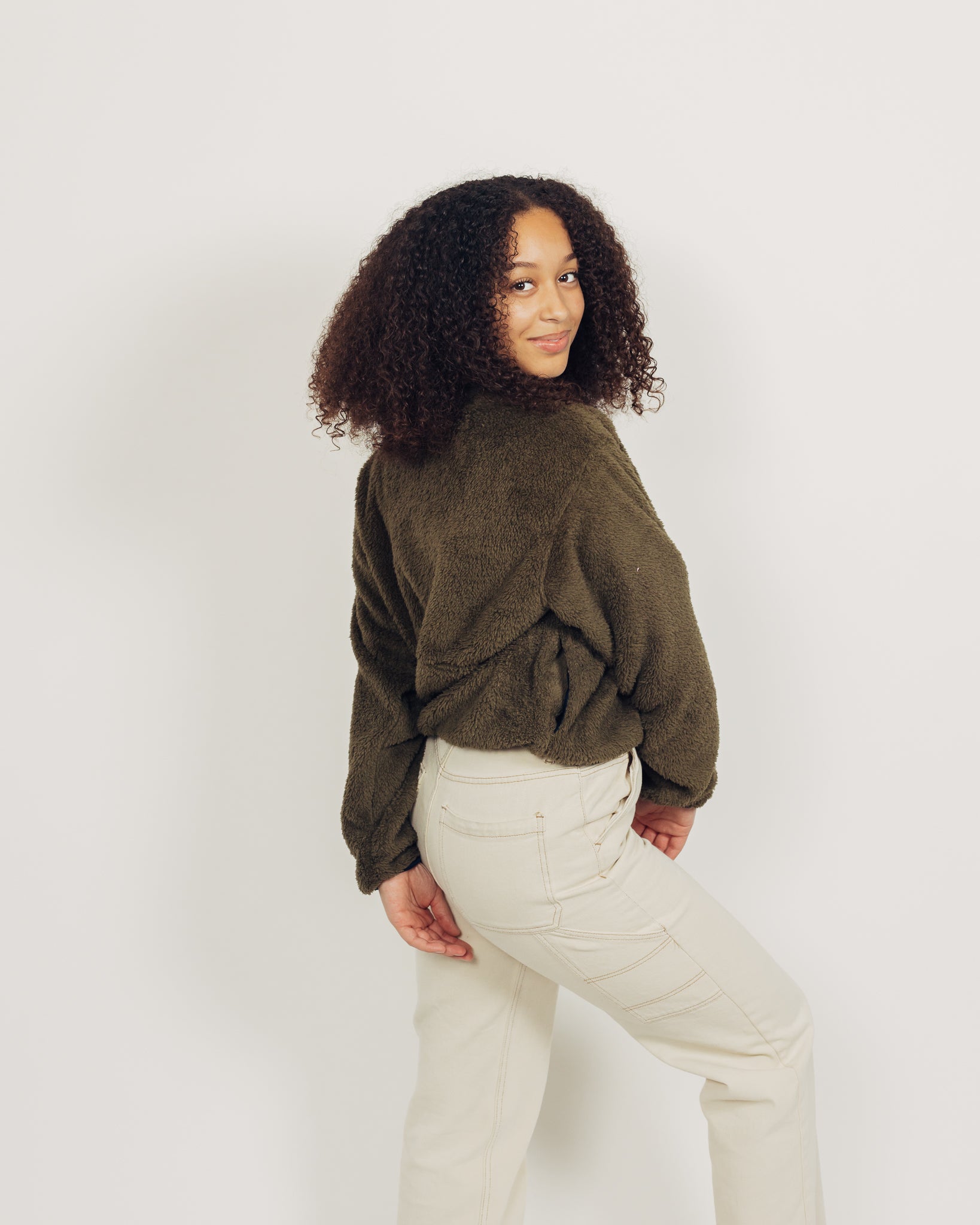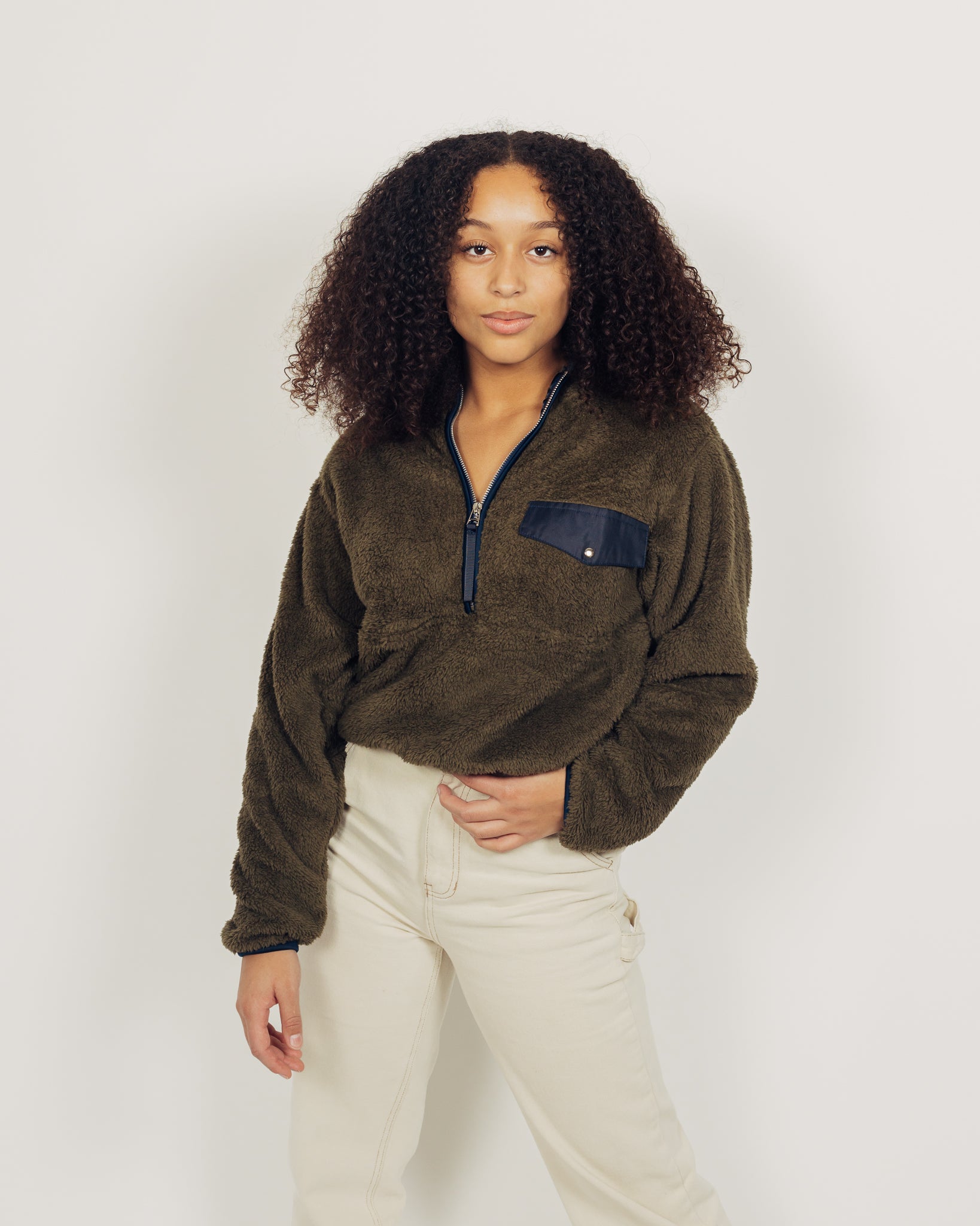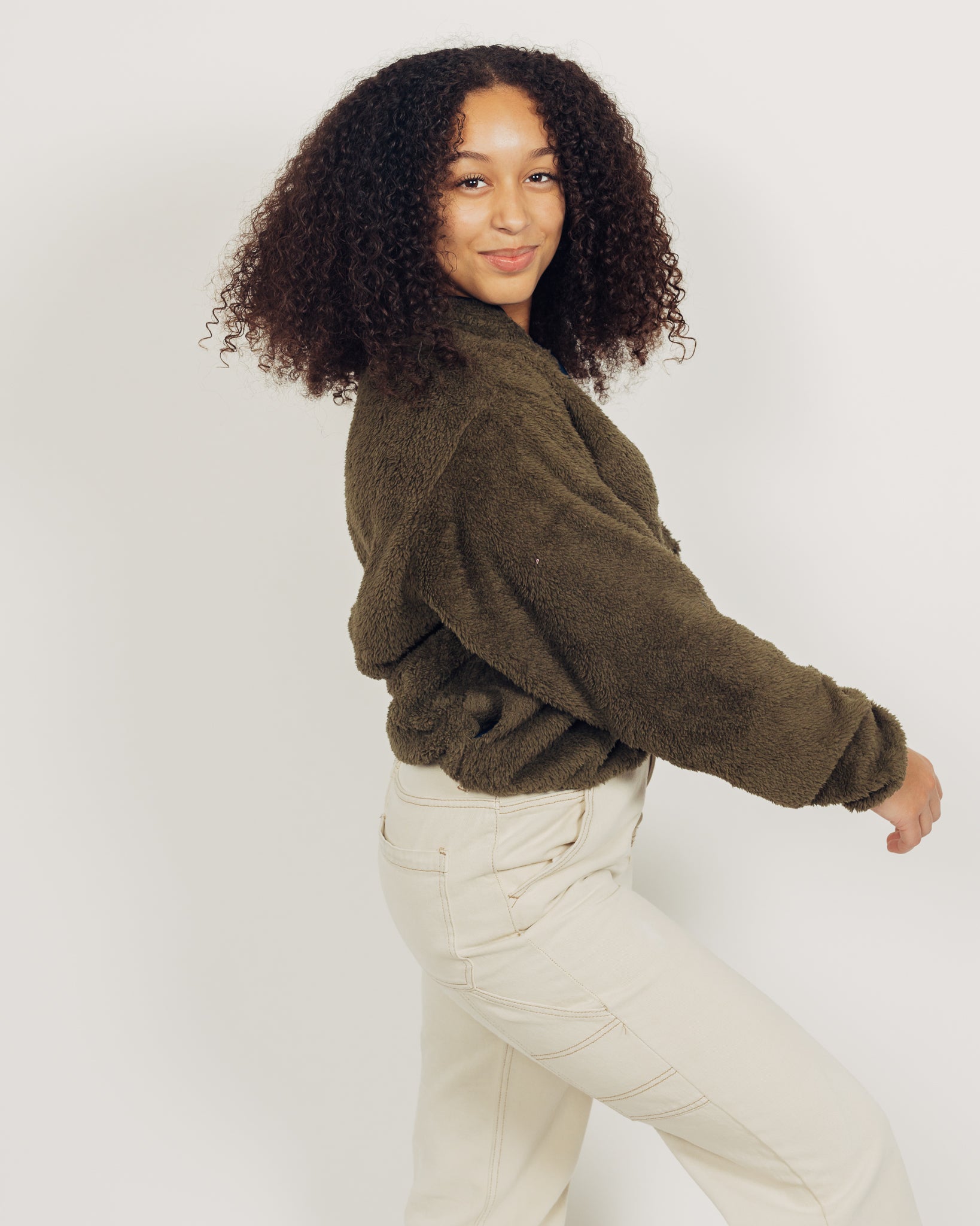 The Harlie Pullover is so soft and cozy! It has pockets and a functional zipper in the front. Model is wearing a size small, and the fabric is 100% polyester.