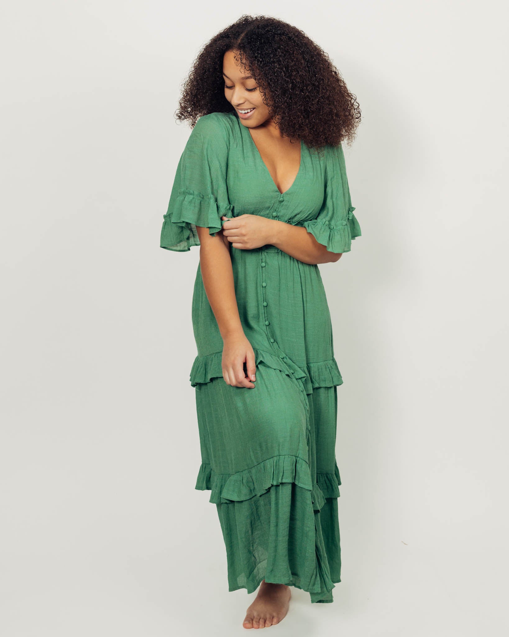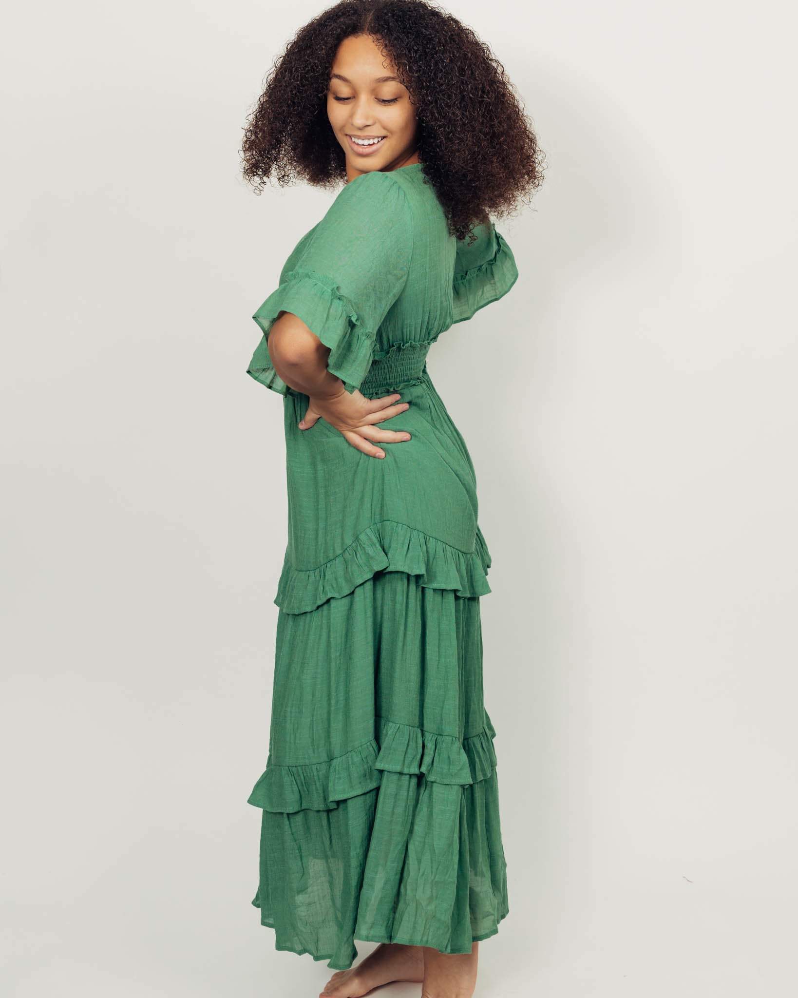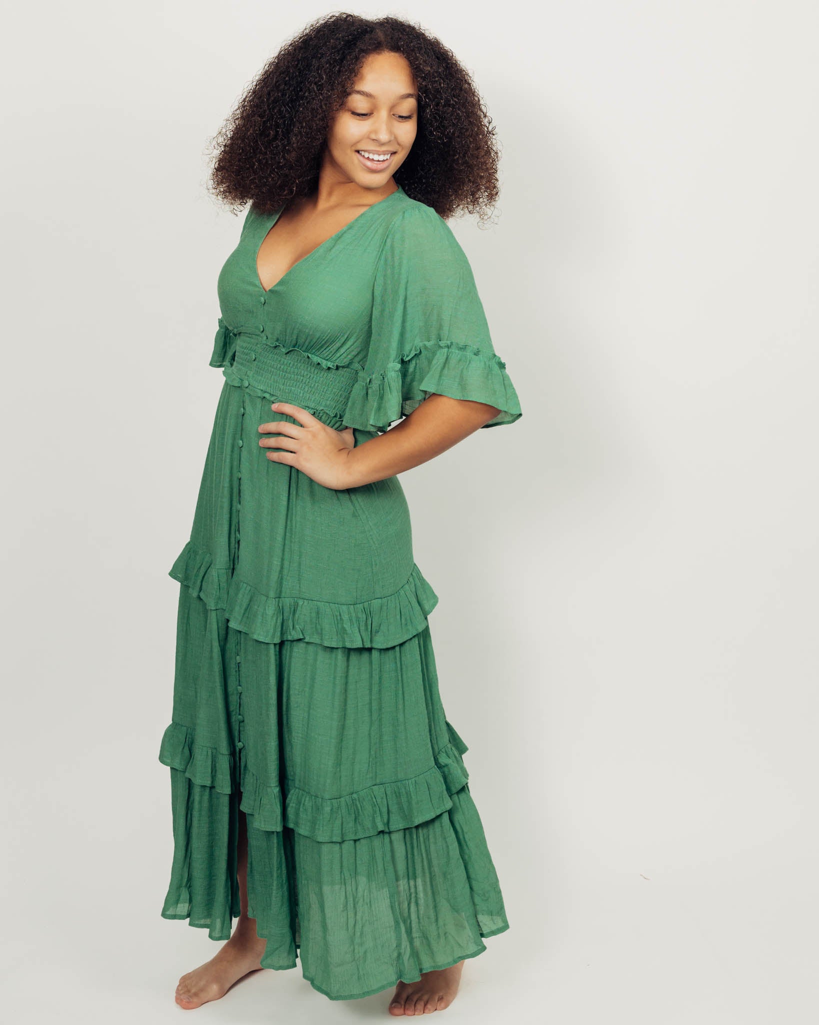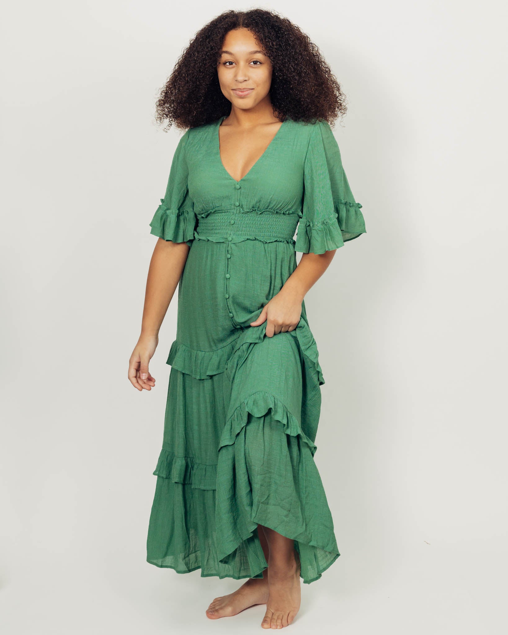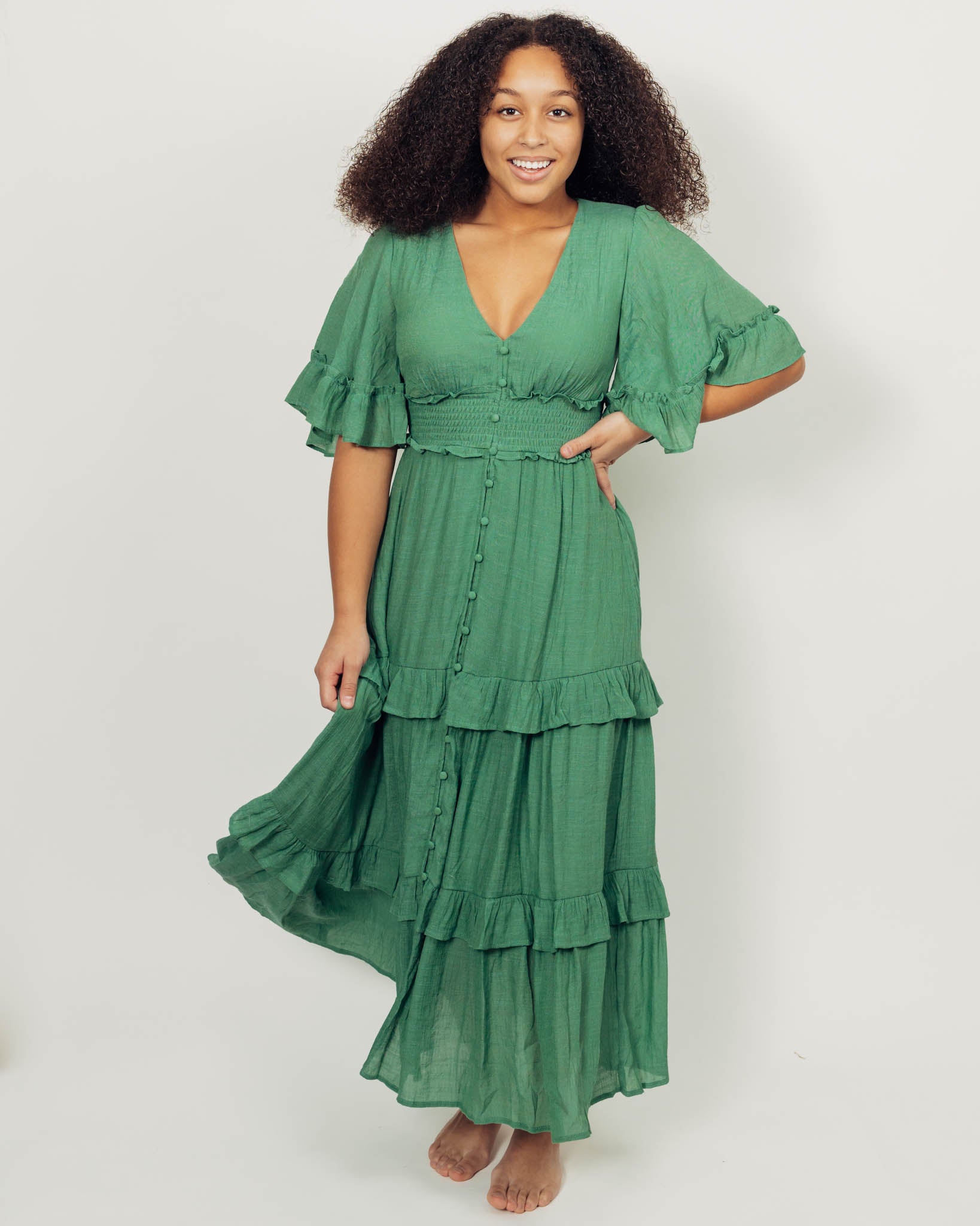 The Harlow Dress is so pretty! This waist is smocked, and it features flutter sleeves. The buttons on the bust are not functional, but the buttons below the waist are. Model is wearing size small. Fabric content is 65% polyester, 35% rayon, and the lining is 1005 polyester.