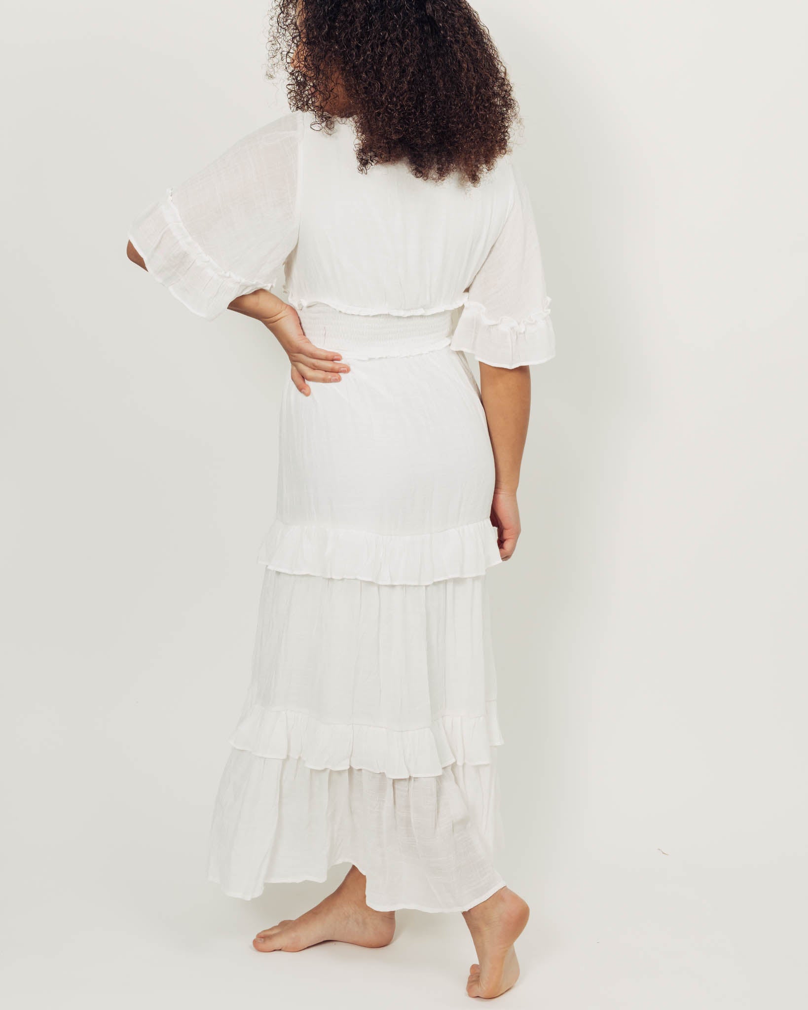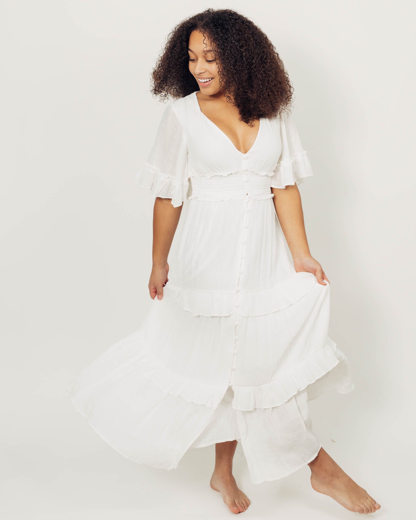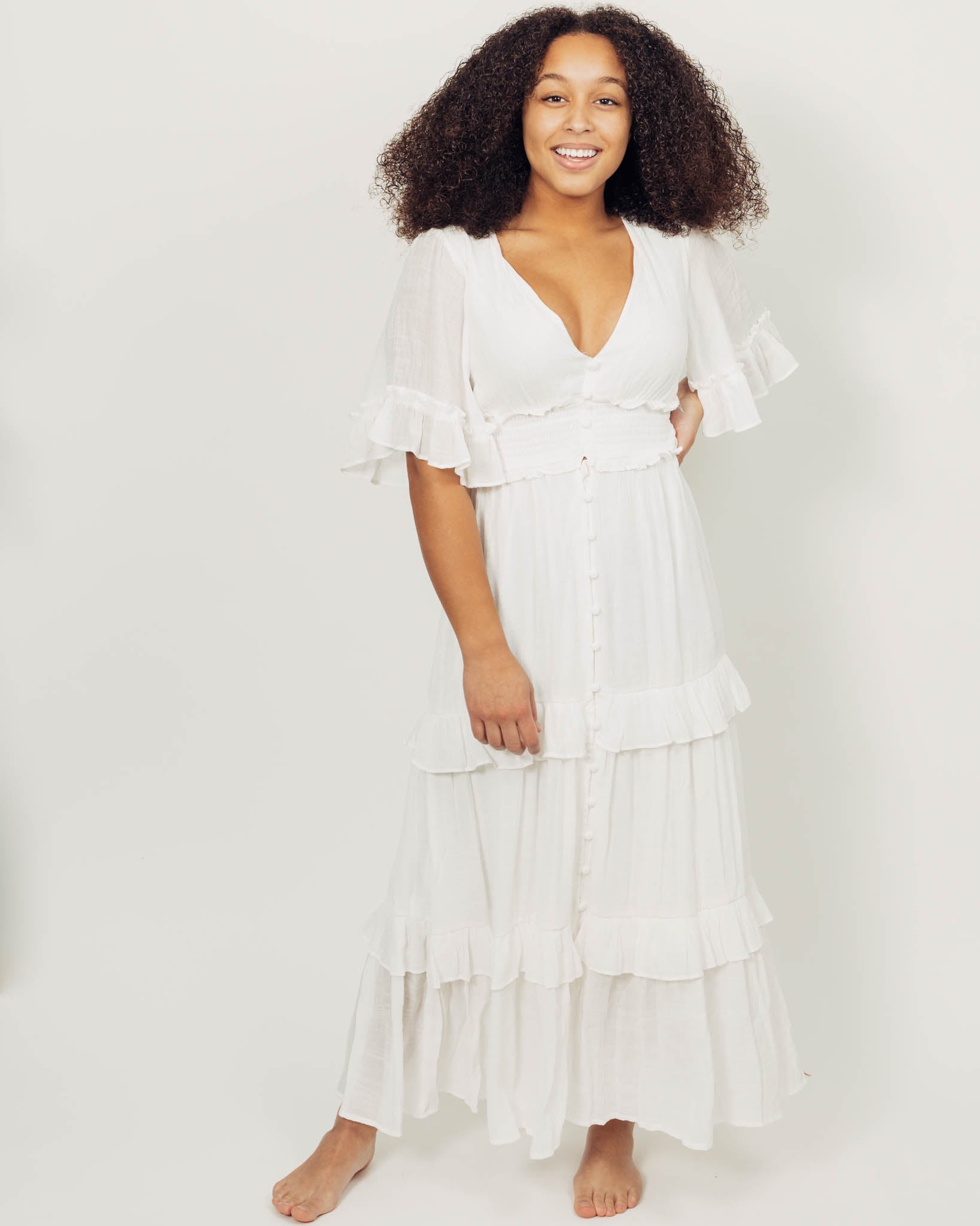 The Harlow Dress is so pretty! This waist is smocked, and it features flutter sleeves. The buttons on the bust are not functional, but the buttons below the waist are. Model is wearing size small. Fabric content is 65% polyester, 35% rayon, and the lining is 1005 polyester.