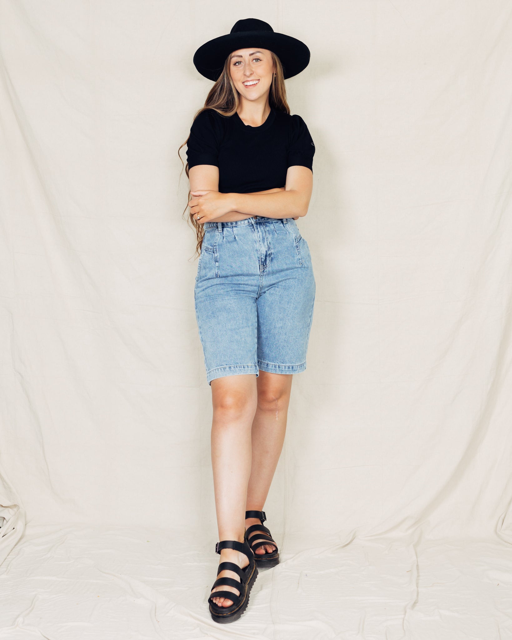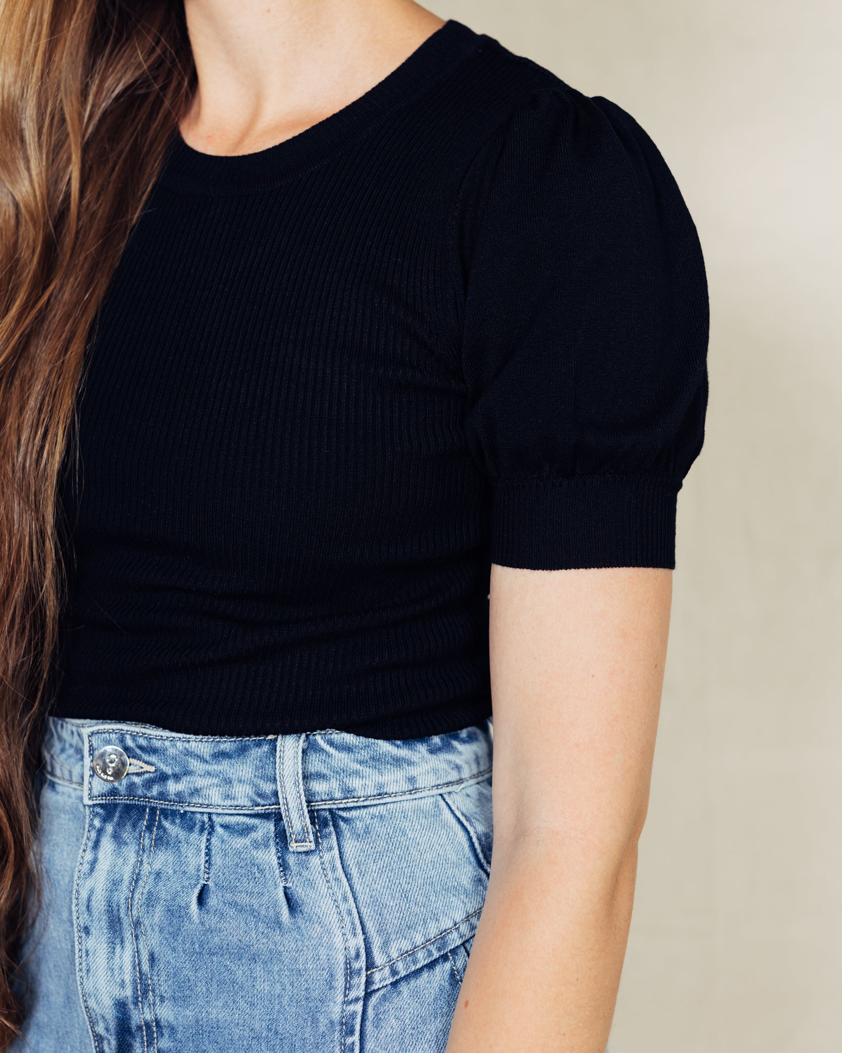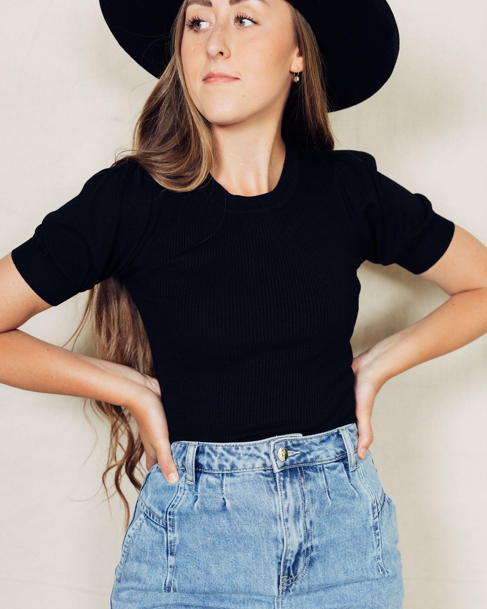 The Hazel Top is the perfect staple for your closet. It's ribbed and stretchy, and perfect to layer or not. It is more of a light sweater. I am 5'9" and wearing a size small. The fabric content is 80% rayon and 20% nylon.