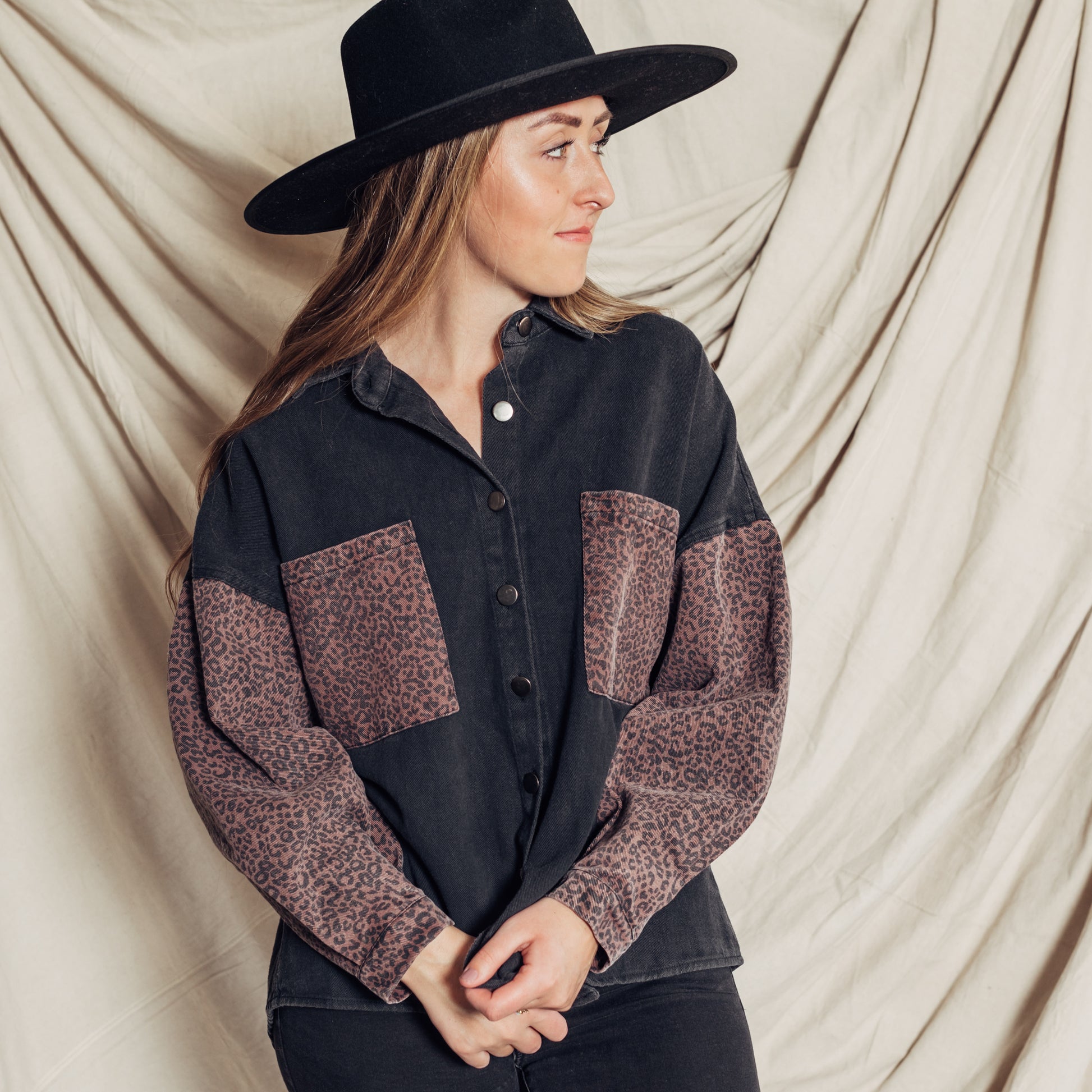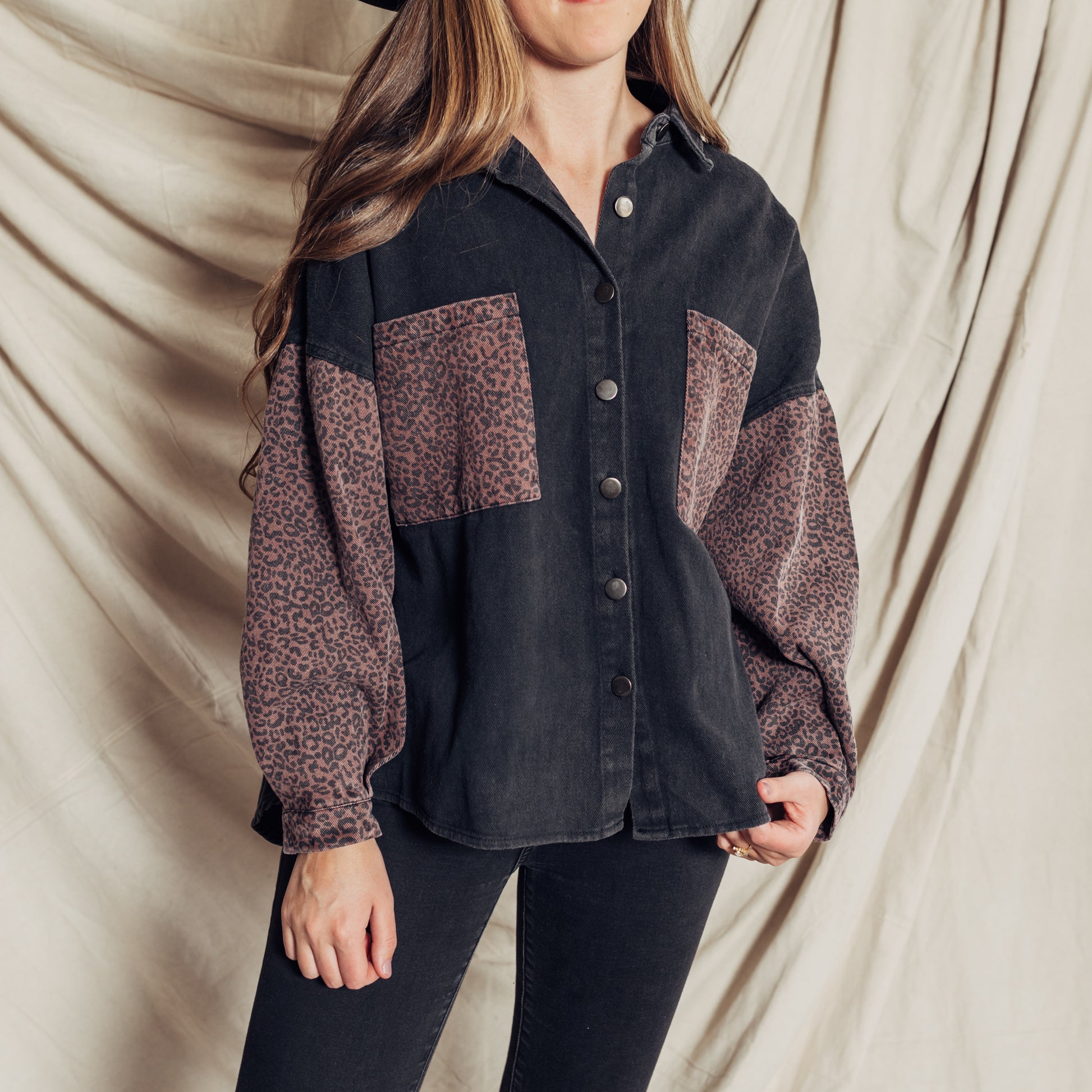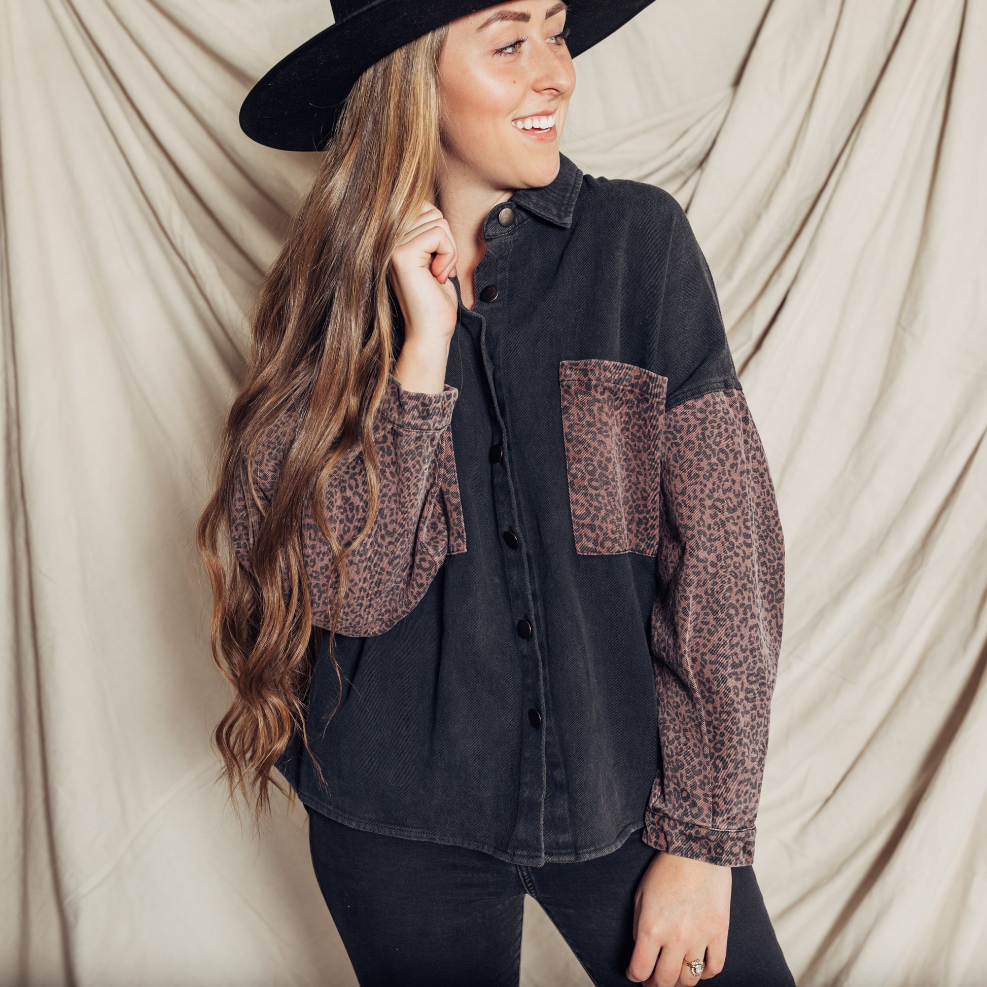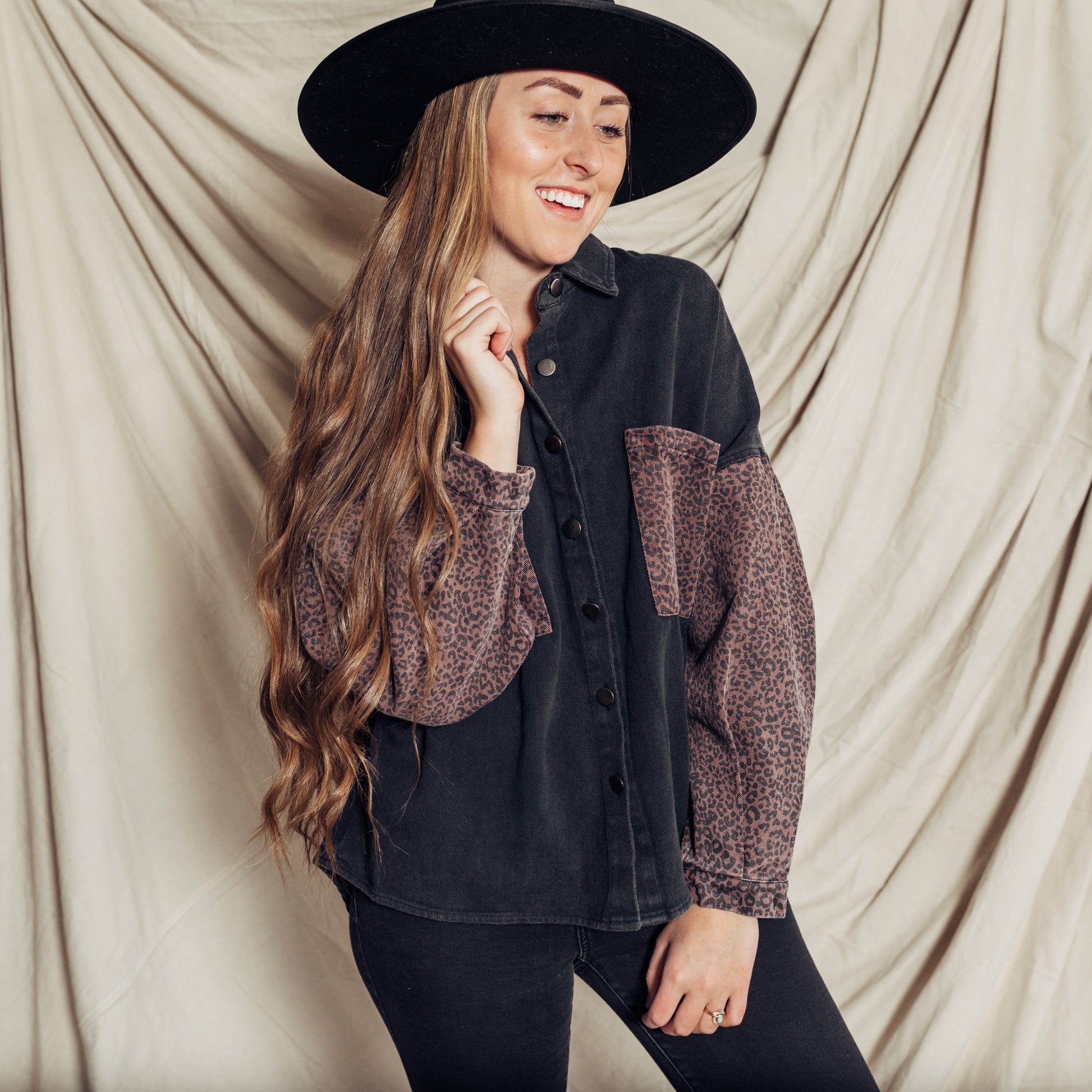 The Leopard Shacket is one of my favorite things that the shop has ever had. It is a black denim jacket with leopard sleeves and leopard pockets. It has functional buttons, and it's also not stiff. Some denim jackets are pretty stiff, but this one is not. I am 5'9" and wearing a size small. It can be worn as a shirt or a jacket. The fabric content is 100% cotton.