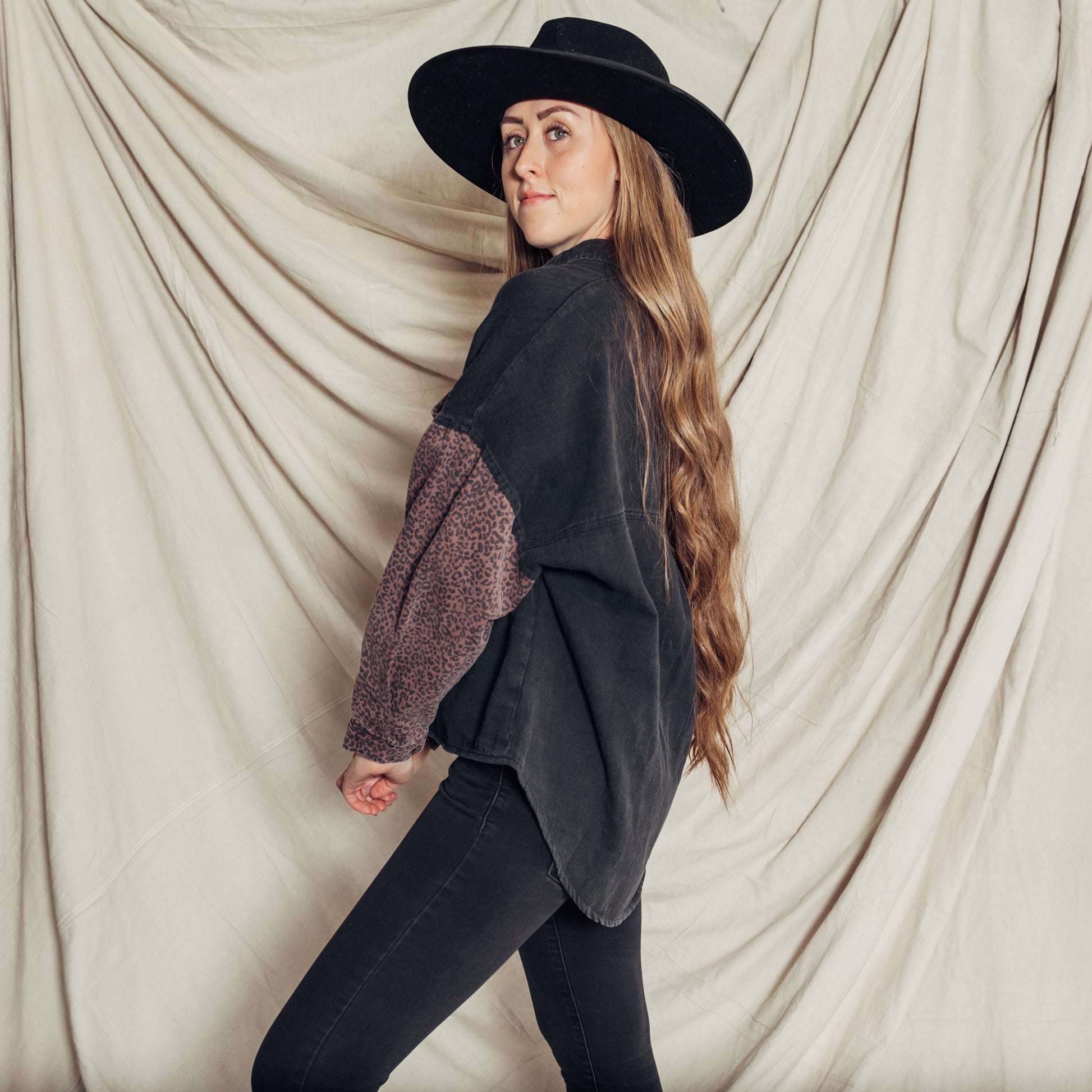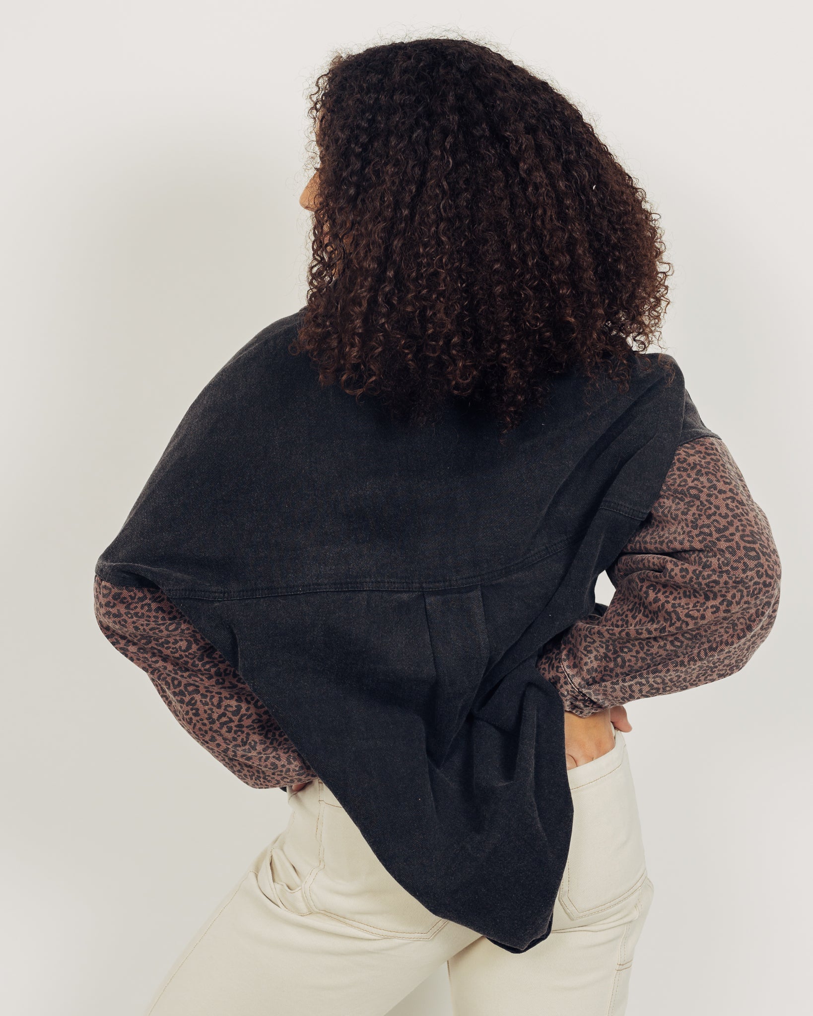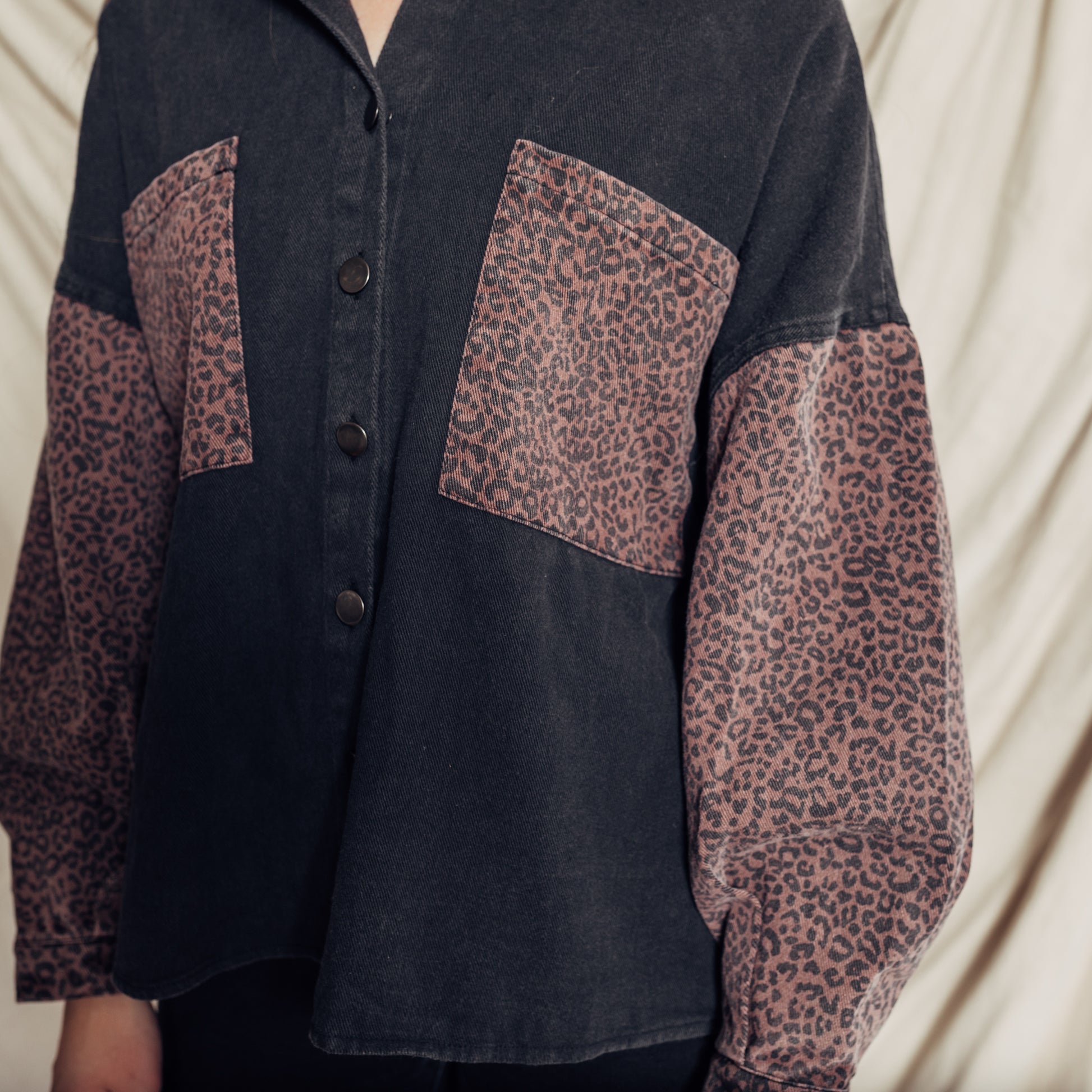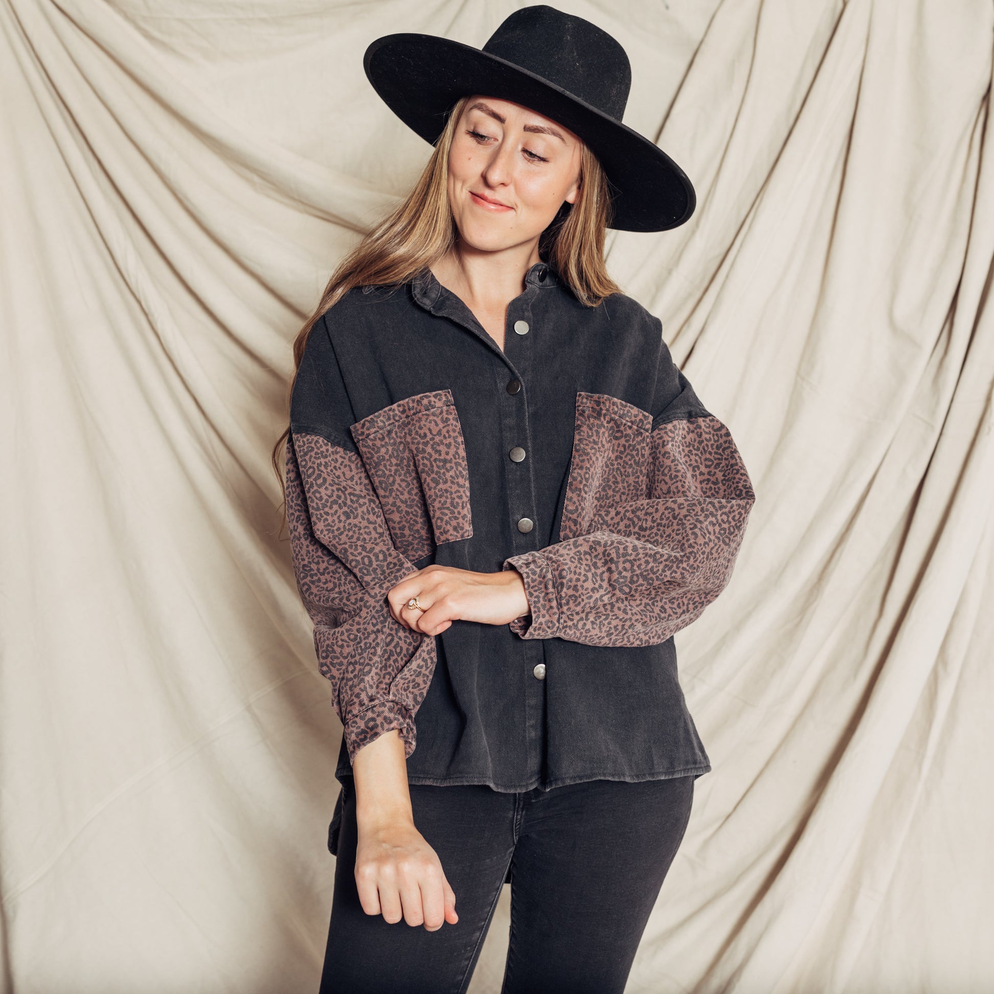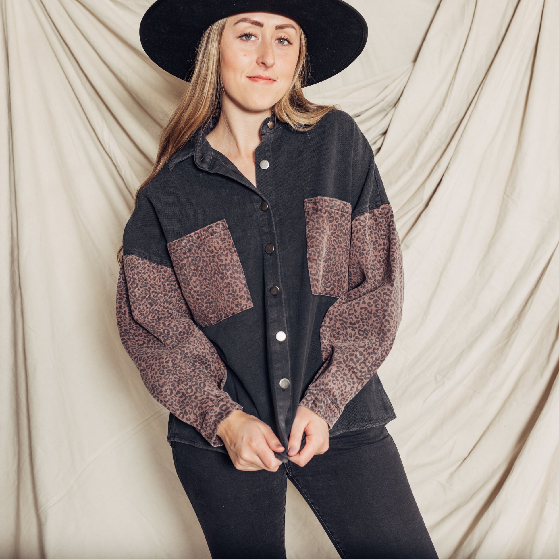 The Leopard Shacket is one of my favorite things that the shop has ever had. It is a black denim jacket with leopard sleeves and leopard pockets. It has functional buttons, and it's also not stiff. Some denim jackets are pretty stiff, but this one is not. I am 5'9" and wearing a size small. It can be worn as a shirt or a jacket. The fabric content is 100% cotton.