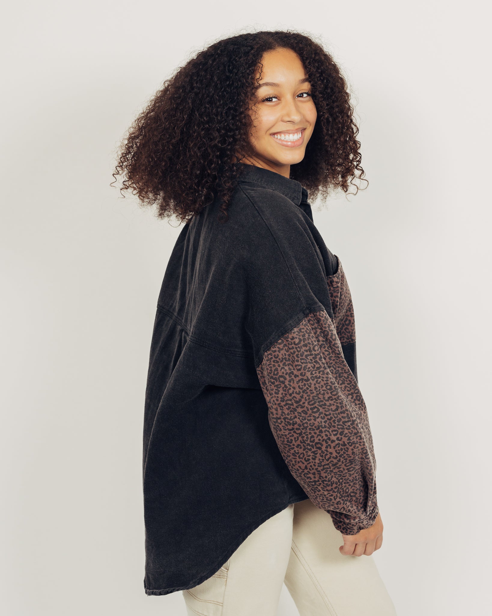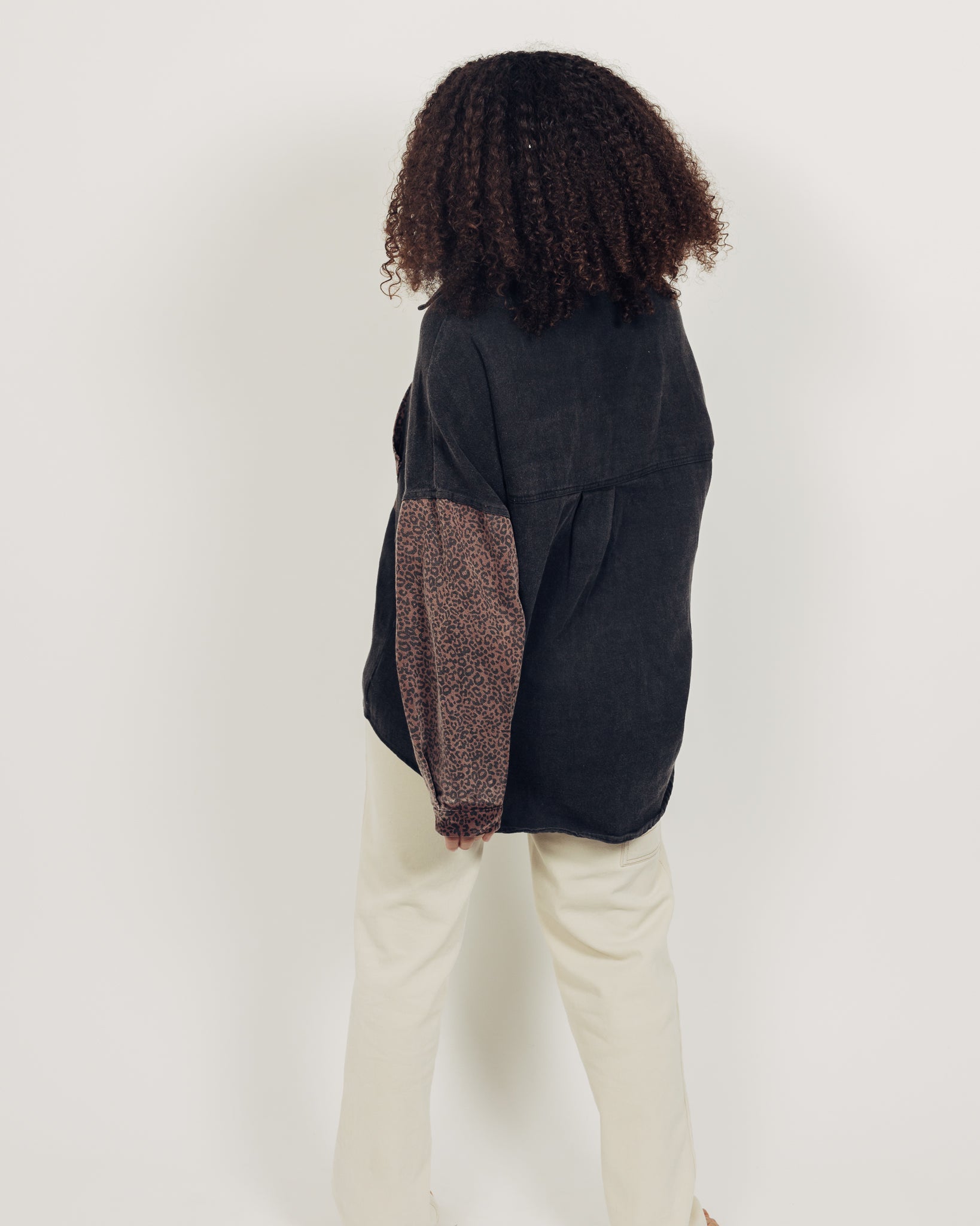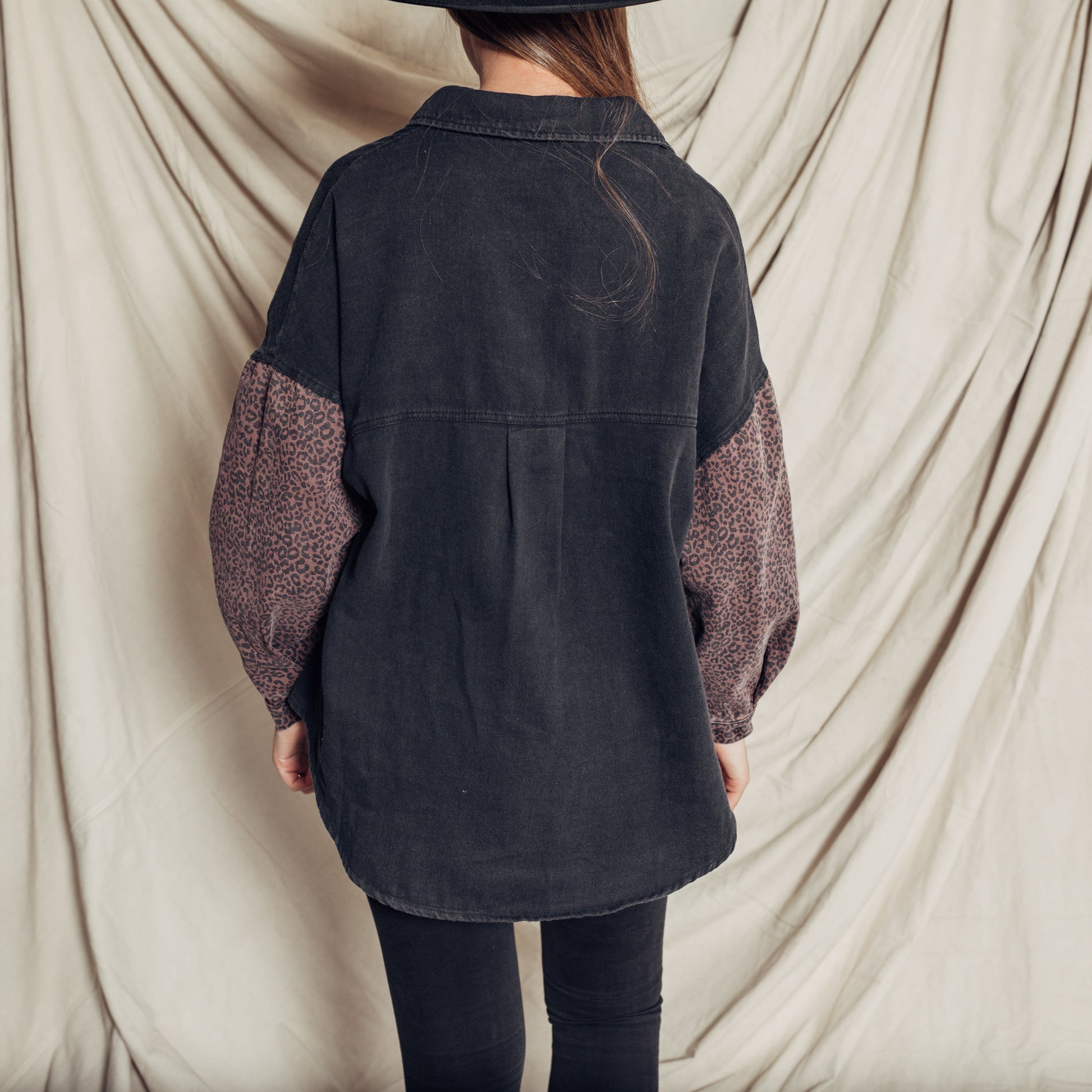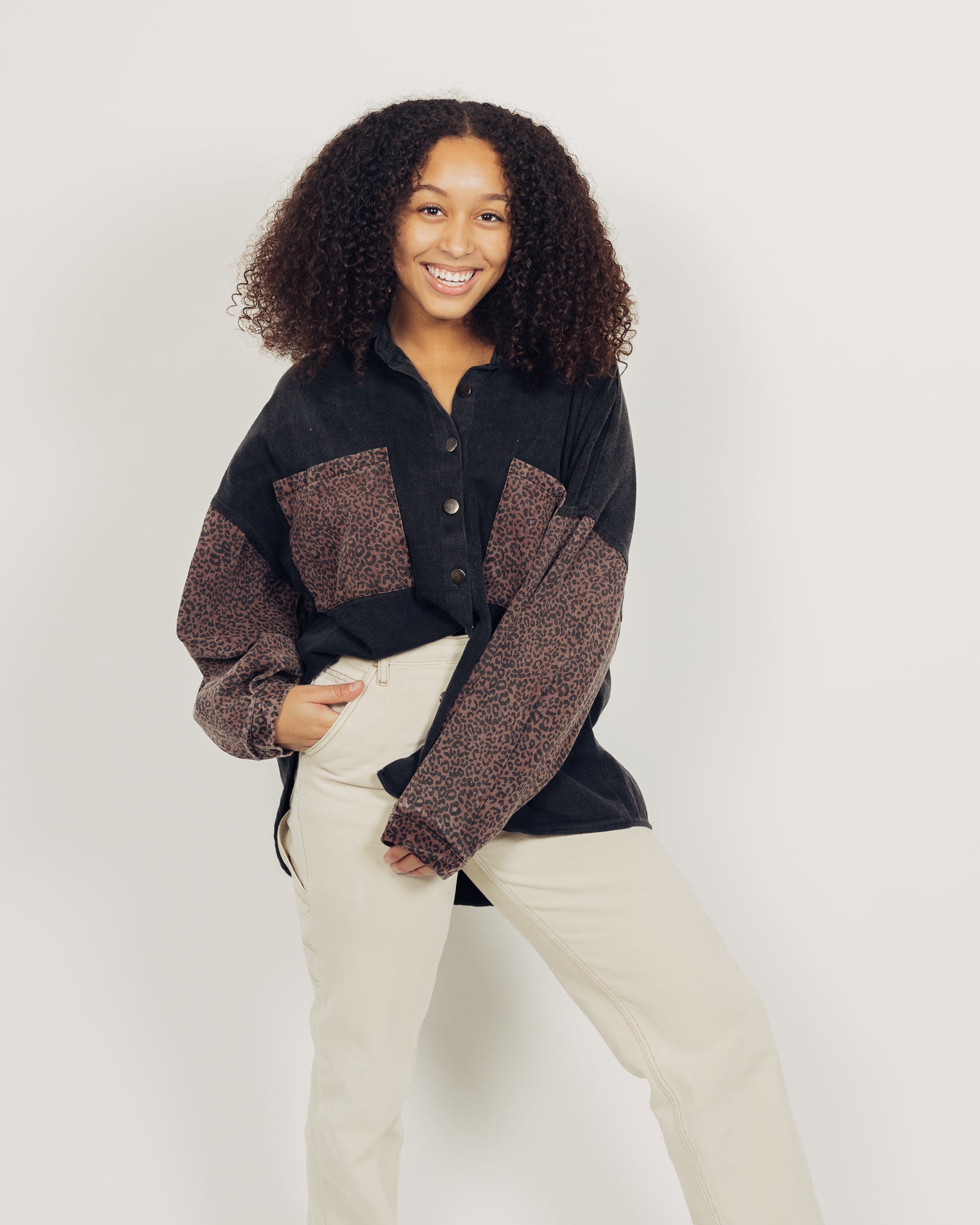 The Leopard Shacket is one of my favorite things that the shop has ever had. It is a black denim jacket with leopard sleeves and leopard pockets. It has functional buttons, and it's also not stiff. Some denim jackets are pretty stiff, but this one is not. I am 5'9" and wearing a size small. It can be worn as a shirt or a jacket. The fabric content is 100% cotton.