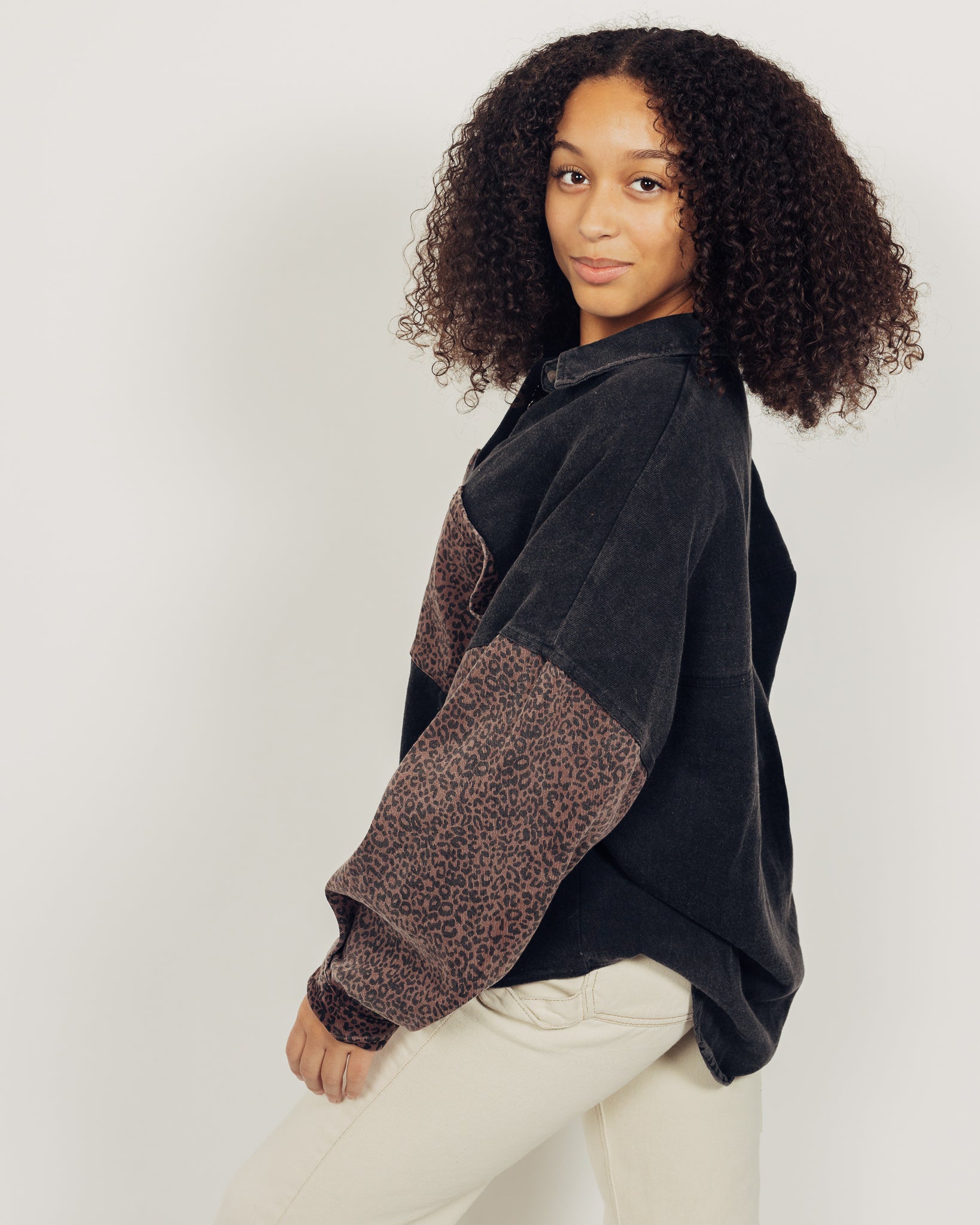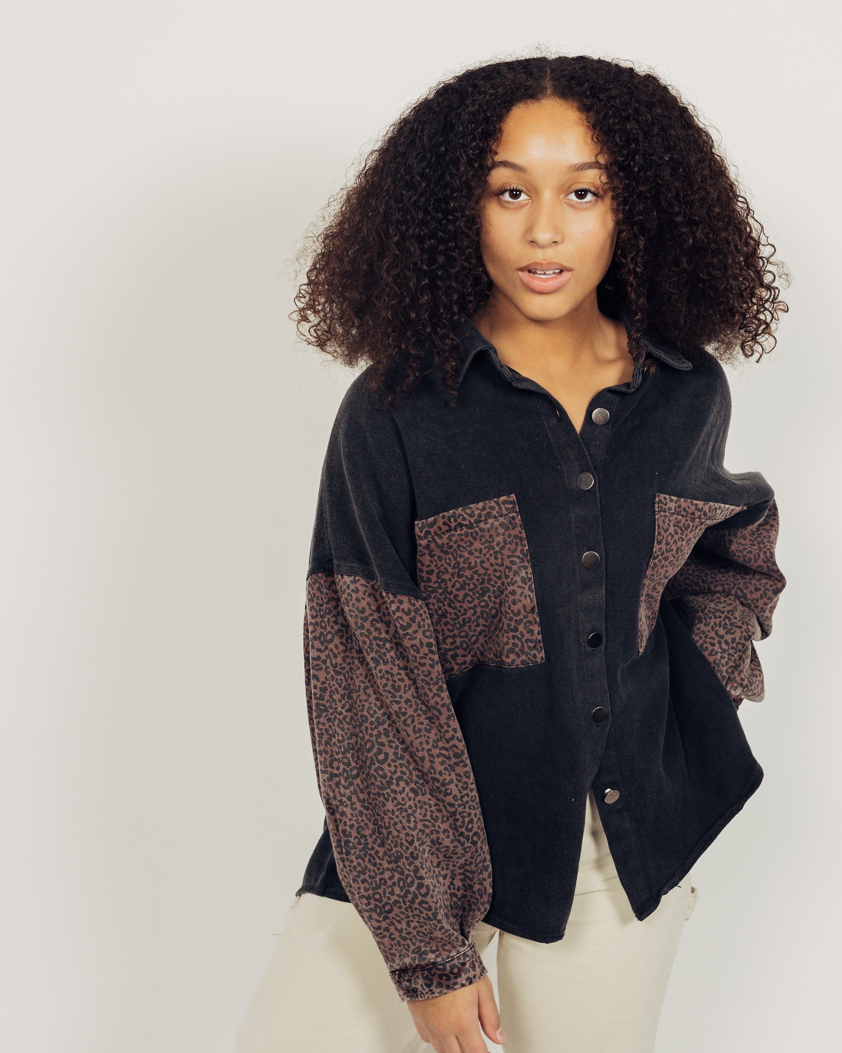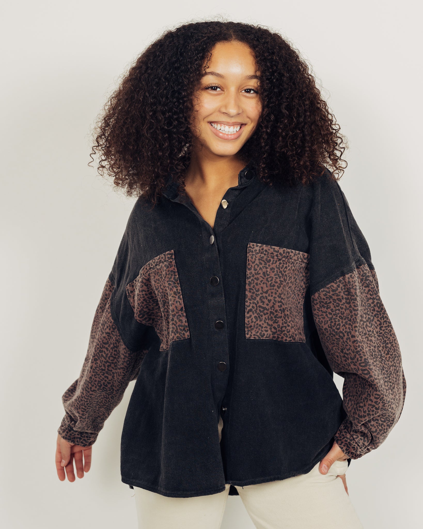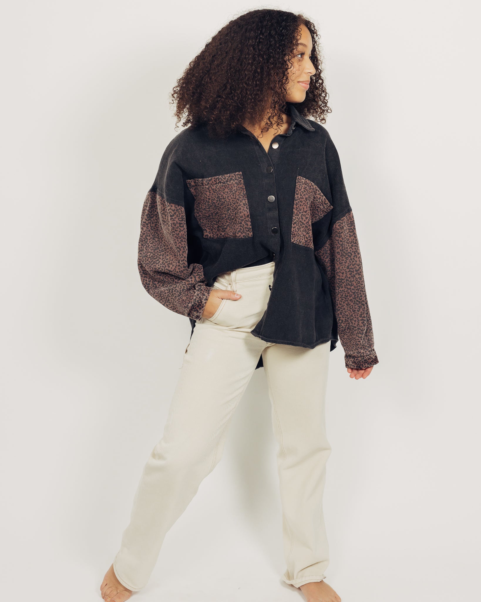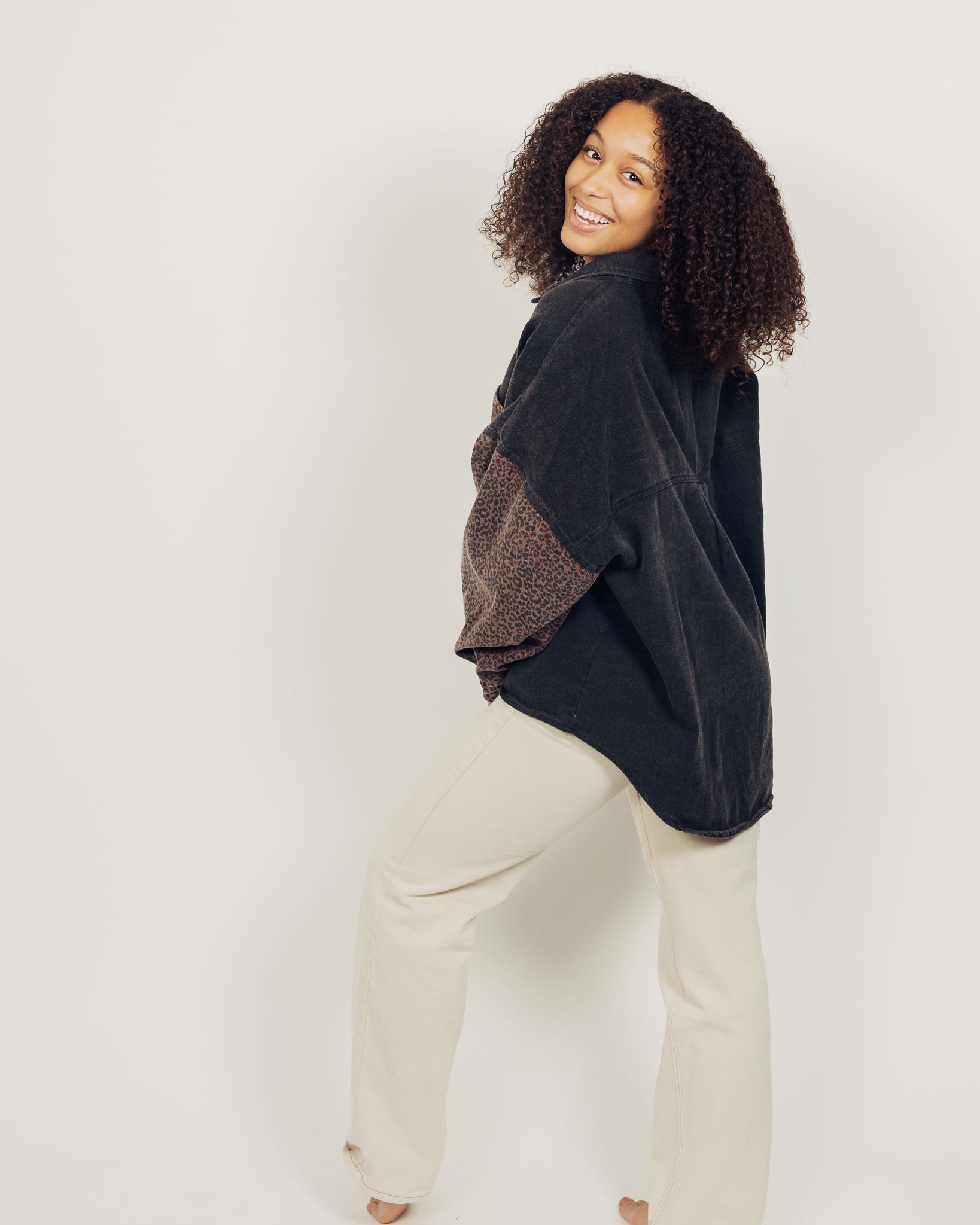 The Leopard Shacket is one of my favorite things that the shop has ever had. It is a black denim jacket with leopard sleeves and leopard pockets. It has functional buttons, and it's also not stiff. Some denim jackets are pretty stiff, but this one is not. I am 5'9" and wearing a size small. It can be worn as a shirt or a jacket. The fabric content is 100% cotton.