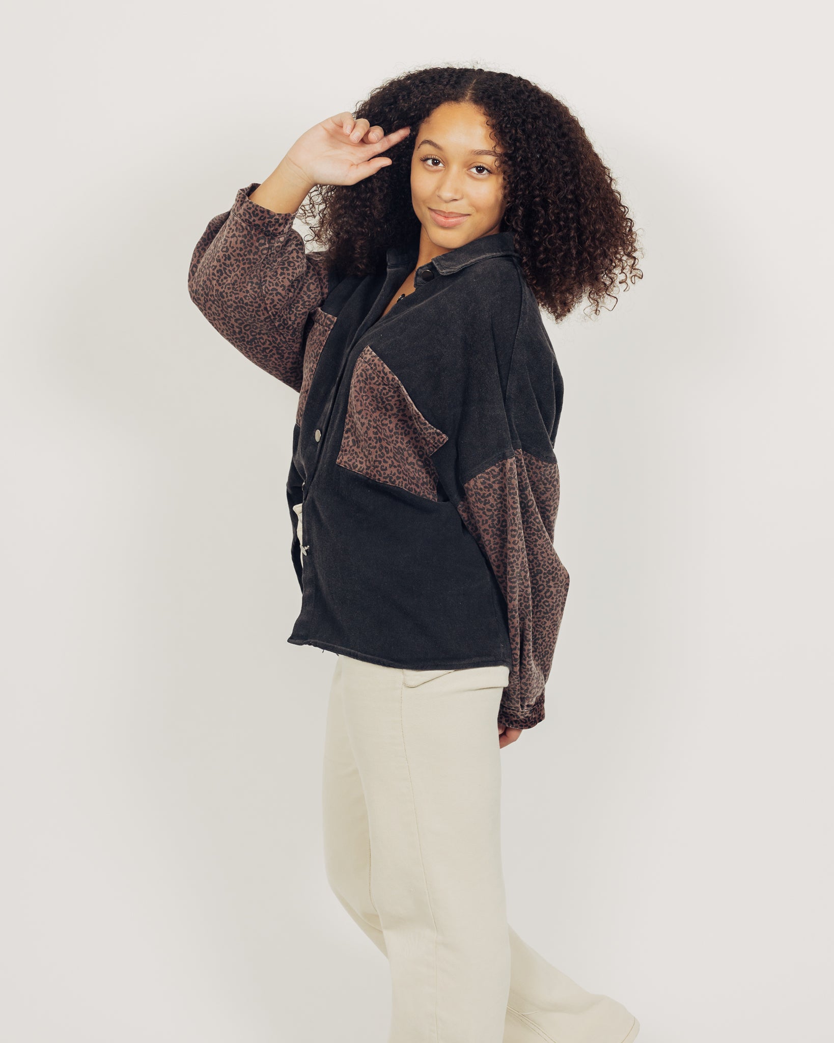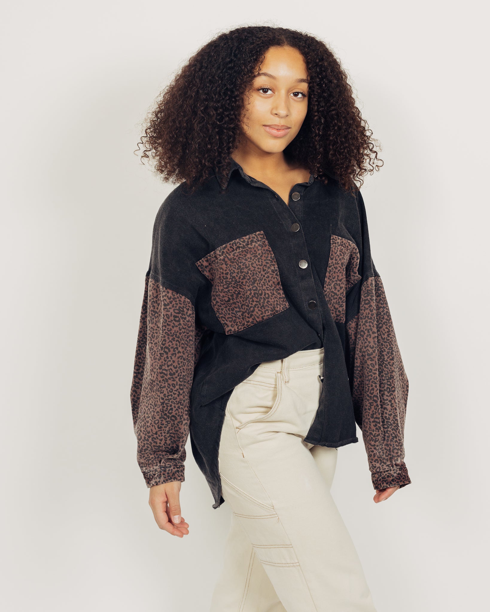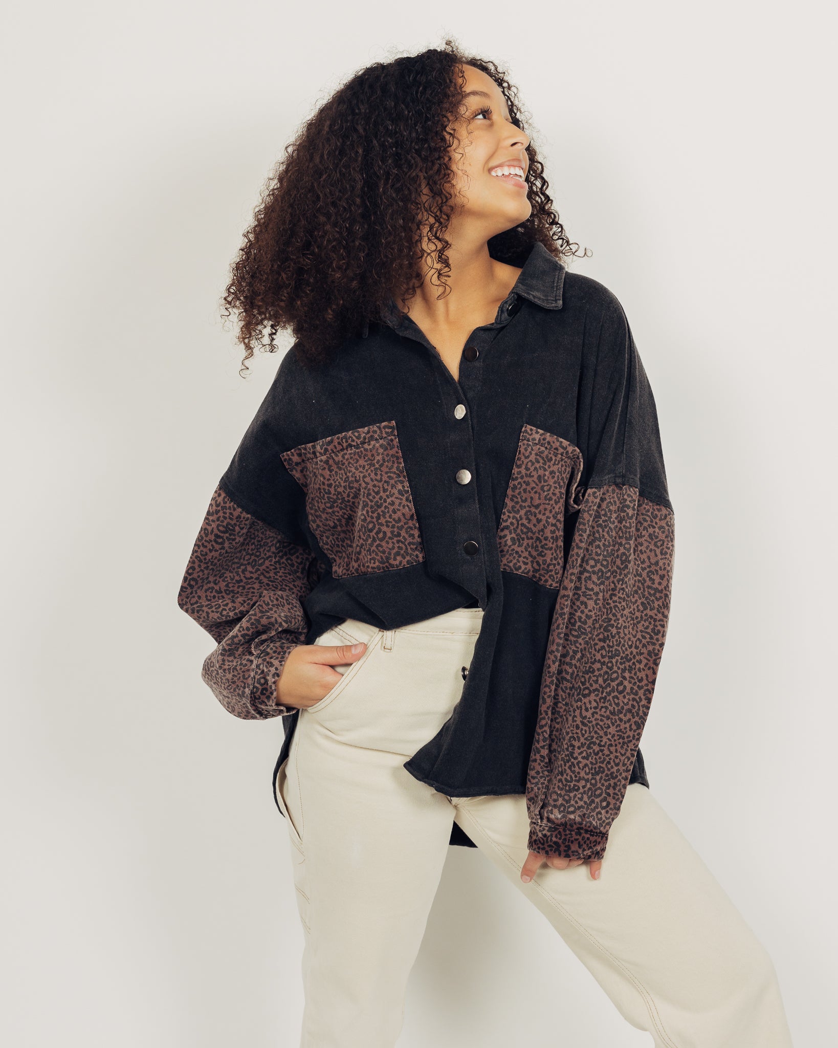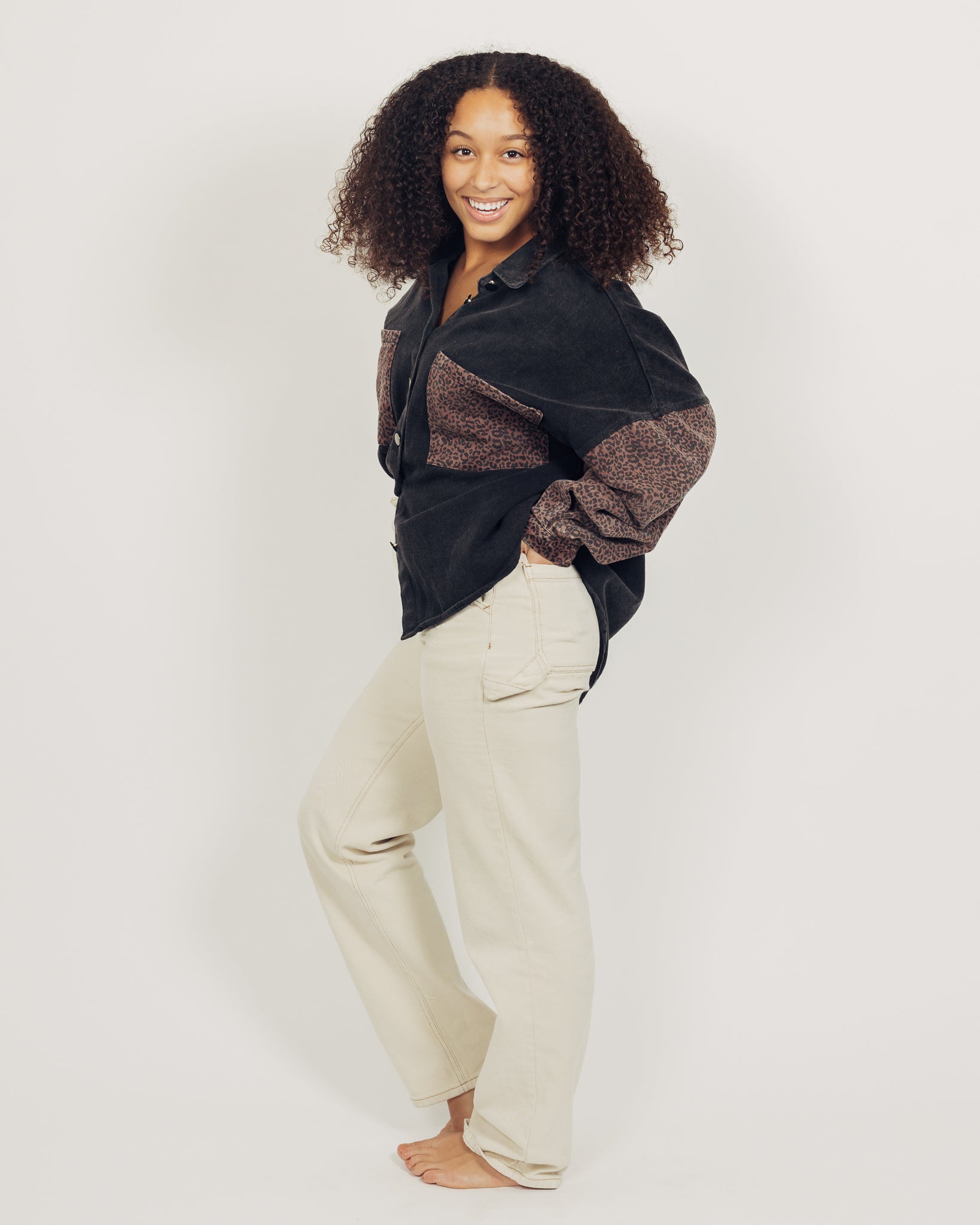 The Leopard Shacket is one of my favorite things that the shop has ever had. It is a black denim jacket with leopard sleeves and leopard pockets. It has functional buttons, and it's also not stiff. Some denim jackets are pretty stiff, but this one is not. I am 5'9" and wearing a size small. It can be worn as a shirt or a jacket. The fabric content is 100% cotton.