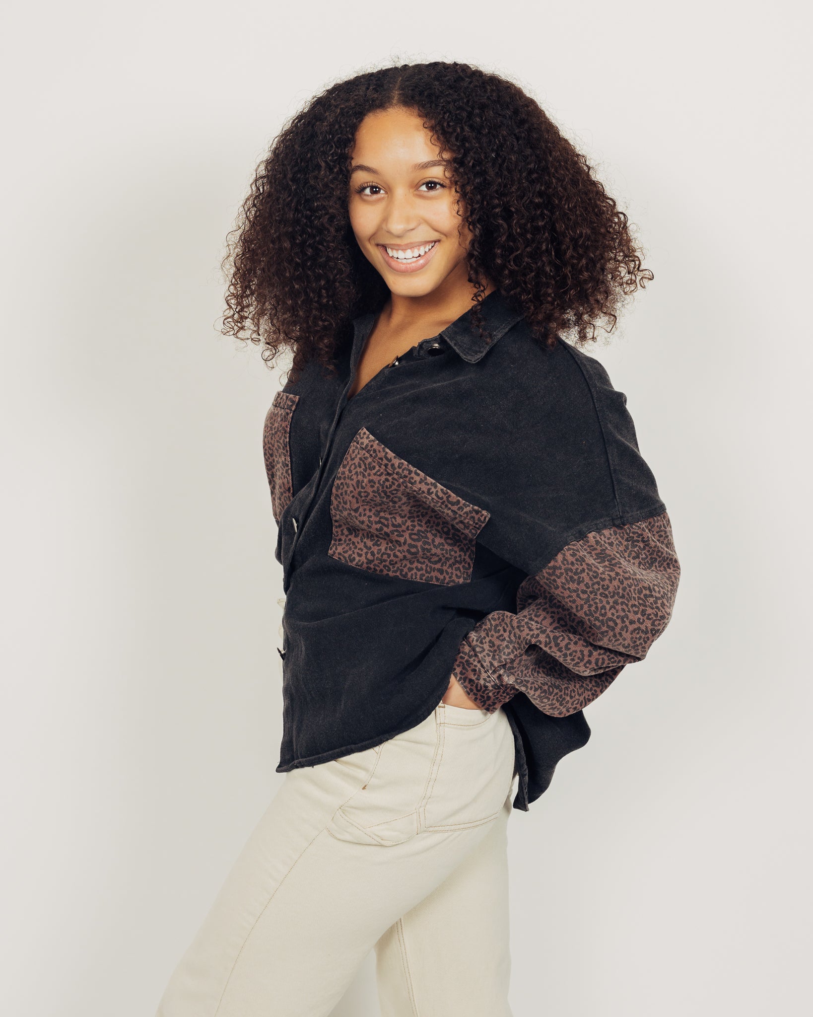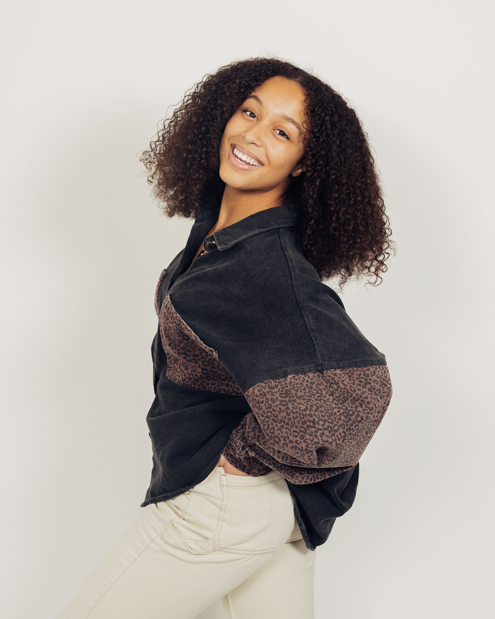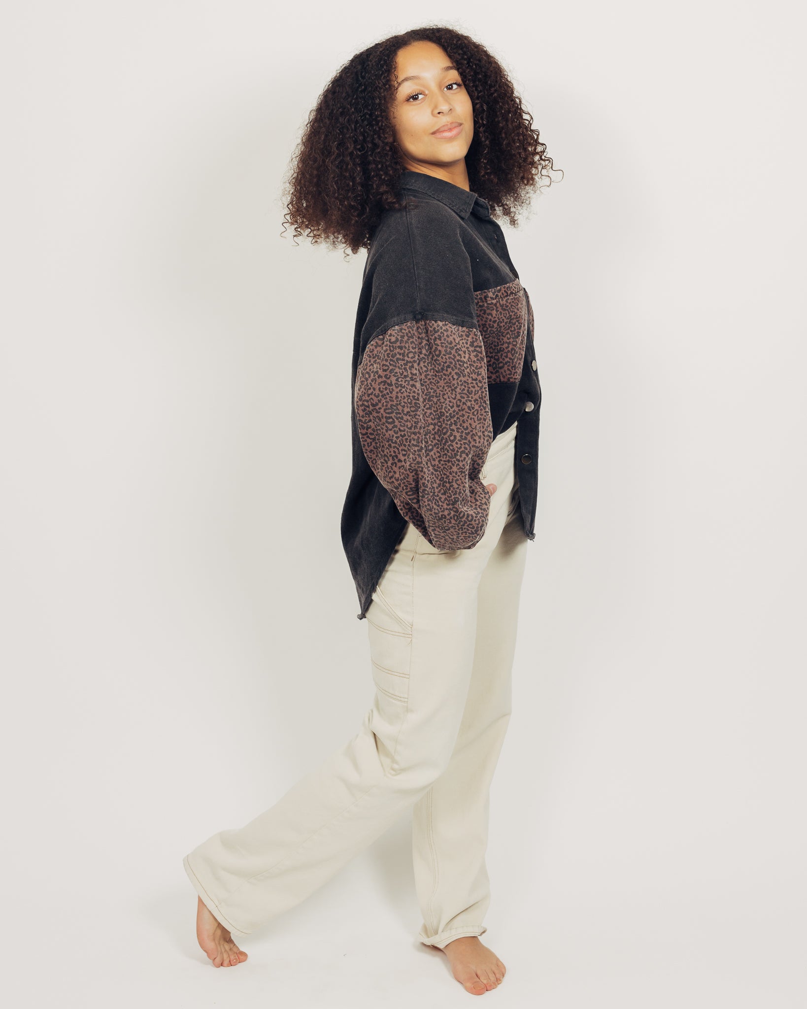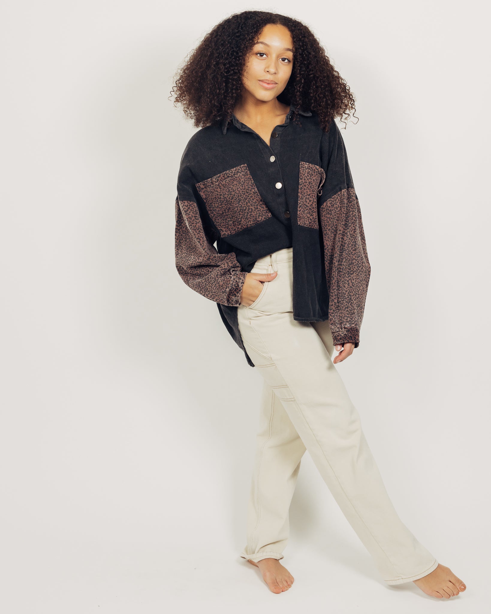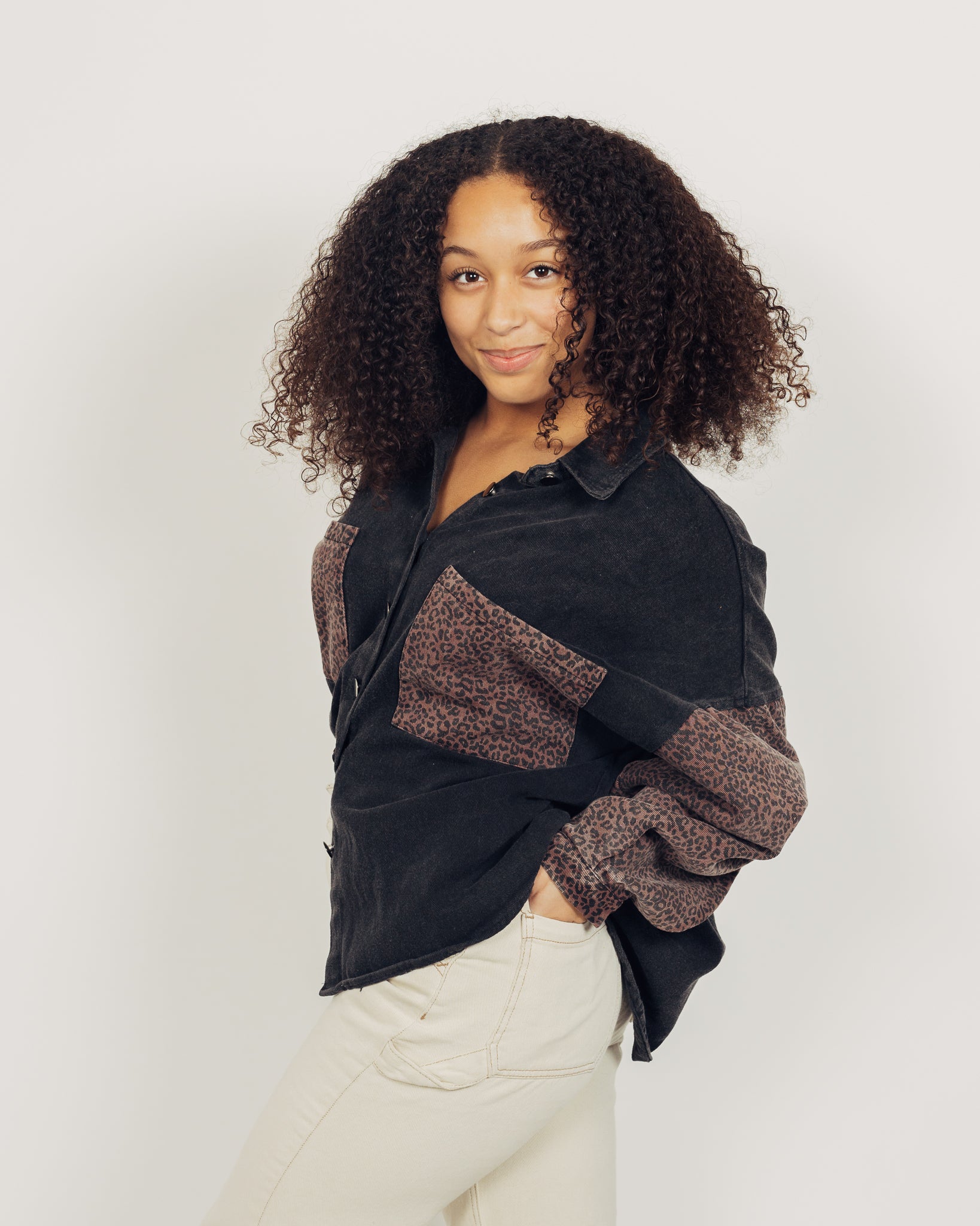 The Leopard Shacket is one of my favorite things that the shop has ever had. It is a black denim jacket with leopard sleeves and leopard pockets. It has functional buttons, and it's also not stiff. Some denim jackets are pretty stiff, but this one is not. I am 5'9" and wearing a size small. It can be worn as a shirt or a jacket. The fabric content is 100% cotton.