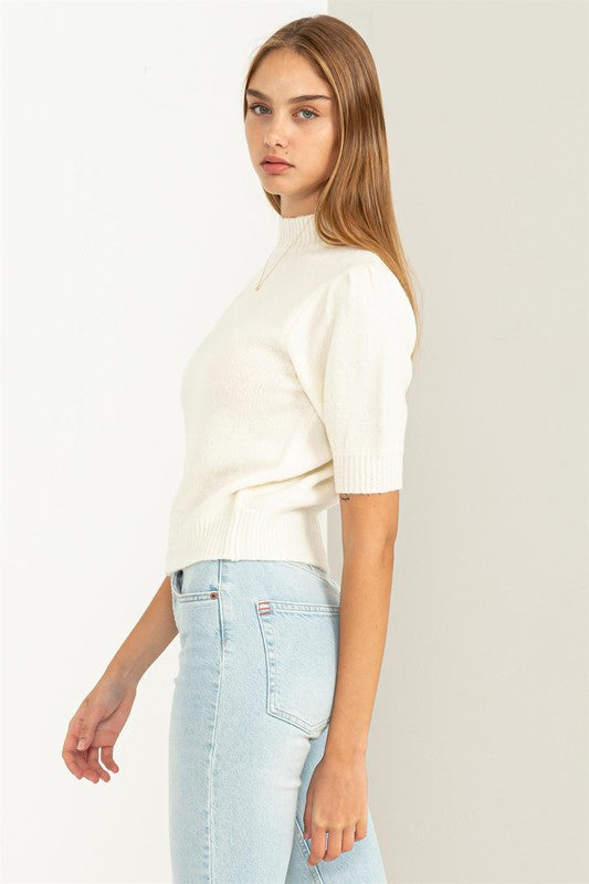 A chic and stylish addition to your wardrobe. This sweater is designed to flatter your figure with its fitted bodice, creating an eye-catching and fashionable look. The short puff sleeves add a touch of elegance and will surely get you noticed. The ribbed high neck, cuffs, and hem provide a polished finish.