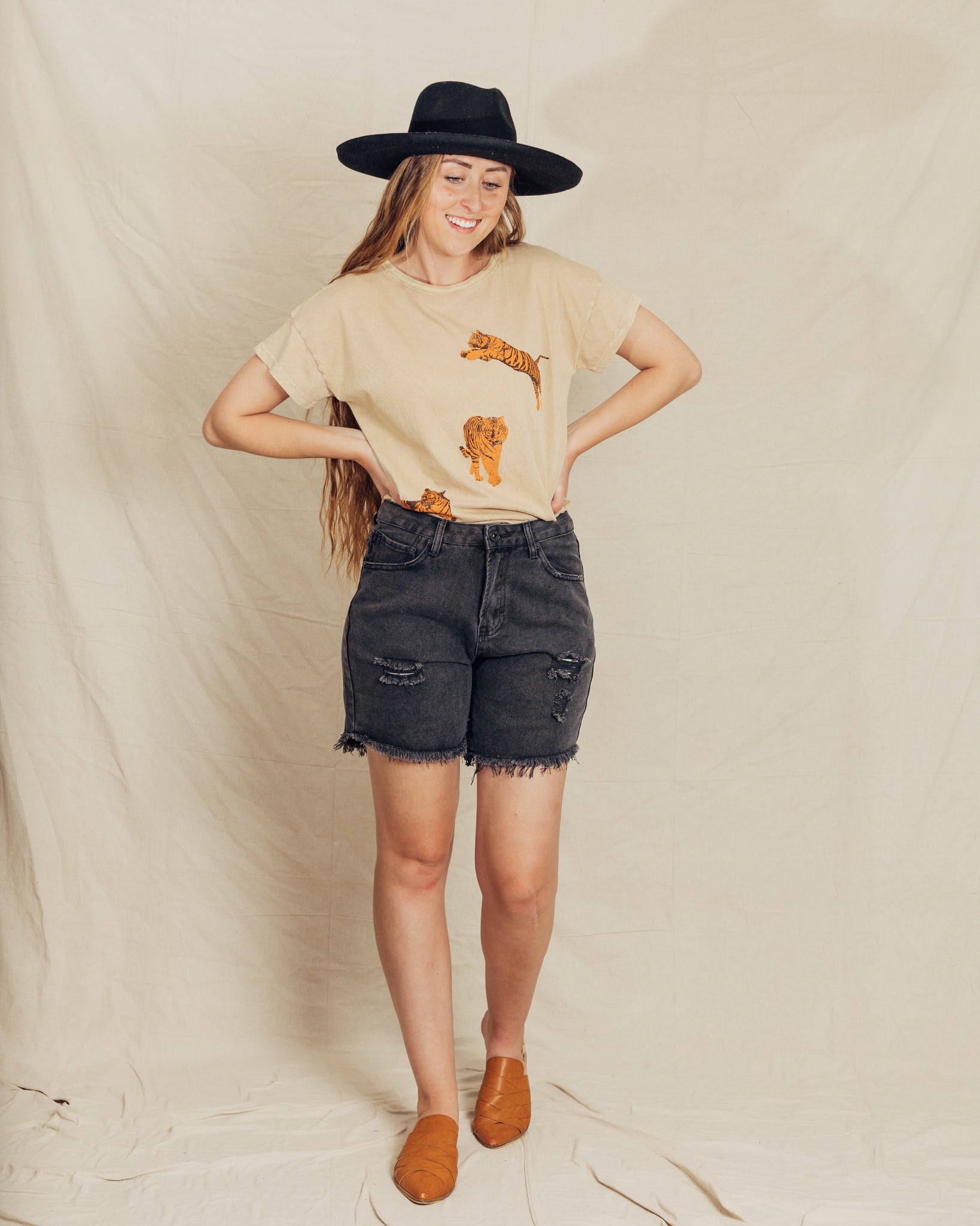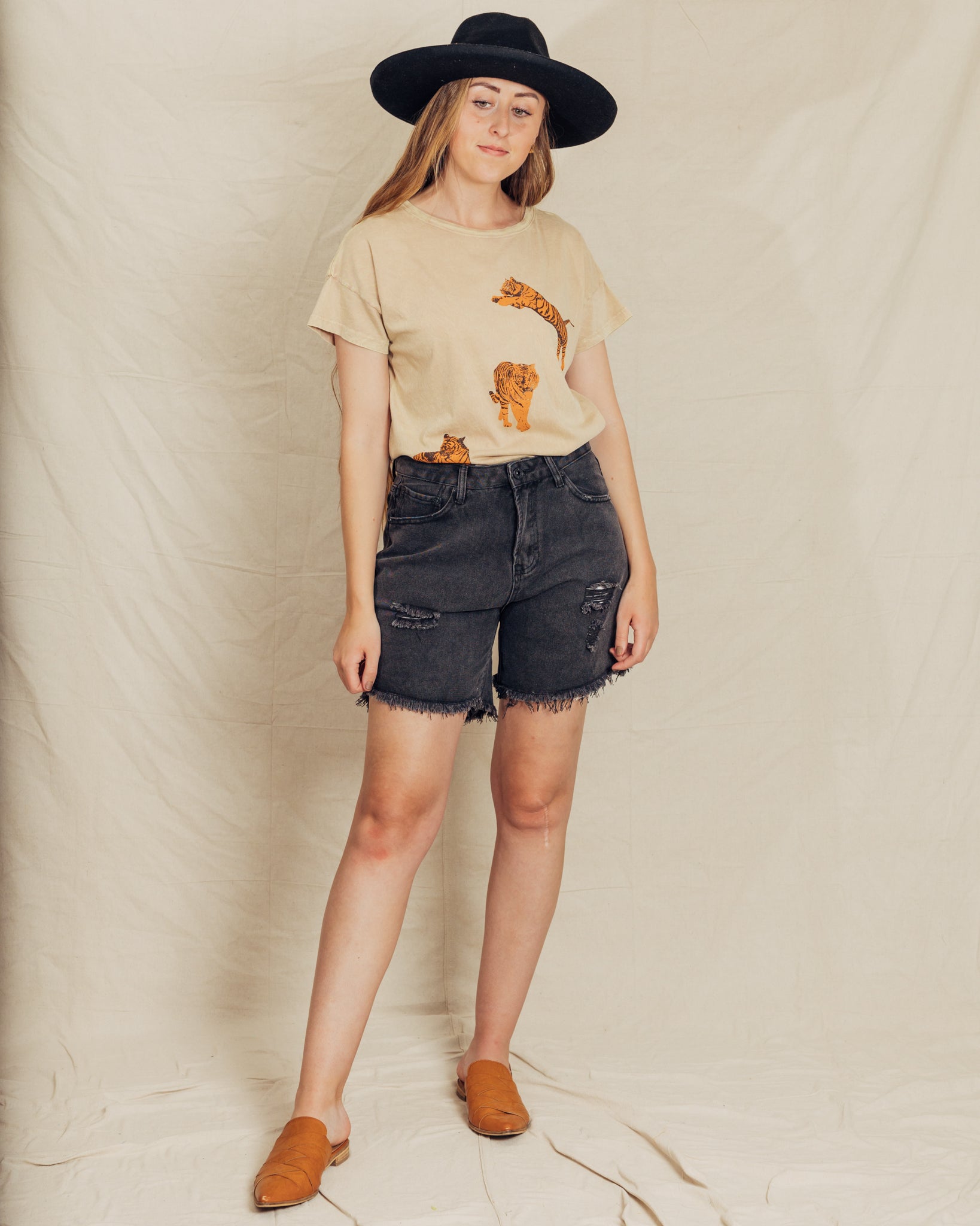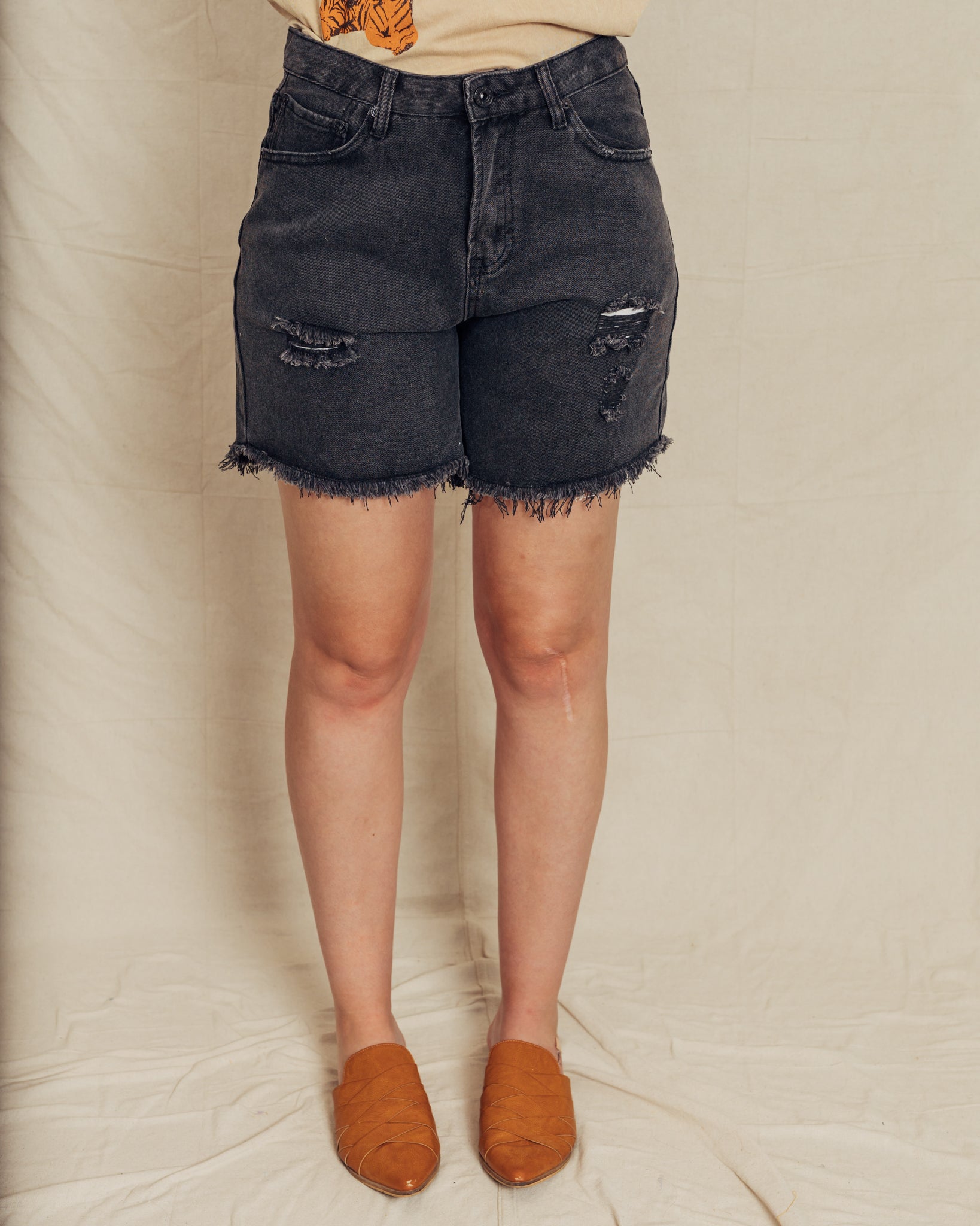These shorts are the best for summer. I sized down in these shorts, but check the measurements! They are meant to fit oversized. They have distressing on them, and a raw edge hem. The pockets are also functional. I am 5'9" and wearing a size 3. The fabric content is 70% cotton 30% polyester.