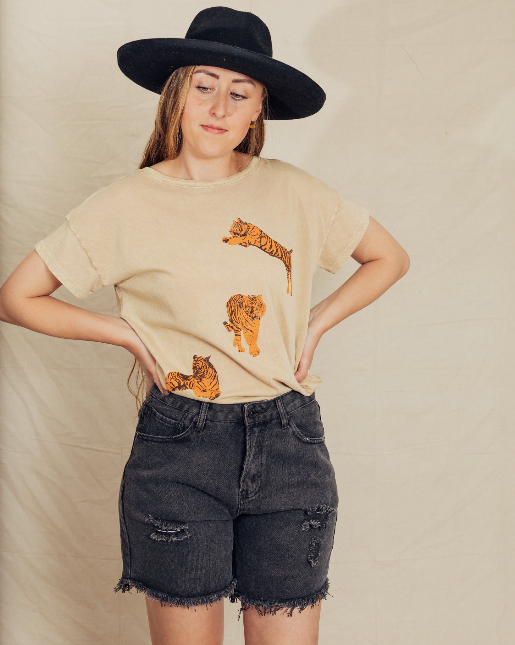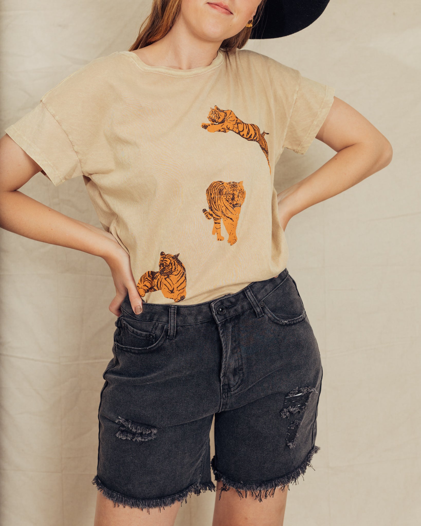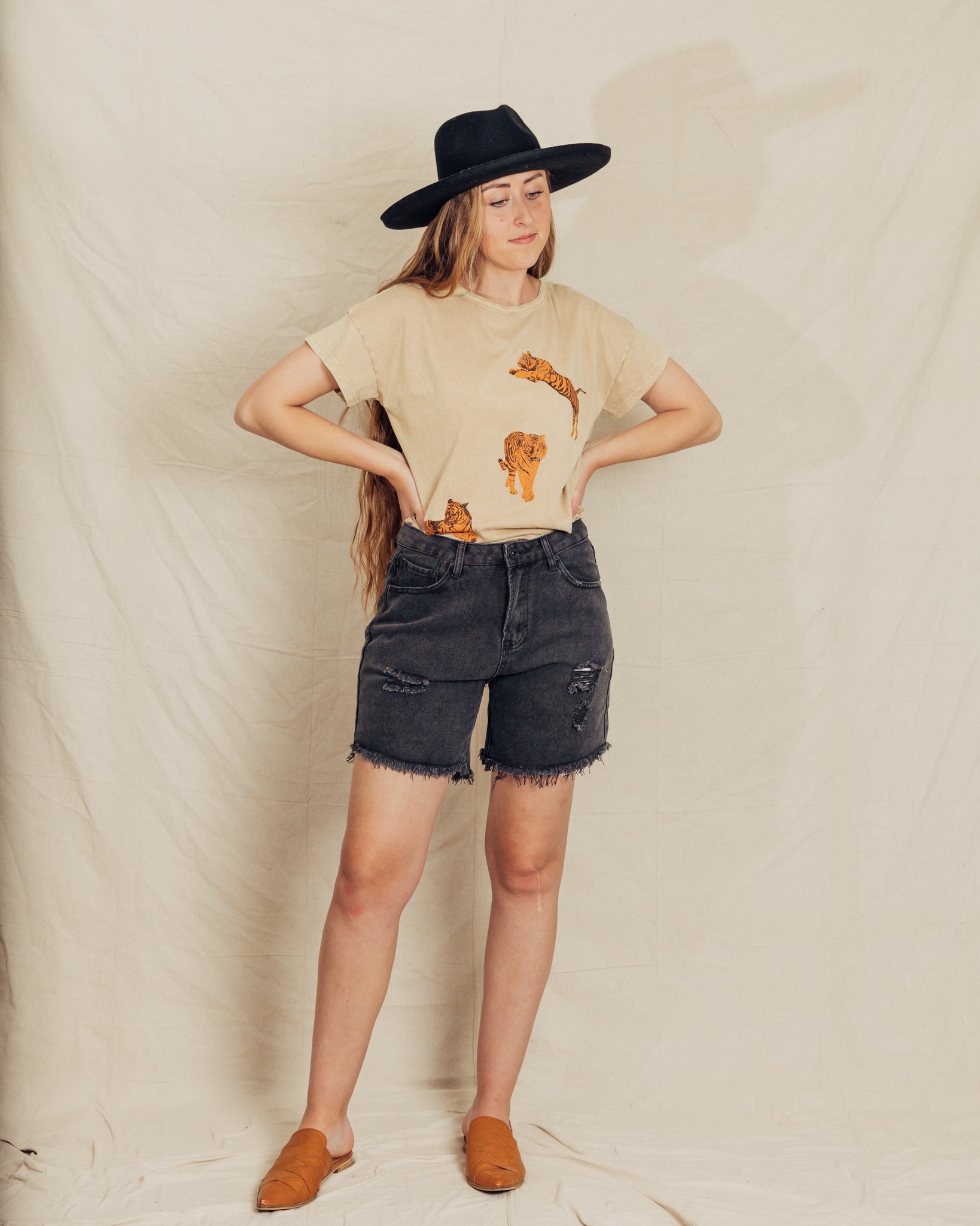 These shorts are the best for summer. I sized down in these shorts, but check the measurements! They are meant to fit oversized. They have distressing on them, and a raw edge hem. The pockets are also functional. I am 5'9" and wearing a size 3. The fabric content is 70% cotton 30% polyester.