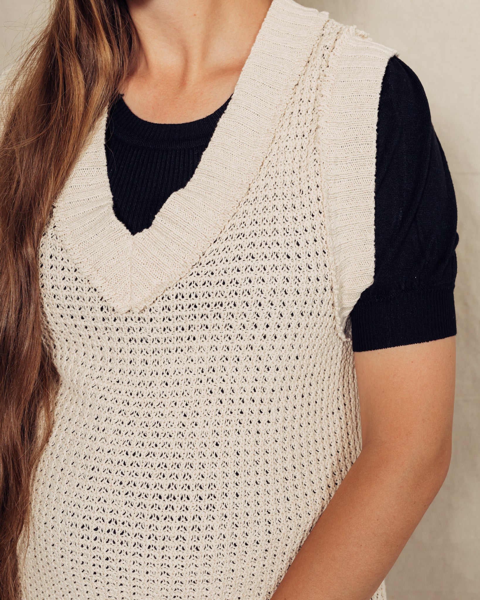 The Lynn Dress is a vest dress, and it does not come with the shirt underneath. It is a loose-knit dress, so you will probably want to wear a slip underneath it. I am 5'9" and wearing a size small. The fabric content is 100% cotton.