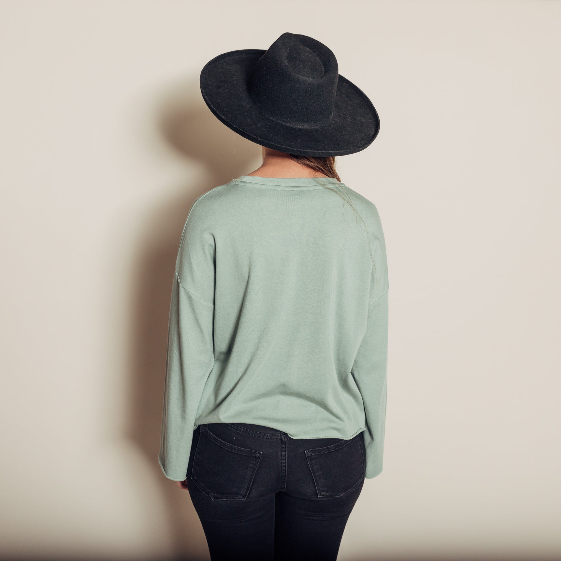 It doesn't get any comfier than our Makayla Top. It's as soft as butter and can be dressed up or dressed down. This clay colored top features long bell sleeves and raw edges. I am wearing a size small/medium. The fabric is 38% acrylic, 36% rayon, 20% cotton, and 6% spandex.