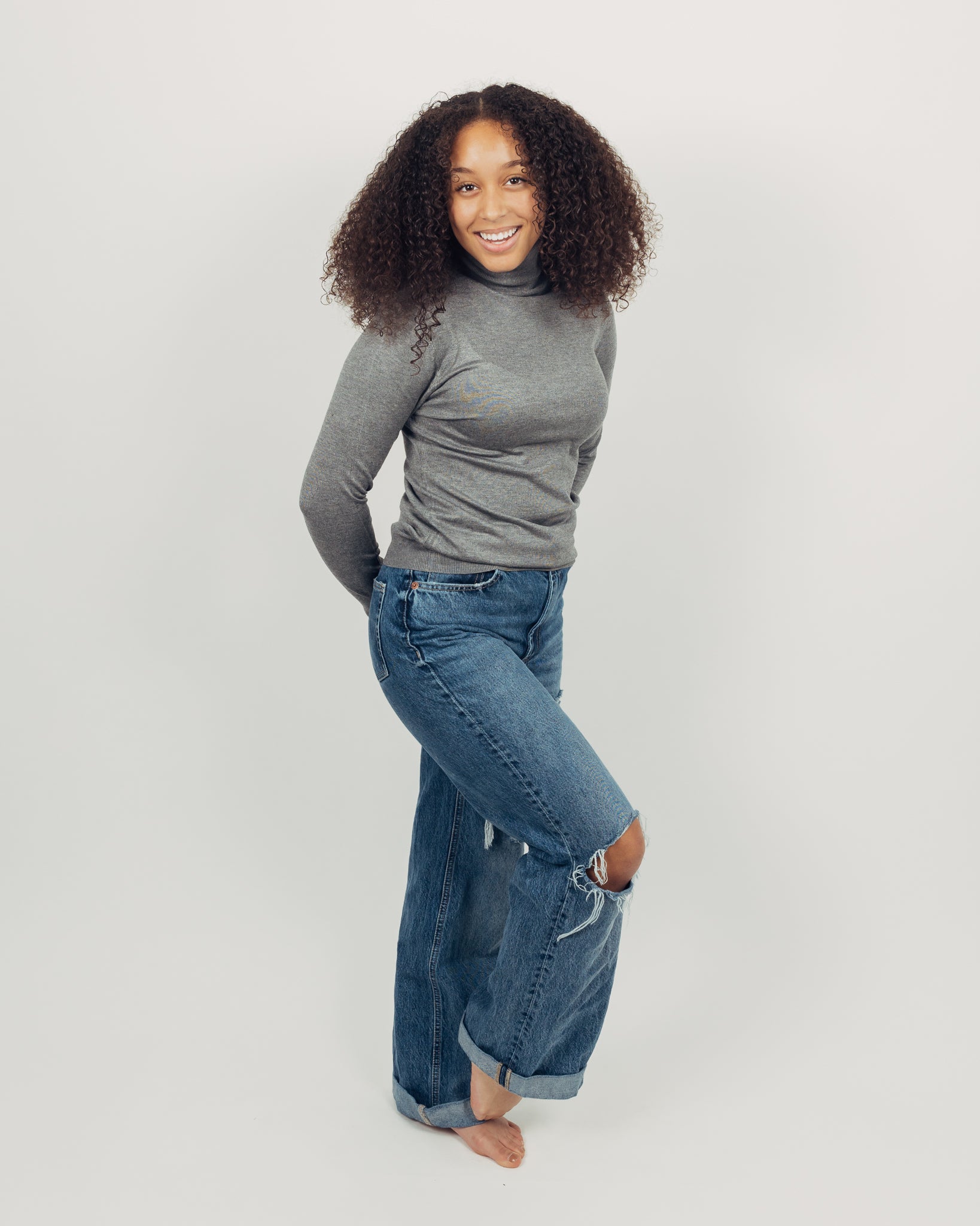 The Malt Turtleneck is non-sheer and so soft! The model is wearing a size medium, and the fabric content is 70% viscose and 30% nylon.
