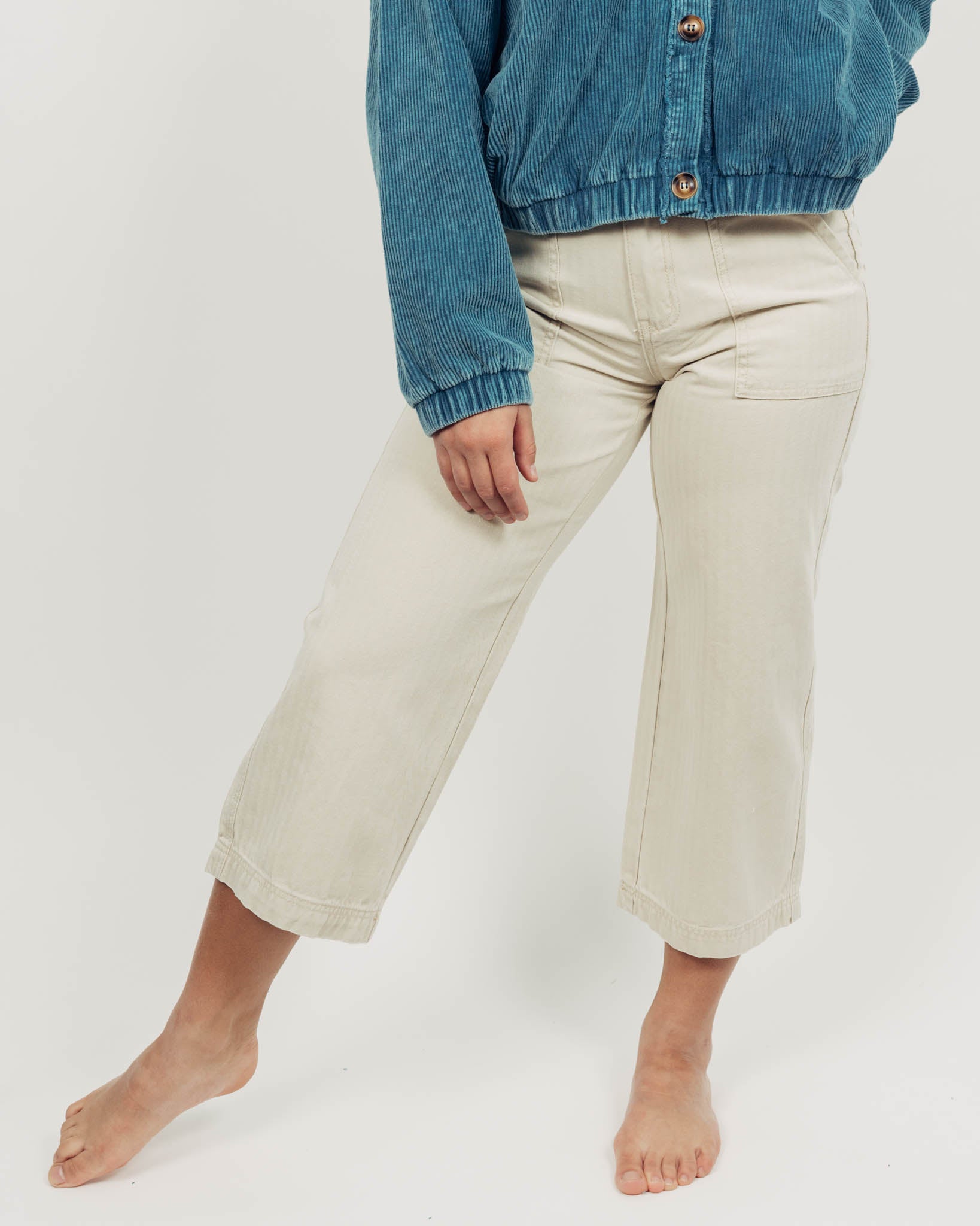The Mandi Pants are so cute. They have big pickets in the front and the back, and they are all functional. The model is wearing a size small, and the fabric content is 100% cotton.