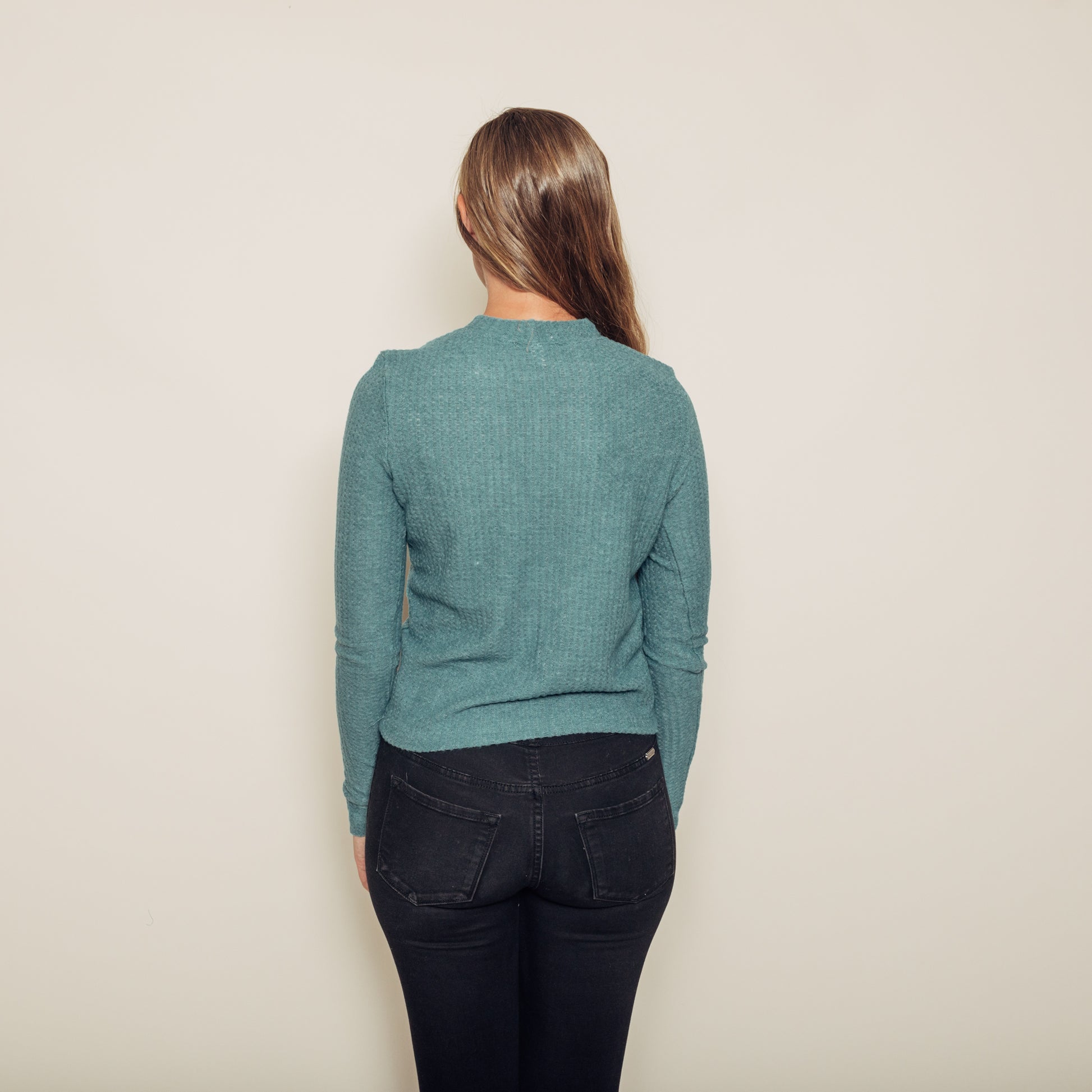 The Mara Top is a simple and soft waffle top. It's a bit stretchy, and it is non-sheer. The fabric content is 62% polyester, 34% cotton, and 4% spandex. I am 5'9" and wearing a size small.