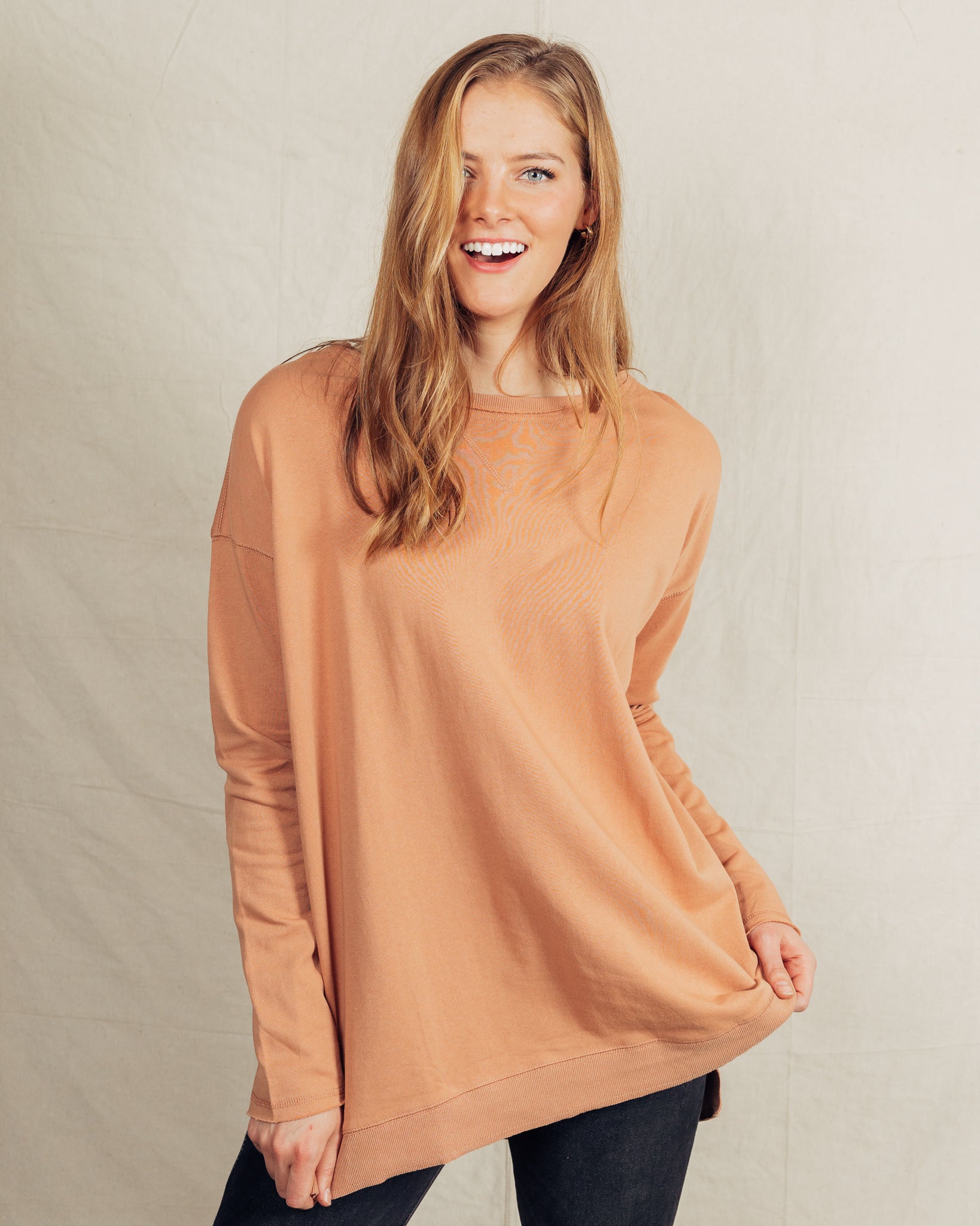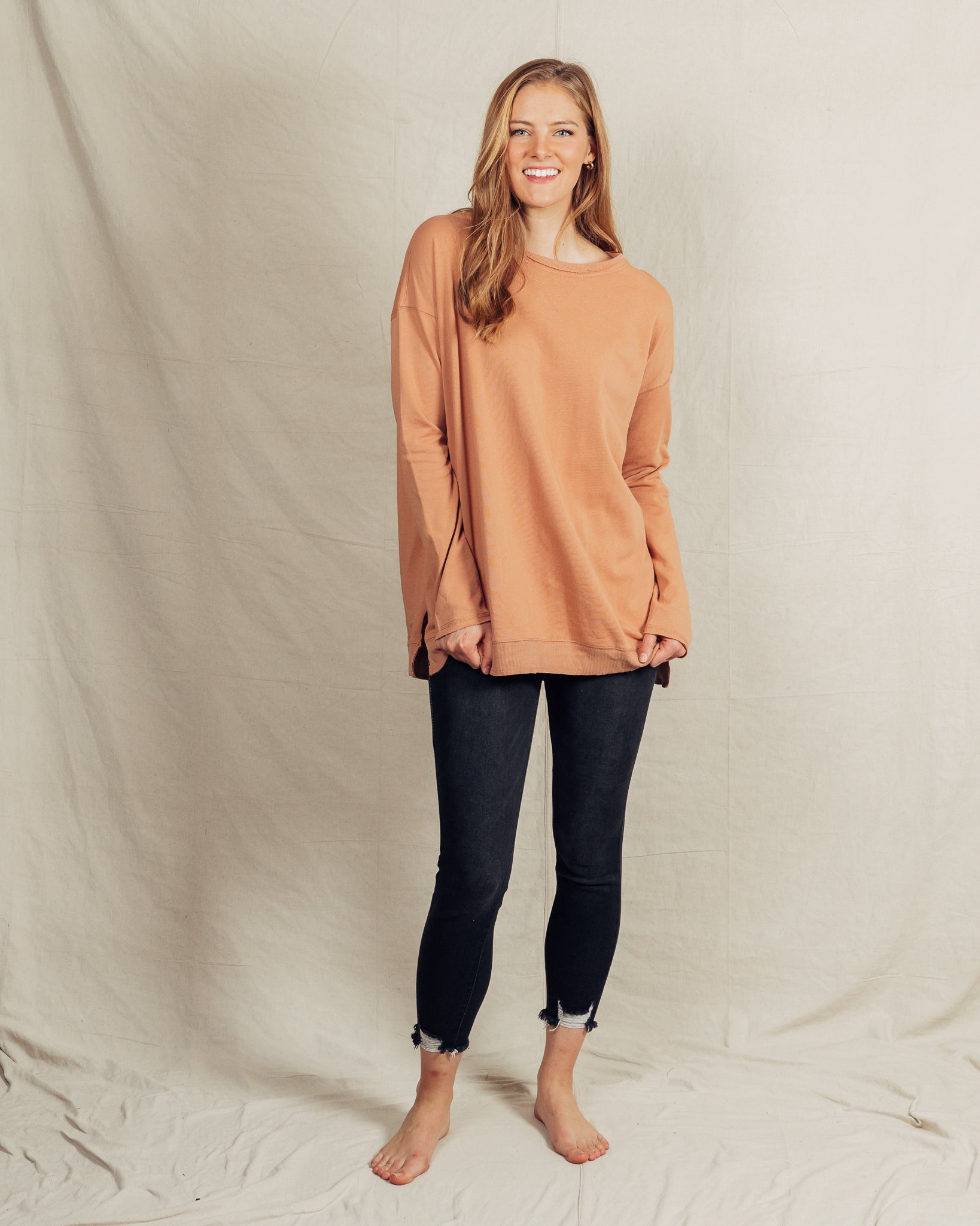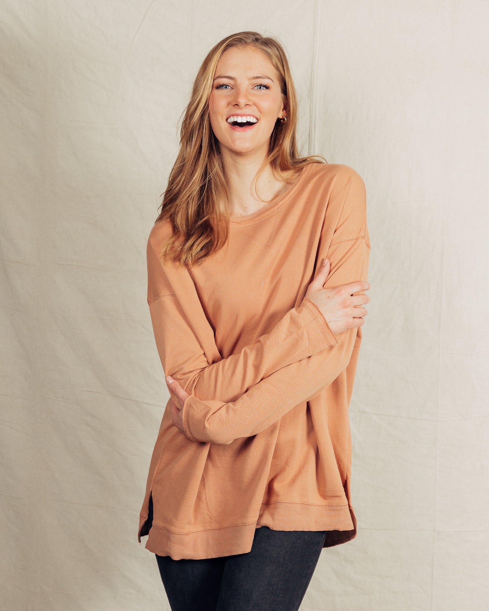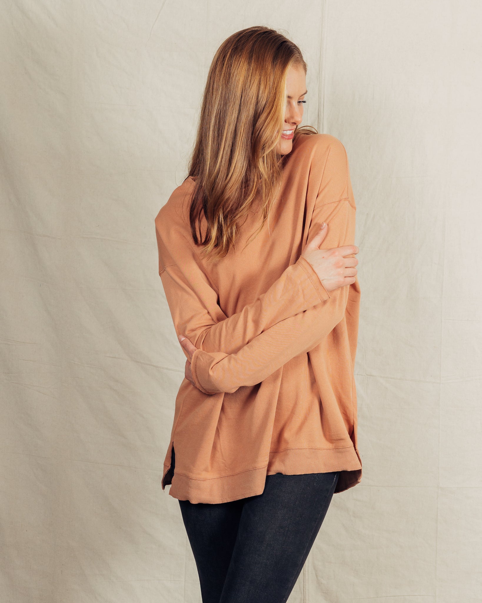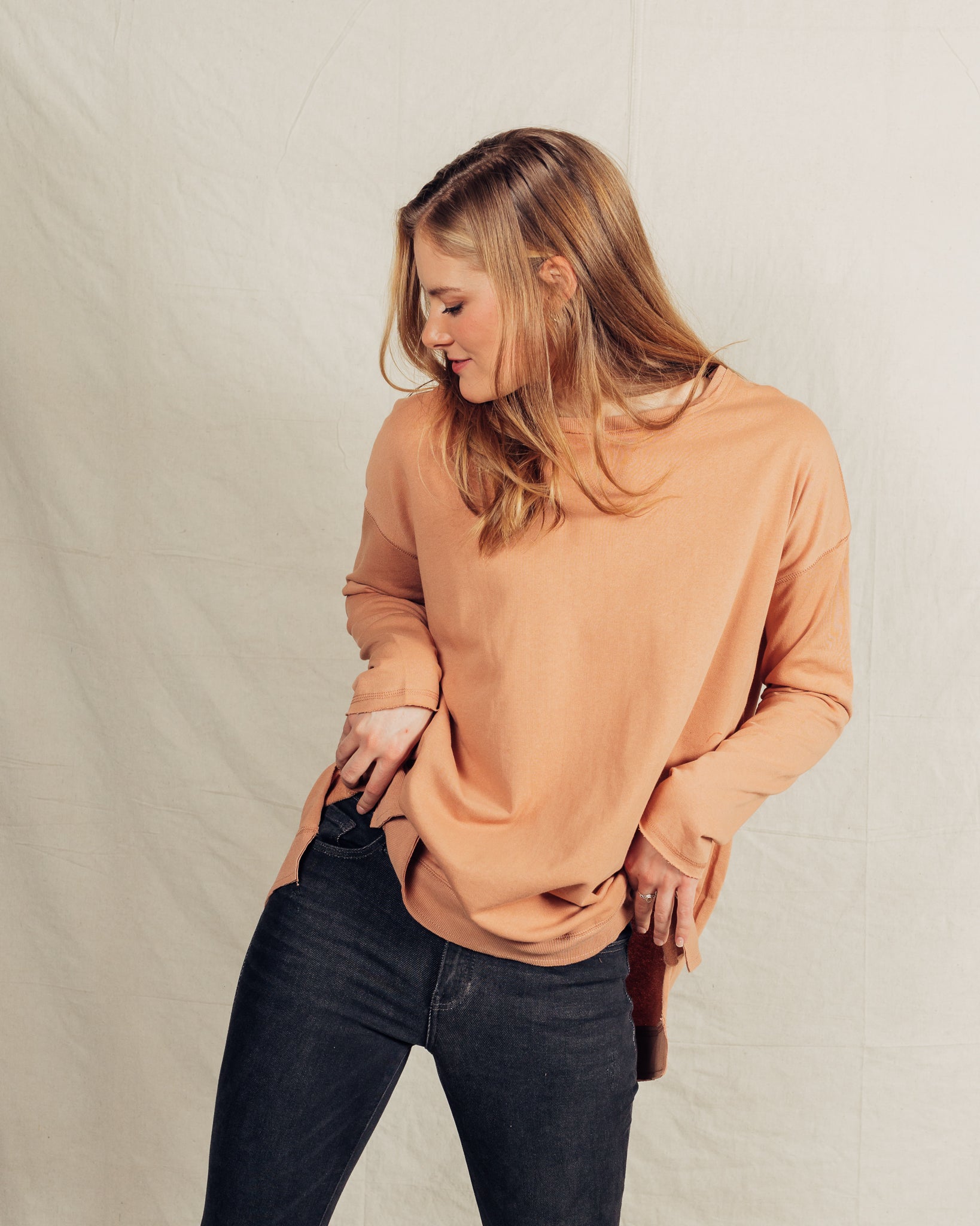 The Maren Top is right in between a top and a pullover. It's way comfy, and it's non-sheer. It has a loose fit, so if you want a more fitted look, you can size down. Model is 5'10" and wearing a size small. The fabric content is 100% cotton.