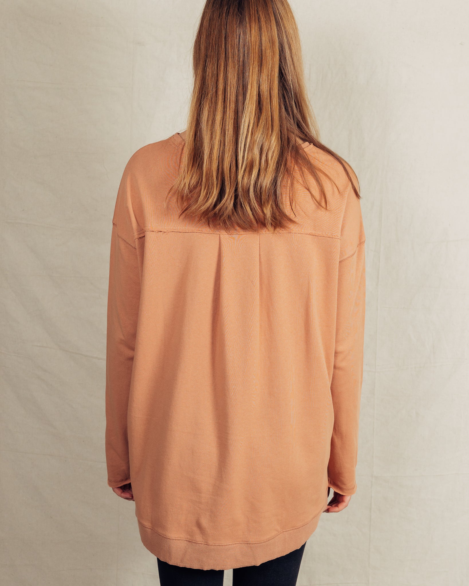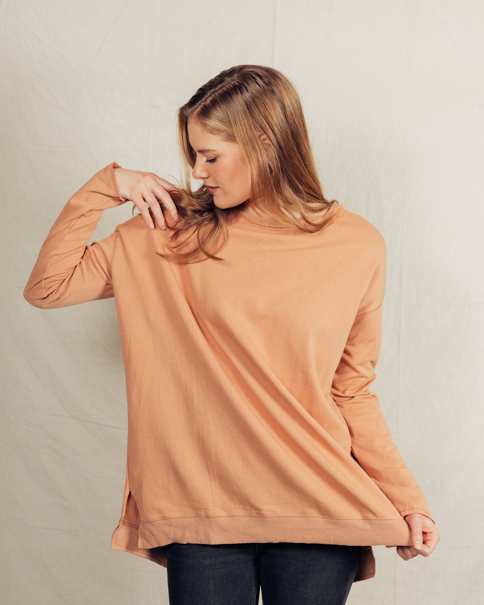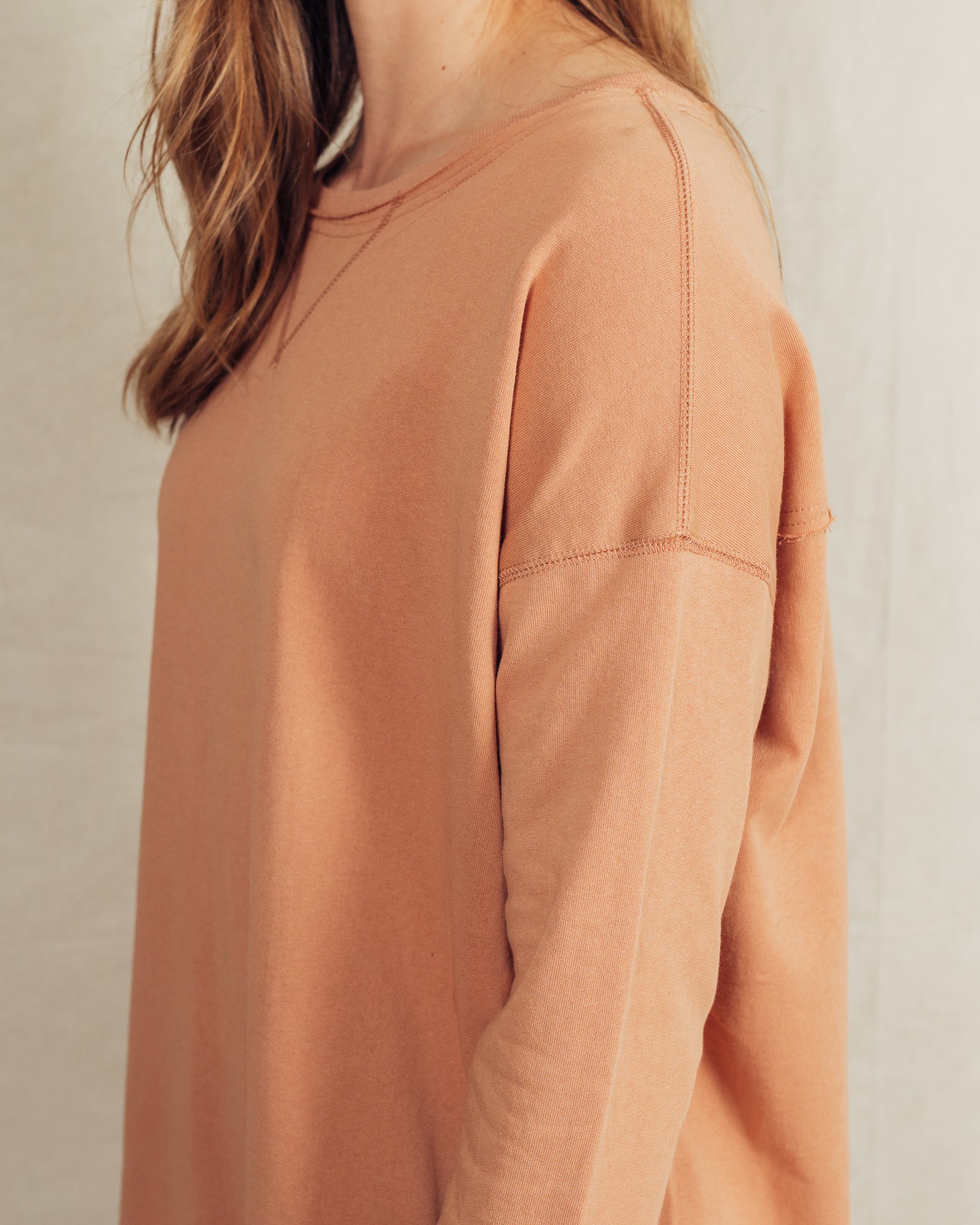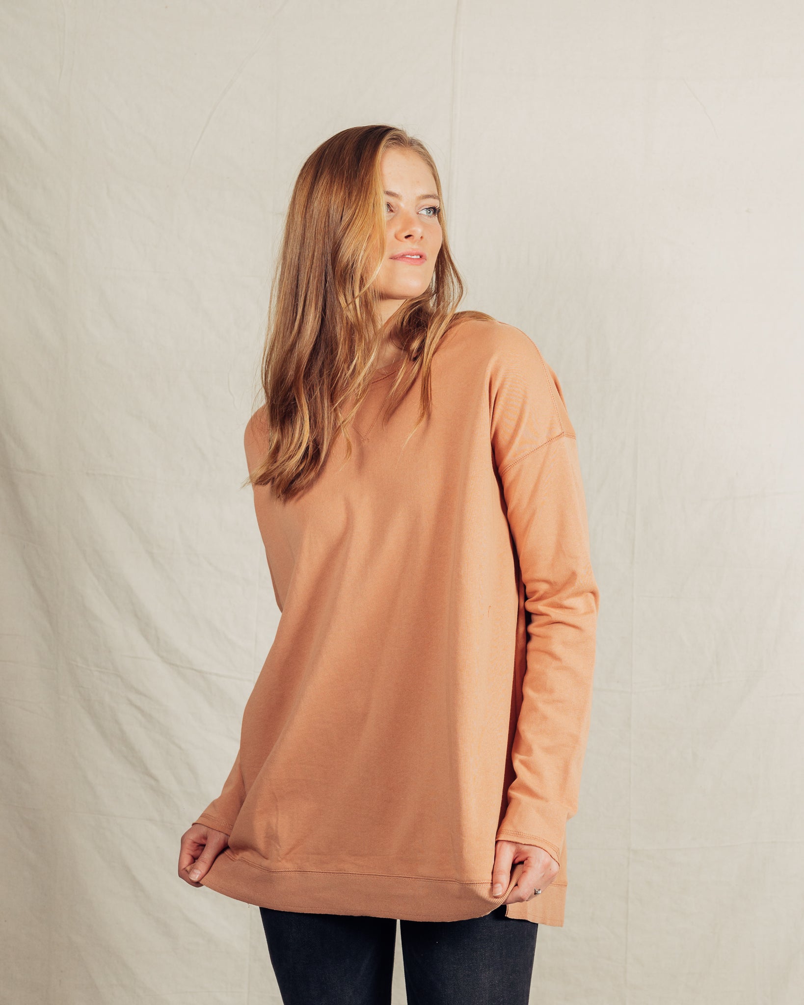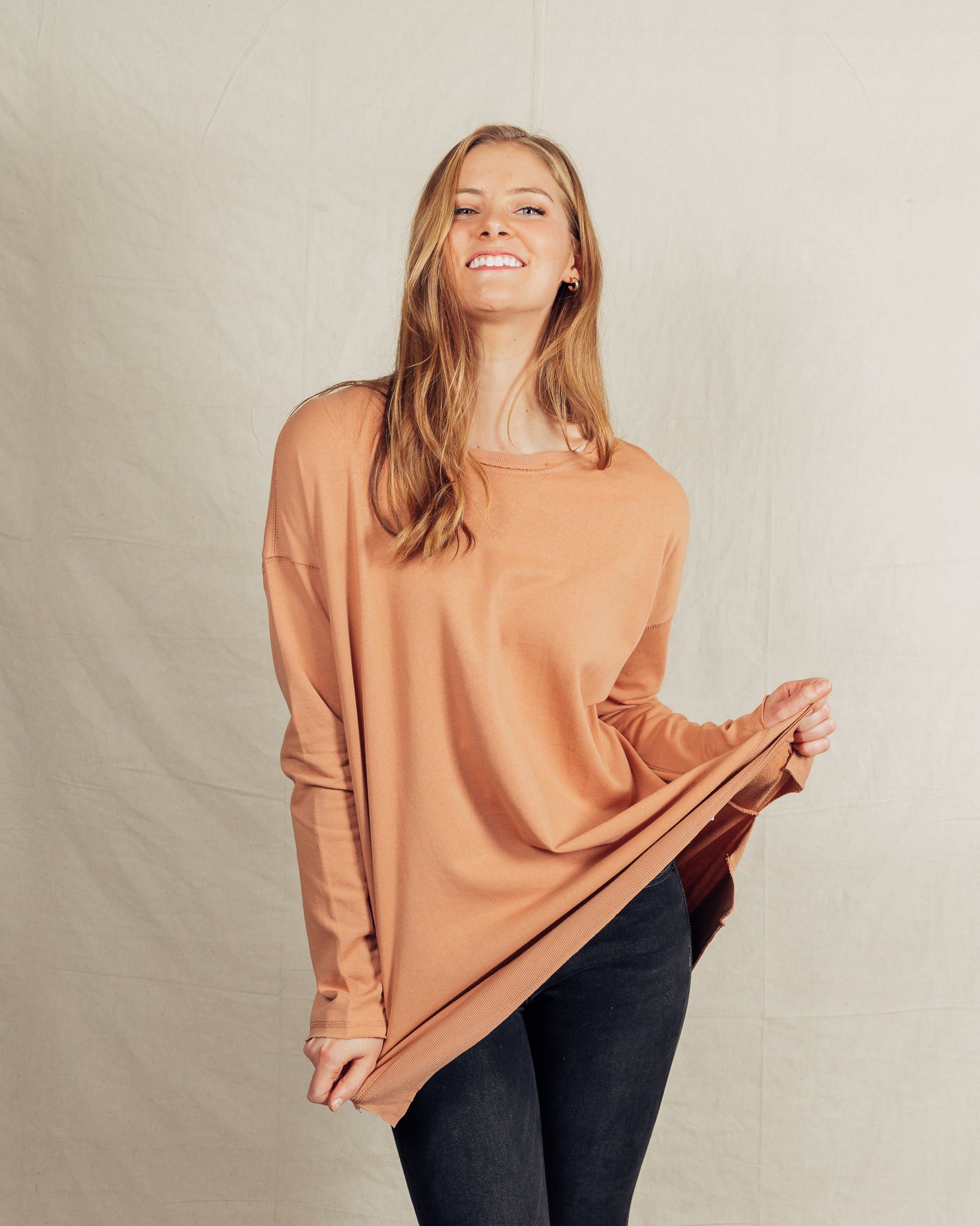 The Maren Top is right in between a top and a pullover. It's way comfy, and it's non-sheer. It has a loose fit, so if you want a more fitted look, you can size down. Model is 5'10" and wearing a size small. The fabric content is 100% cotton.