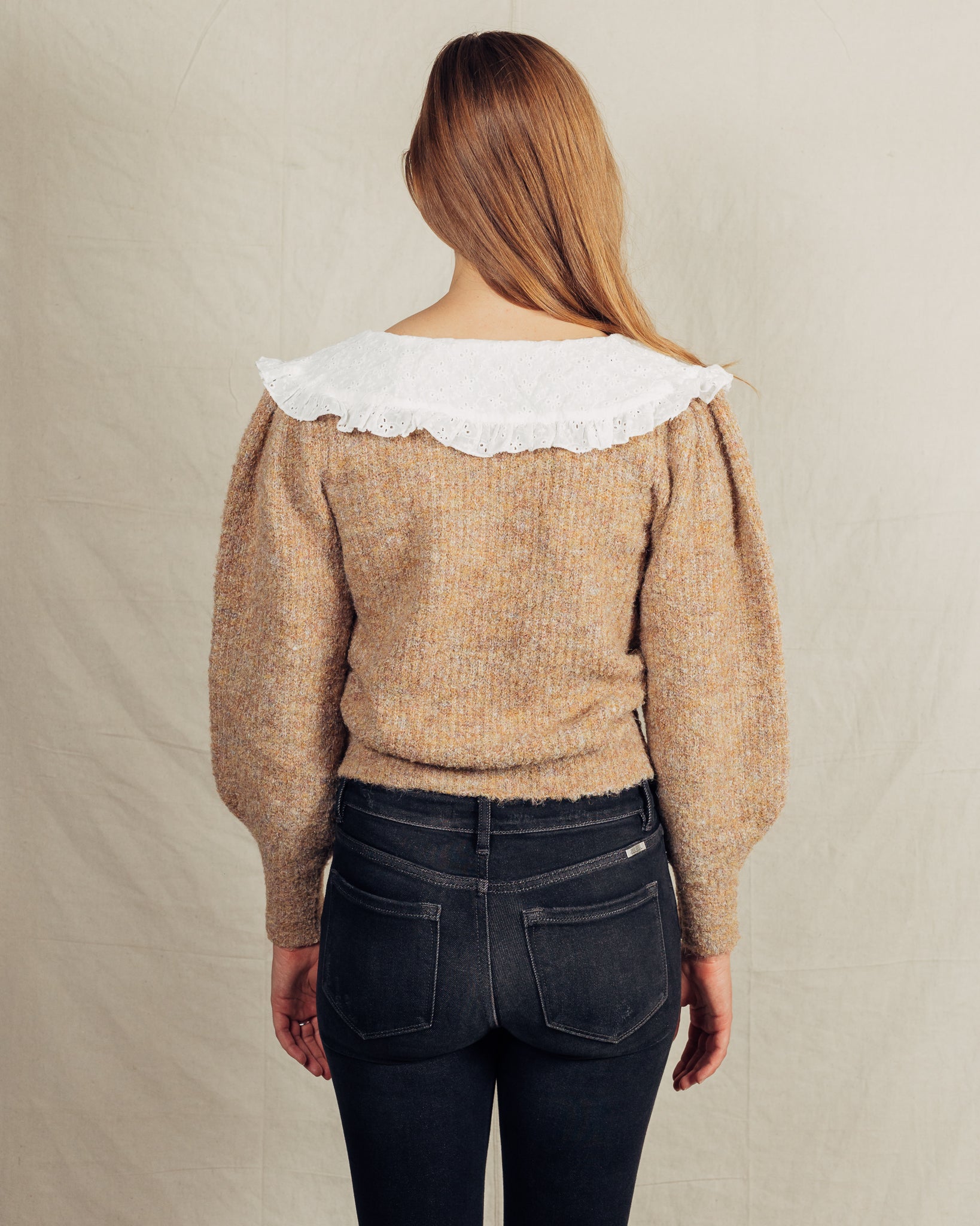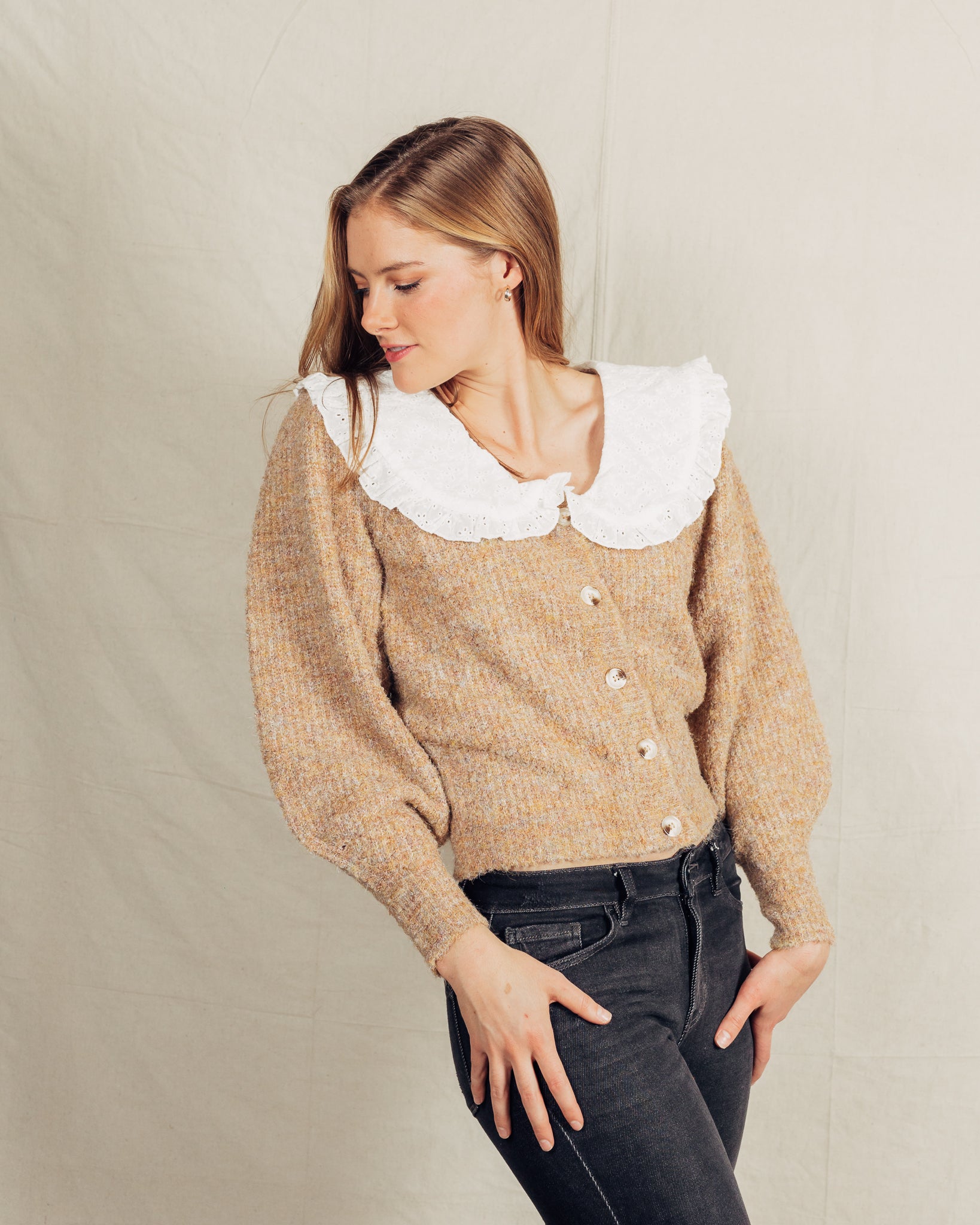 The Mariah Sweater is so cute! It has functional buttons, so you can wear it as a sweater or a cardigan. Model is 5'10" and wearing a size small. The fabric content is 48% acrylic, 34% nylon, 10% polyester, and 6% wool.
