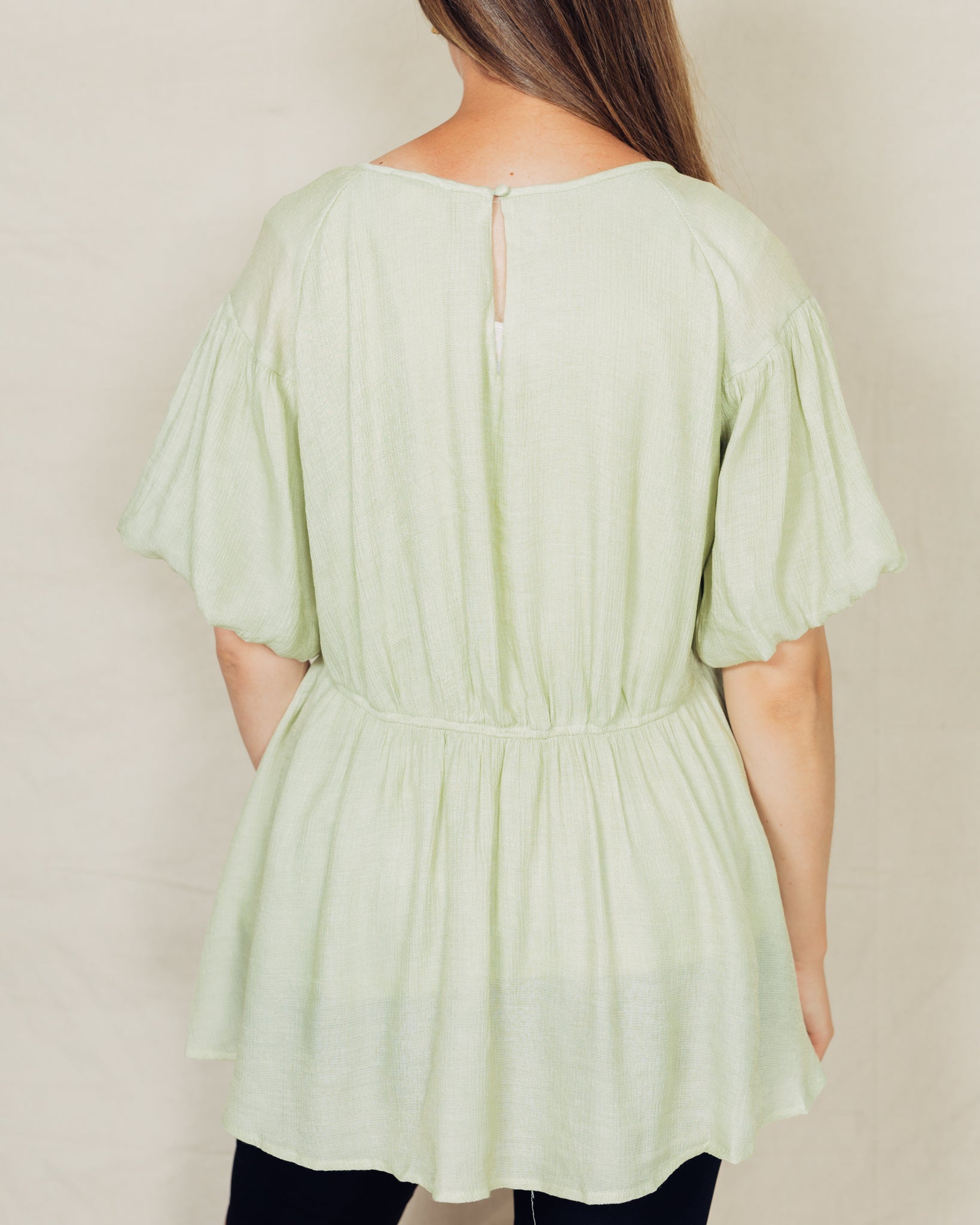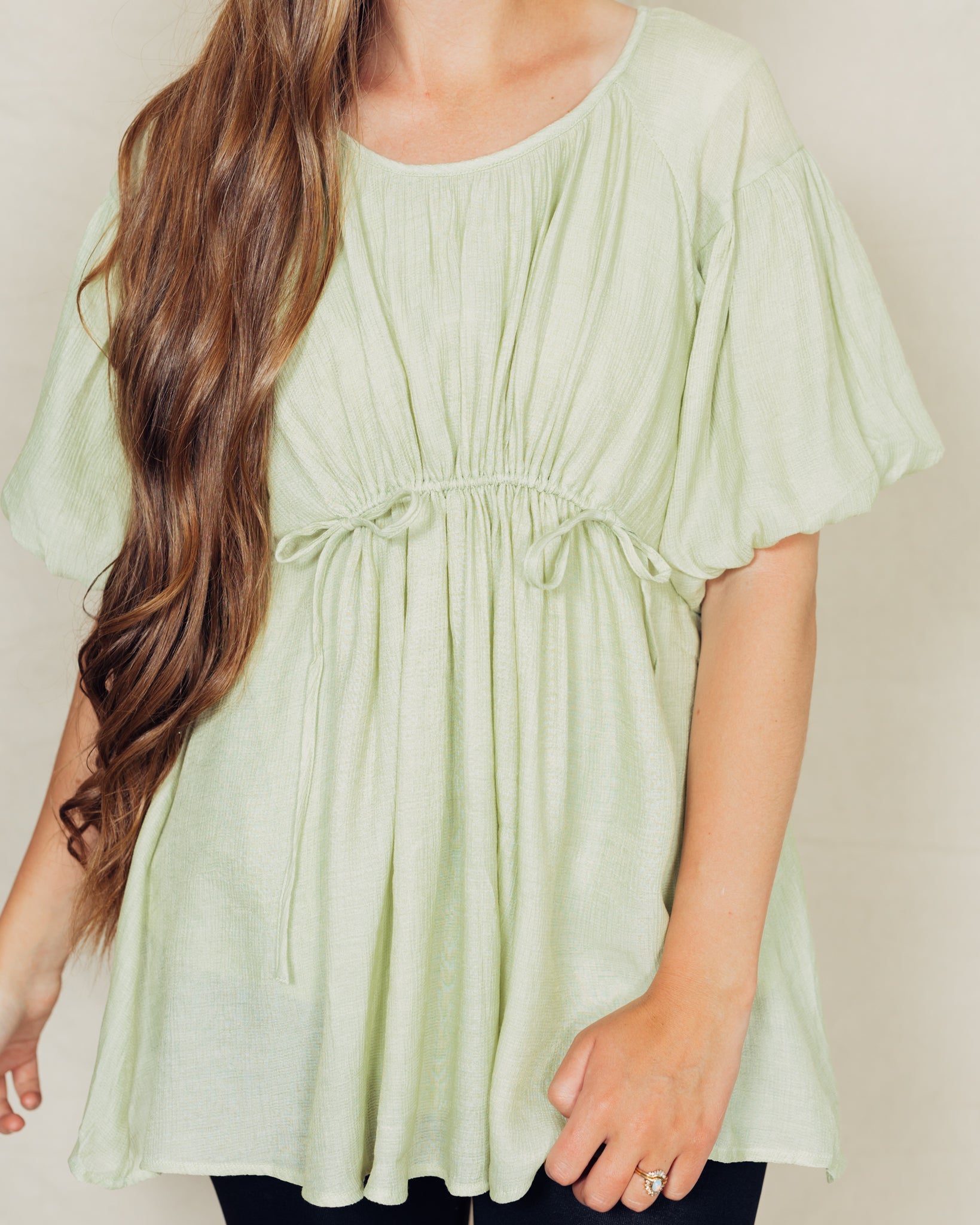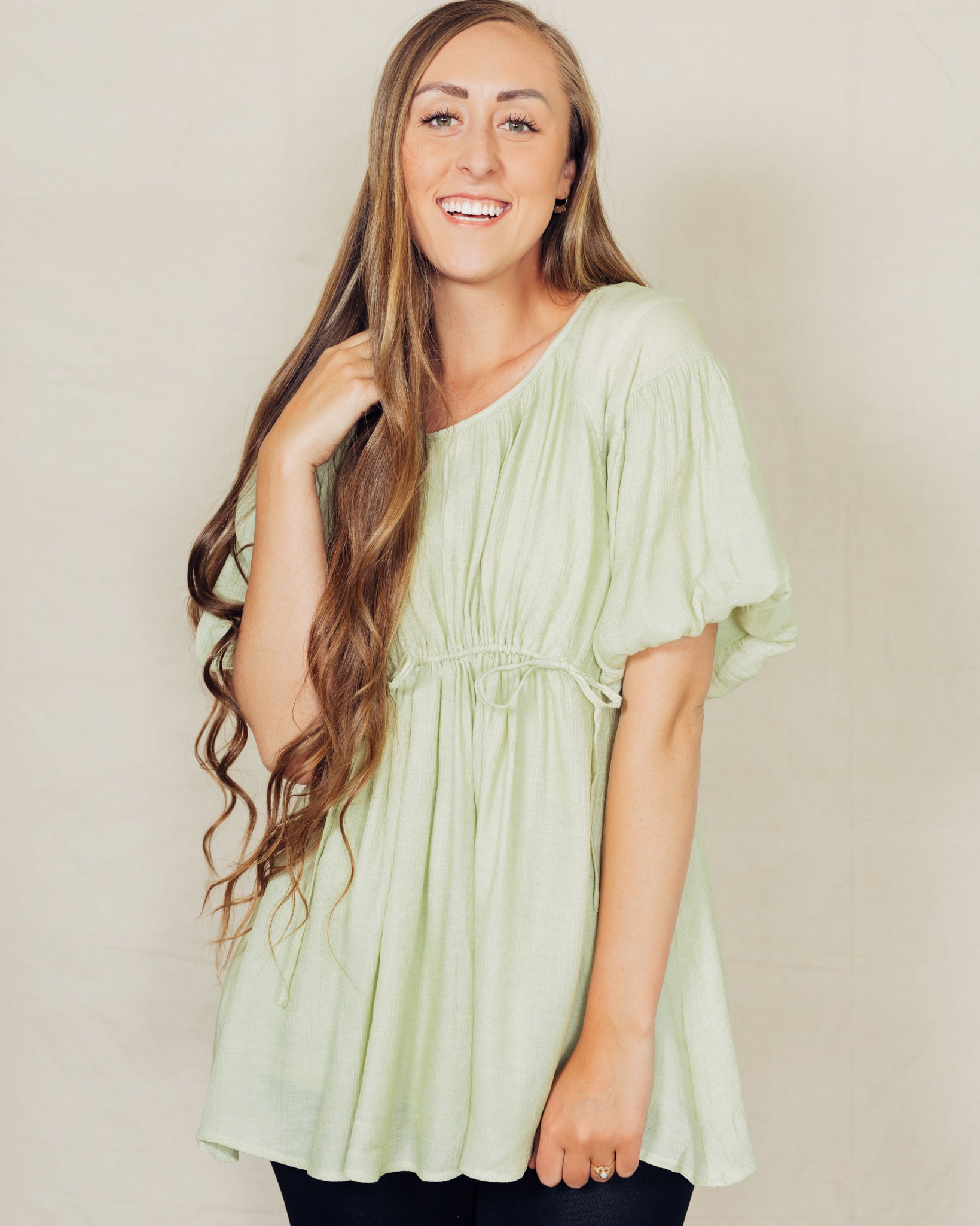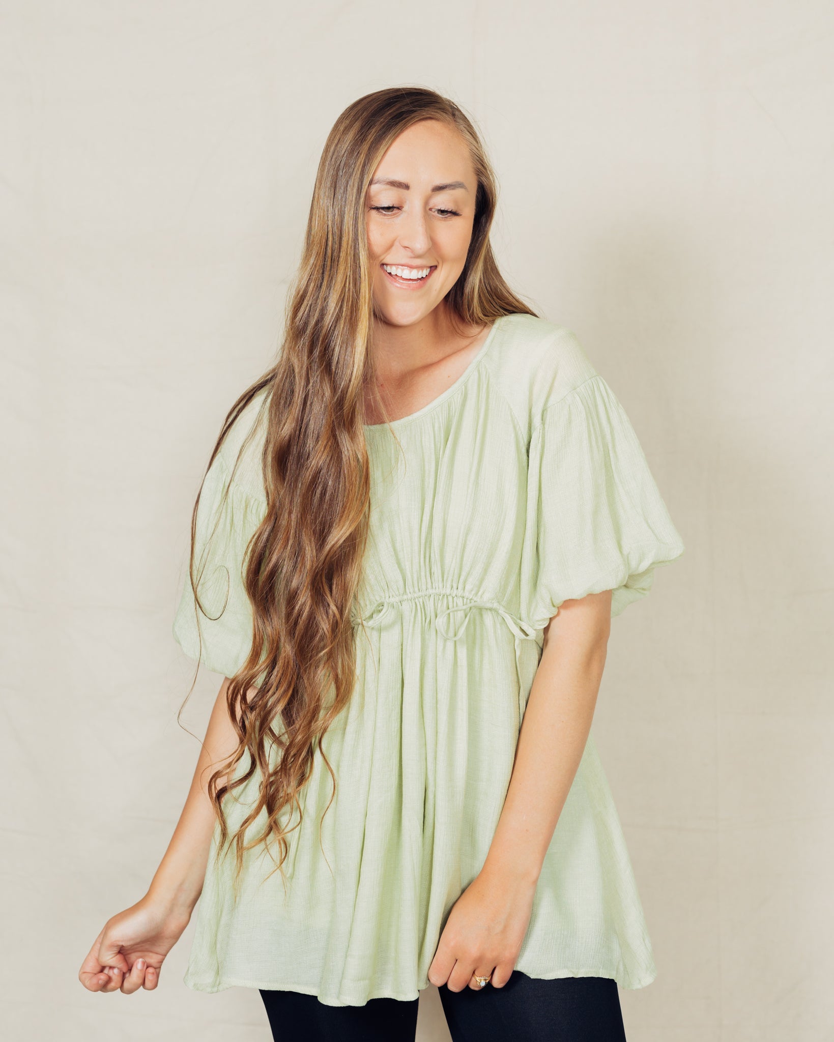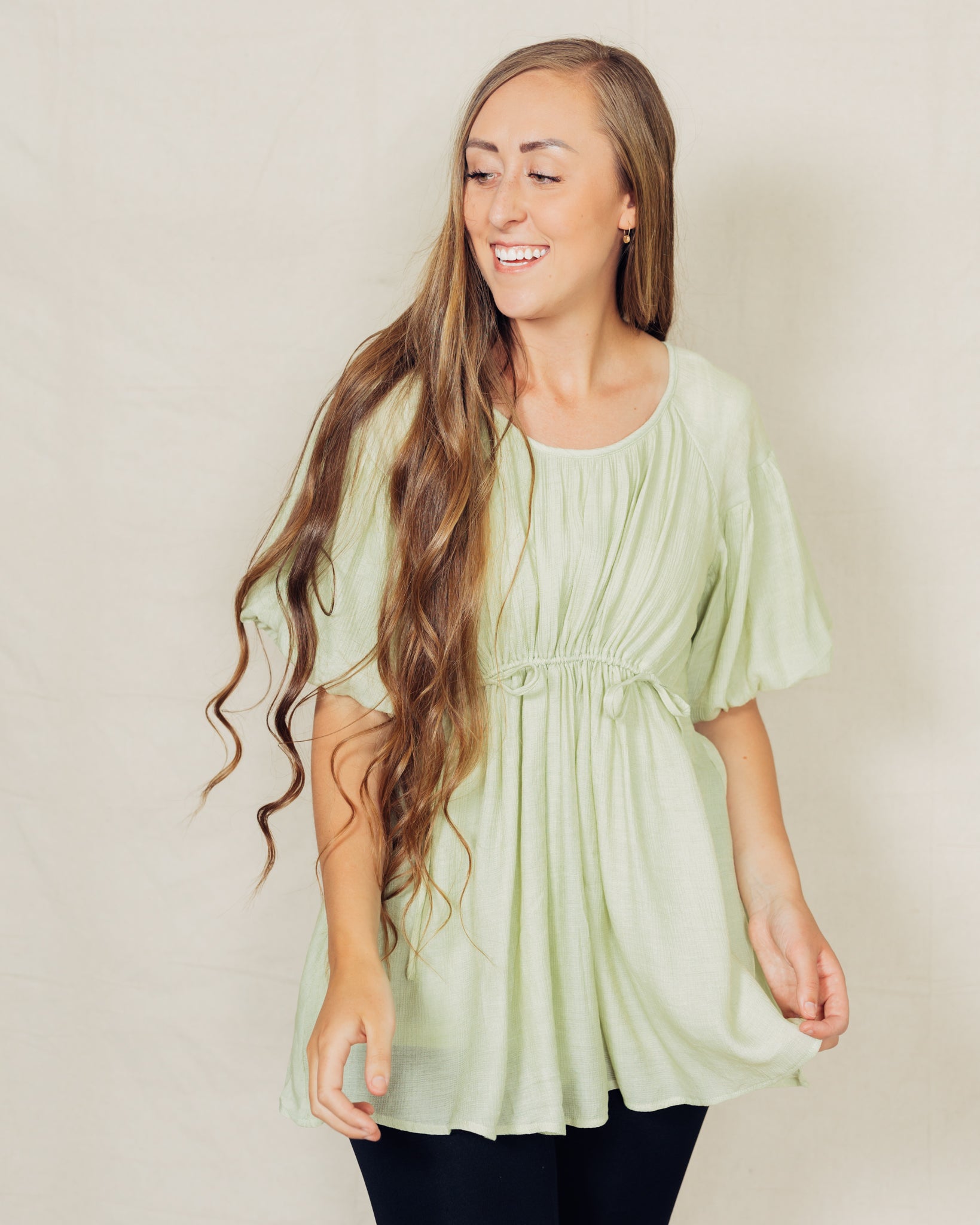 The Maude Top is fully lined, and it has a functional tie so you can have it as loose or as fitted as you want. I am 5'9" and wearing a size small. The fabric content is 91% rayon and 9% polyamide, and the lining is 100% polyester.