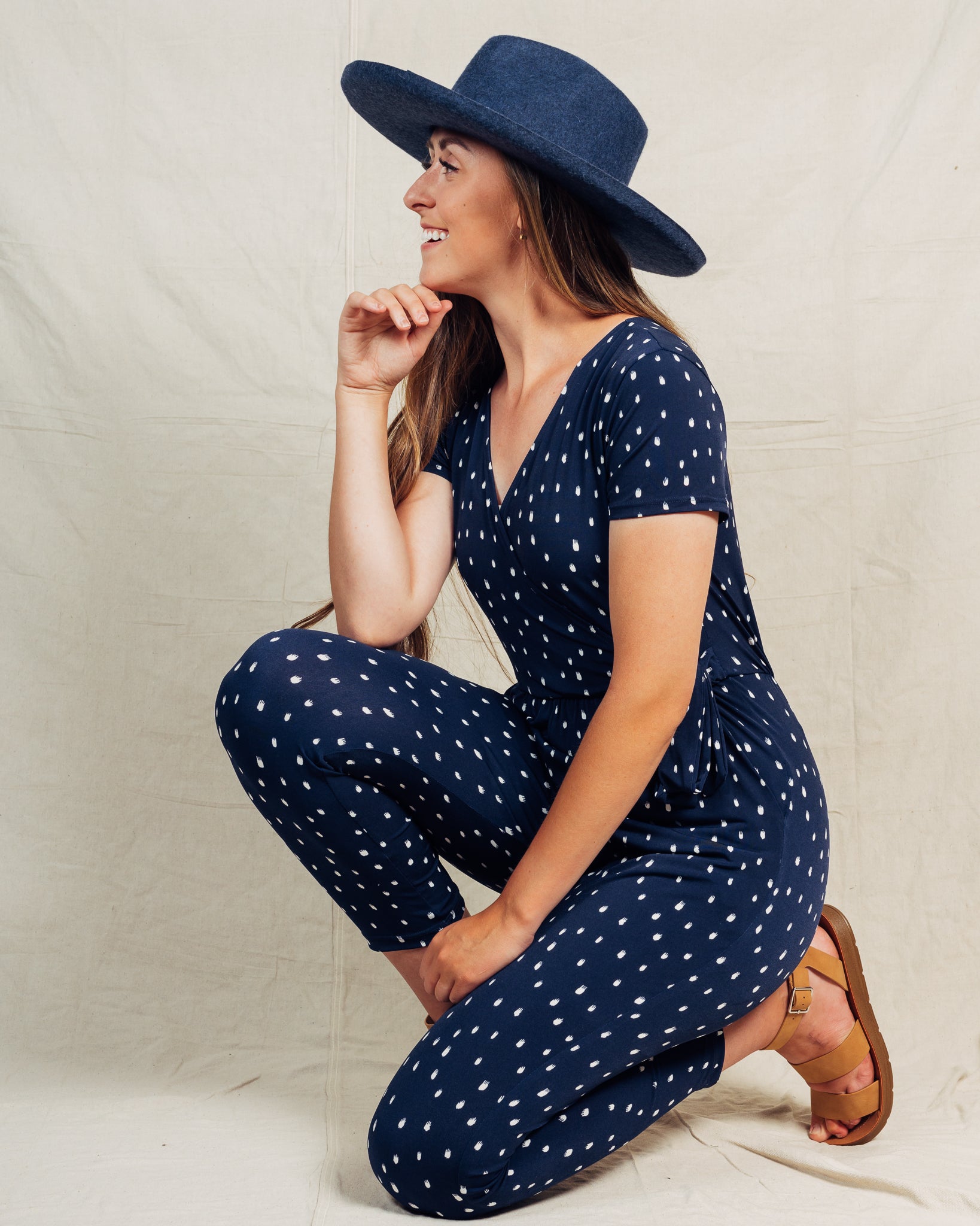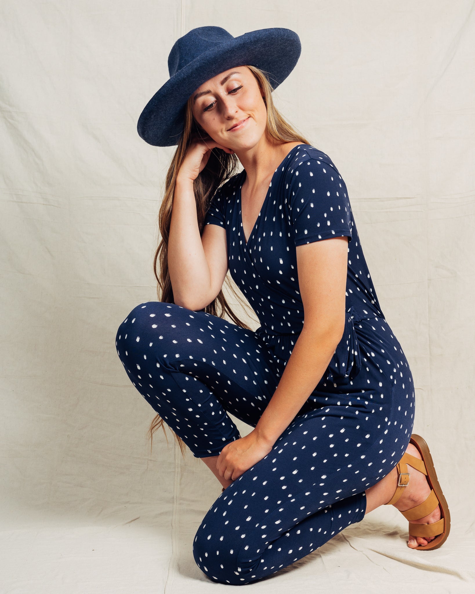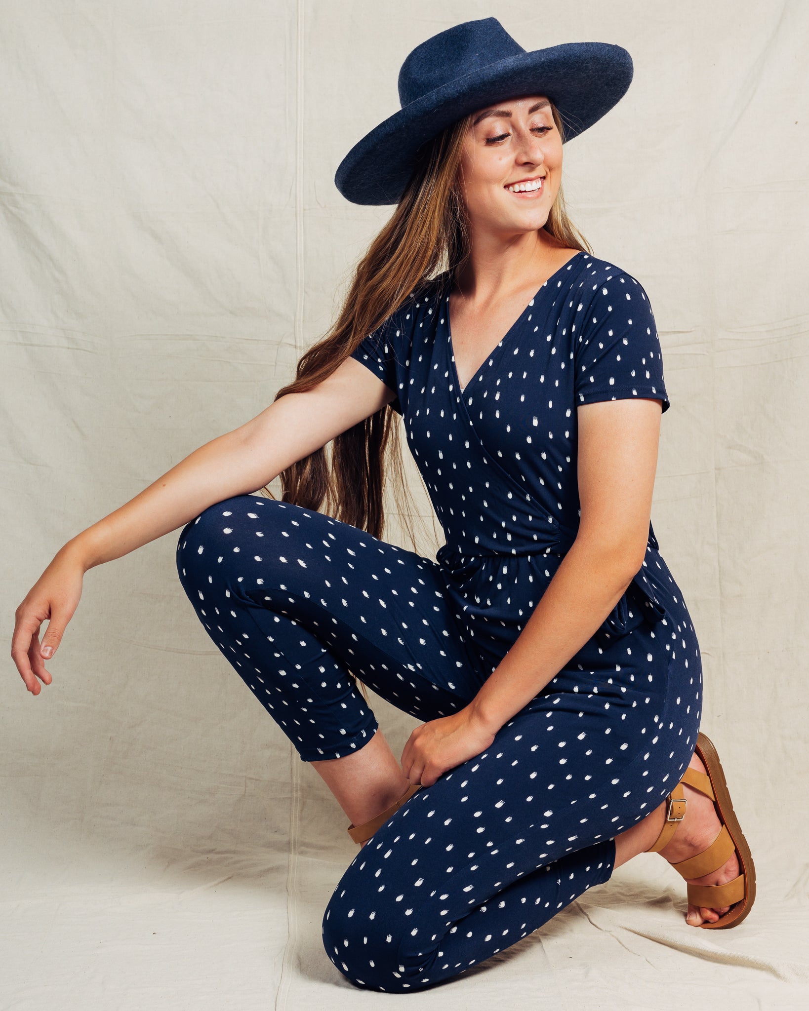 The Millie Jumpsuit is stretchy all over! It has an elastic waist and a faux wrap top. I am 5'9" and wearing a size small. The fabric content is