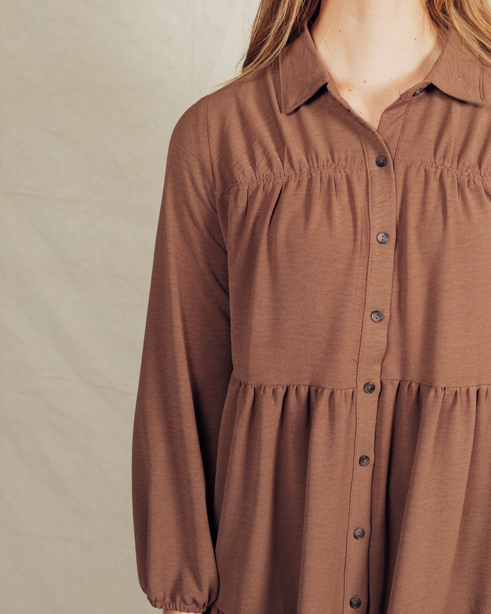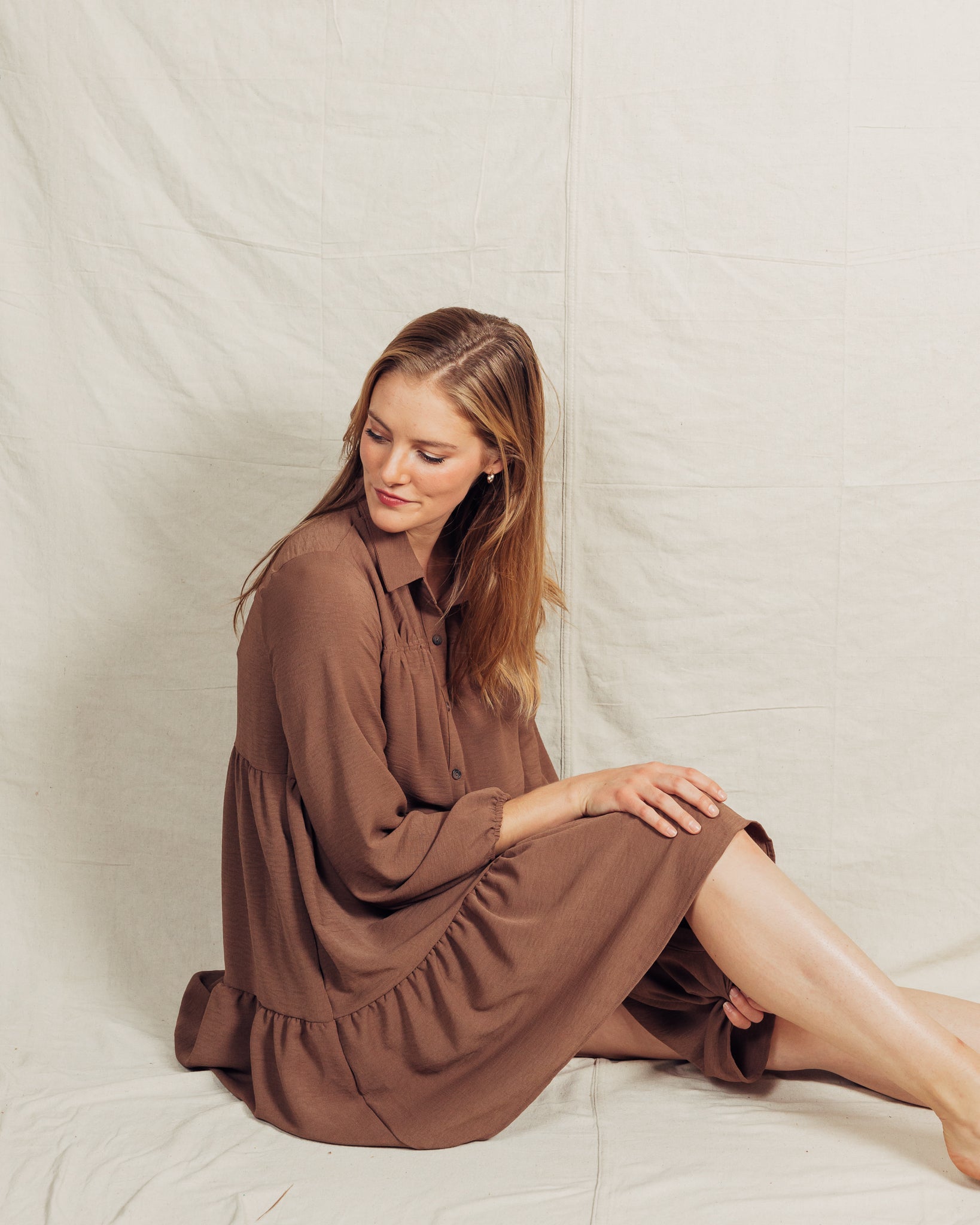 The Nicole Dress is non-sheer and lightweight, and it has pockets. The model is 5'10" and wearing a size small. The fabric content is 100% polyester.