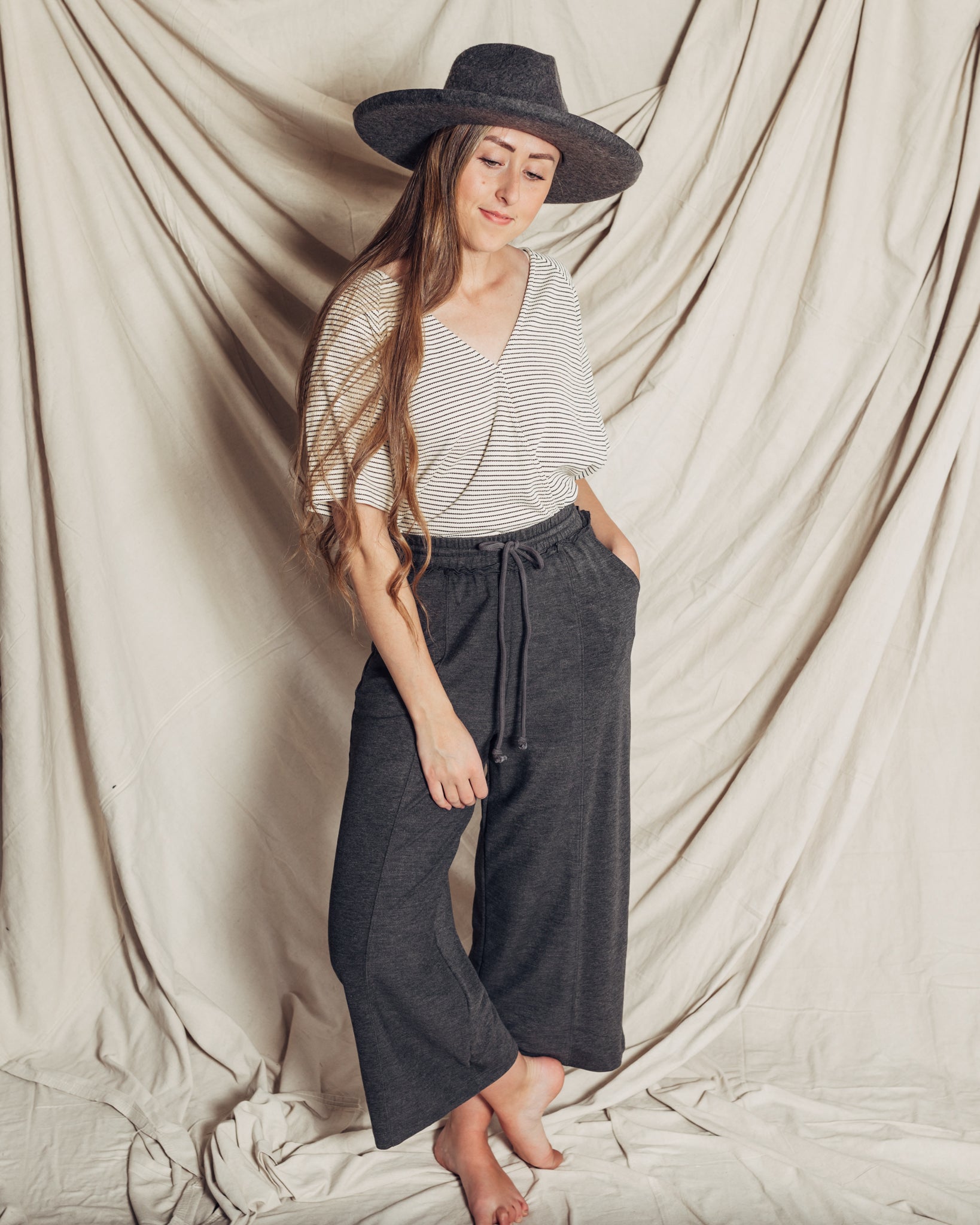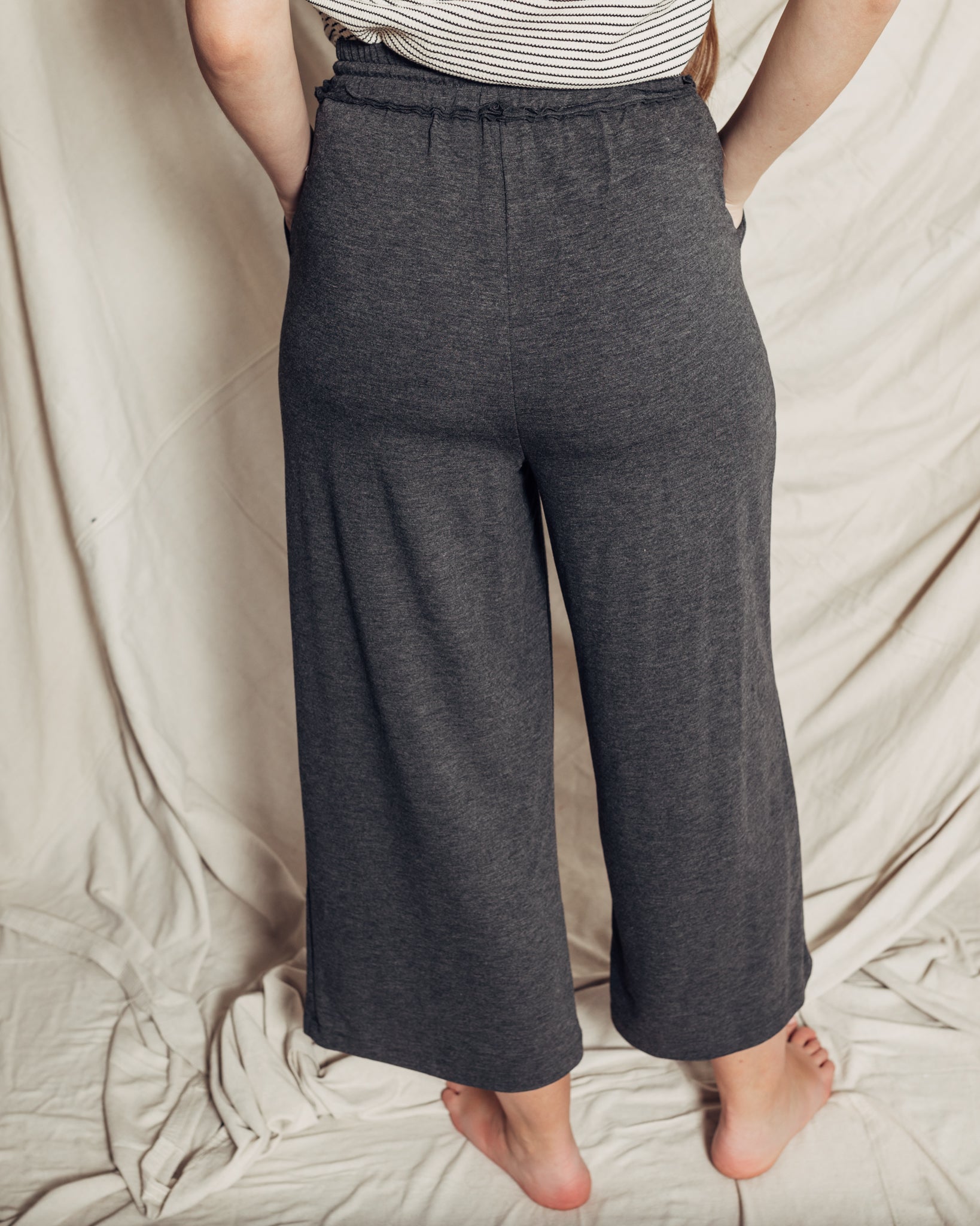The Reagan Pants are nice and comfy! The fabric is so soft. The waistband is elastic and has a functional tie, and it has pockets. I am 5'9" and wearing a size small. The fabric content is 95% rayon and 5% spandex.