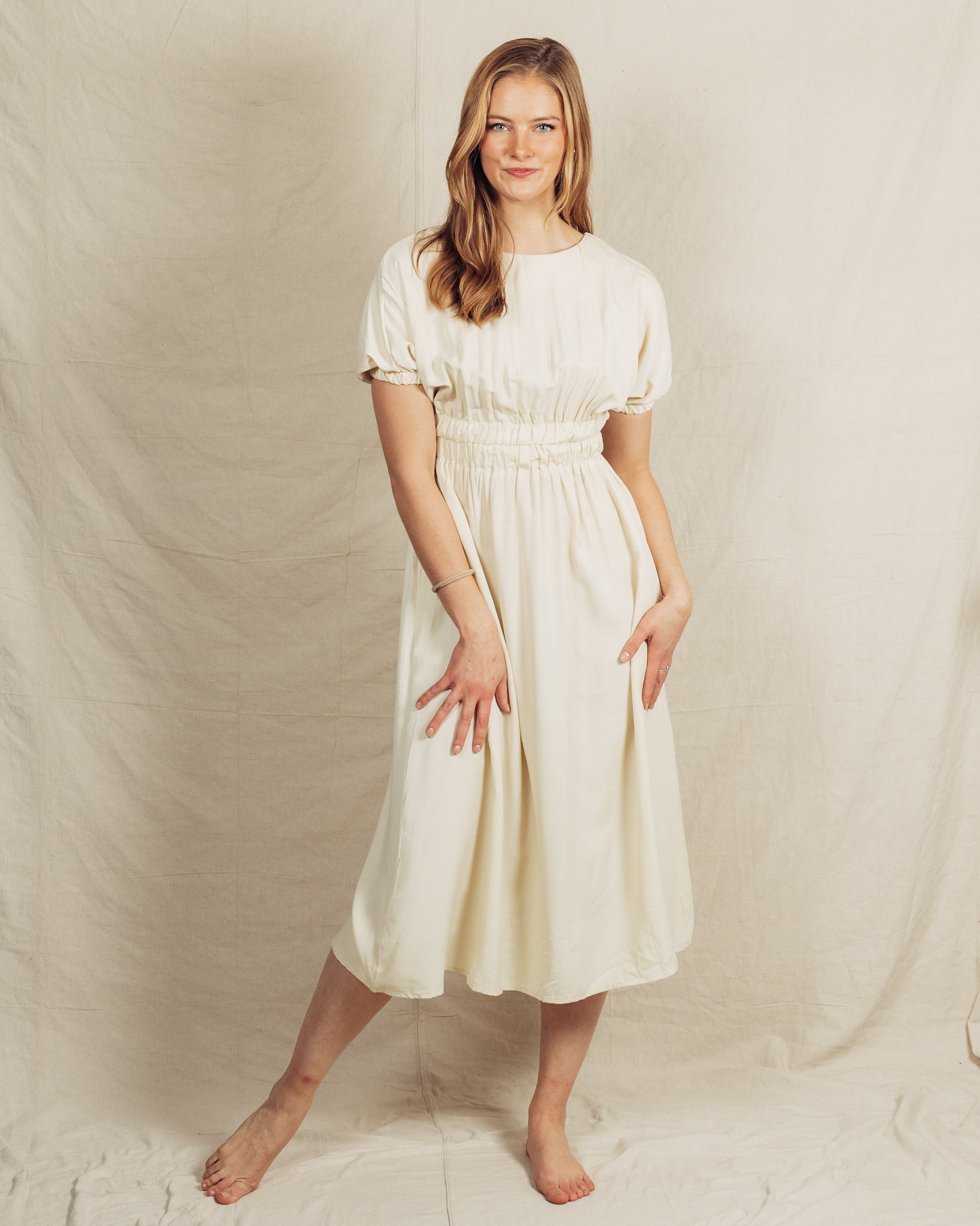 The Reese Dress is one size fits all, and the waistband is pretty stretchy. It is not lined, but it does have pockets. Model is 5'10" and wearing a size small. The fabric content is 100% polyester.