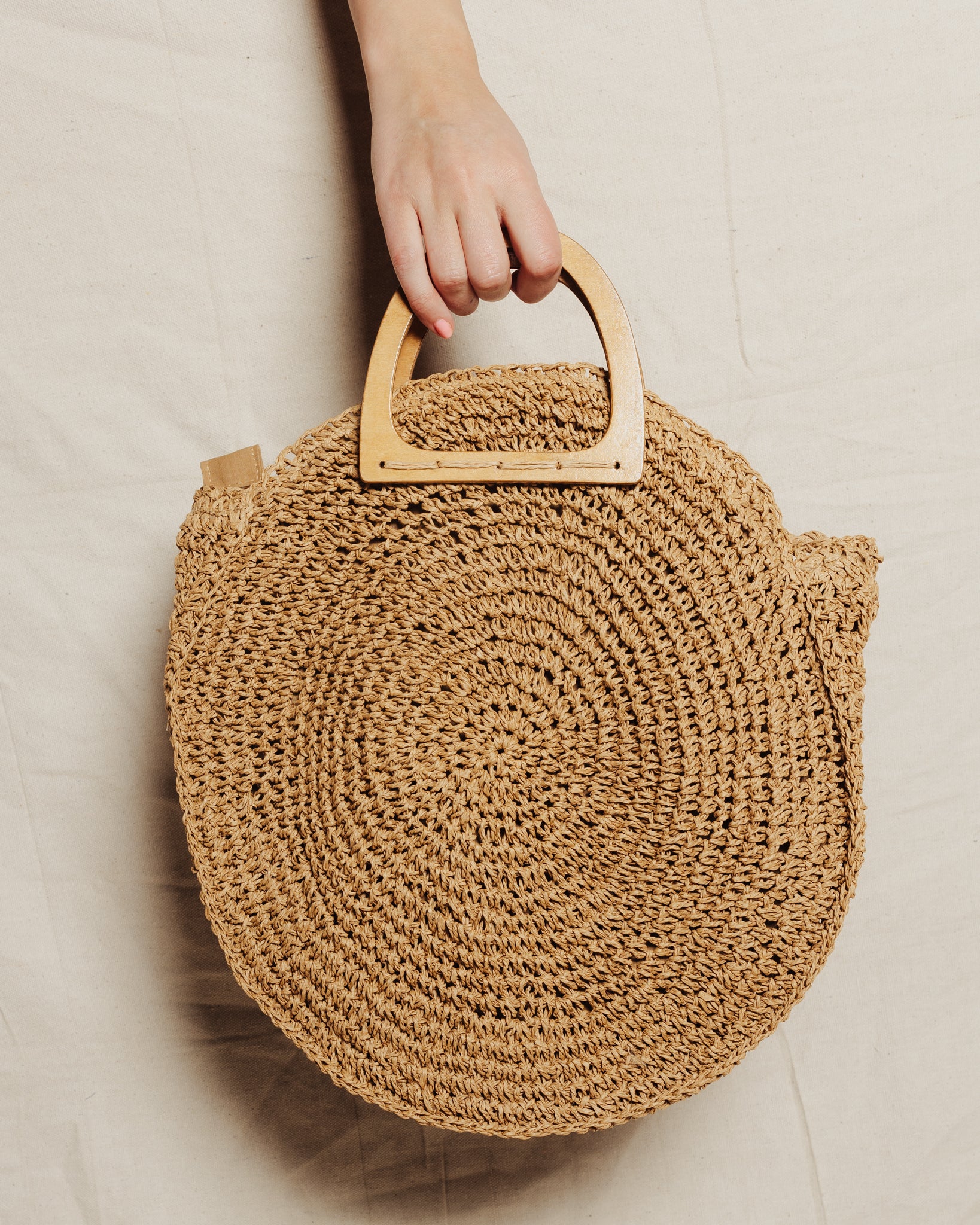 This bag has a zipper closure, and it is lined on the inside. It has a wooden handle and a long handle, too. The bag is about 14.5" in diameter.