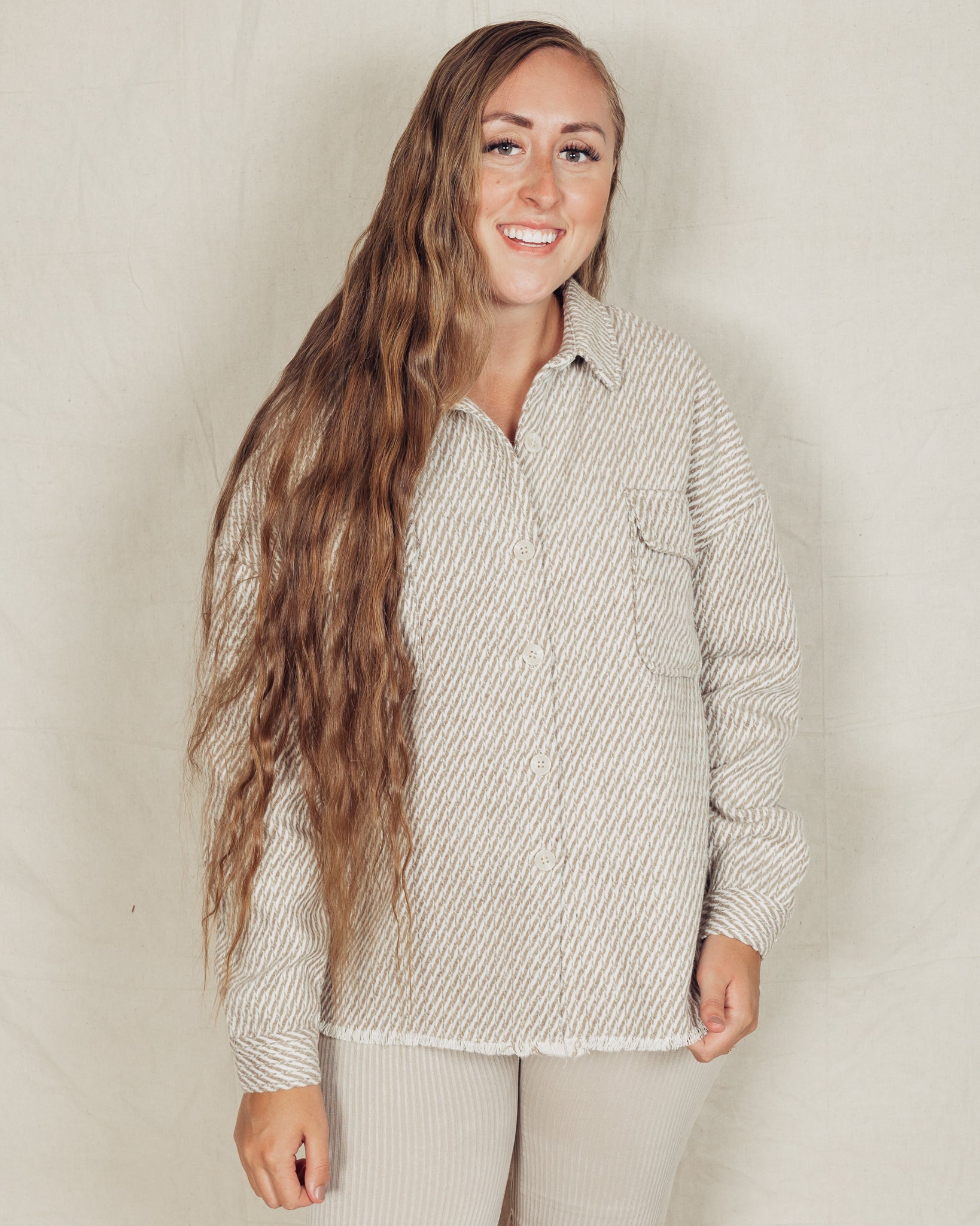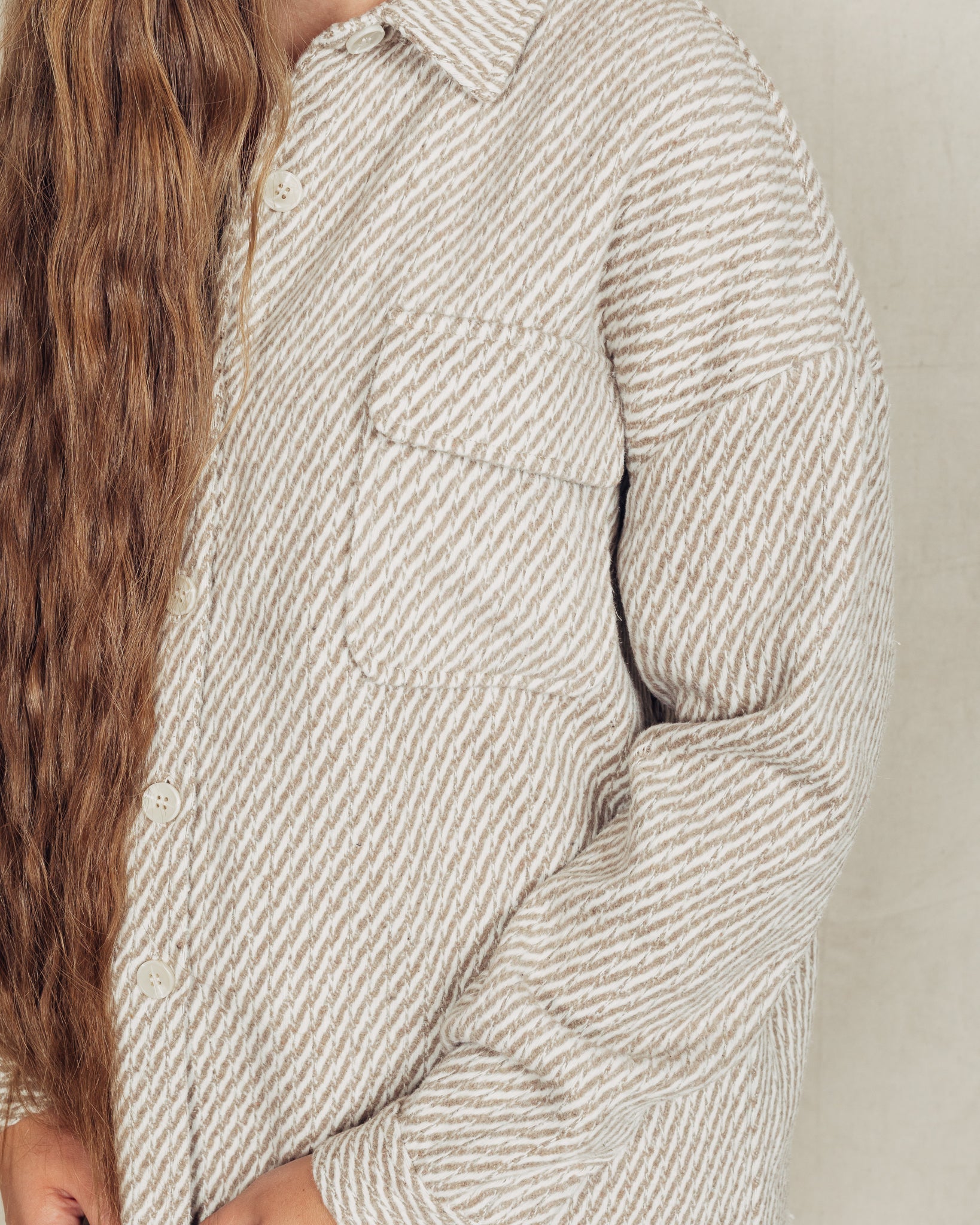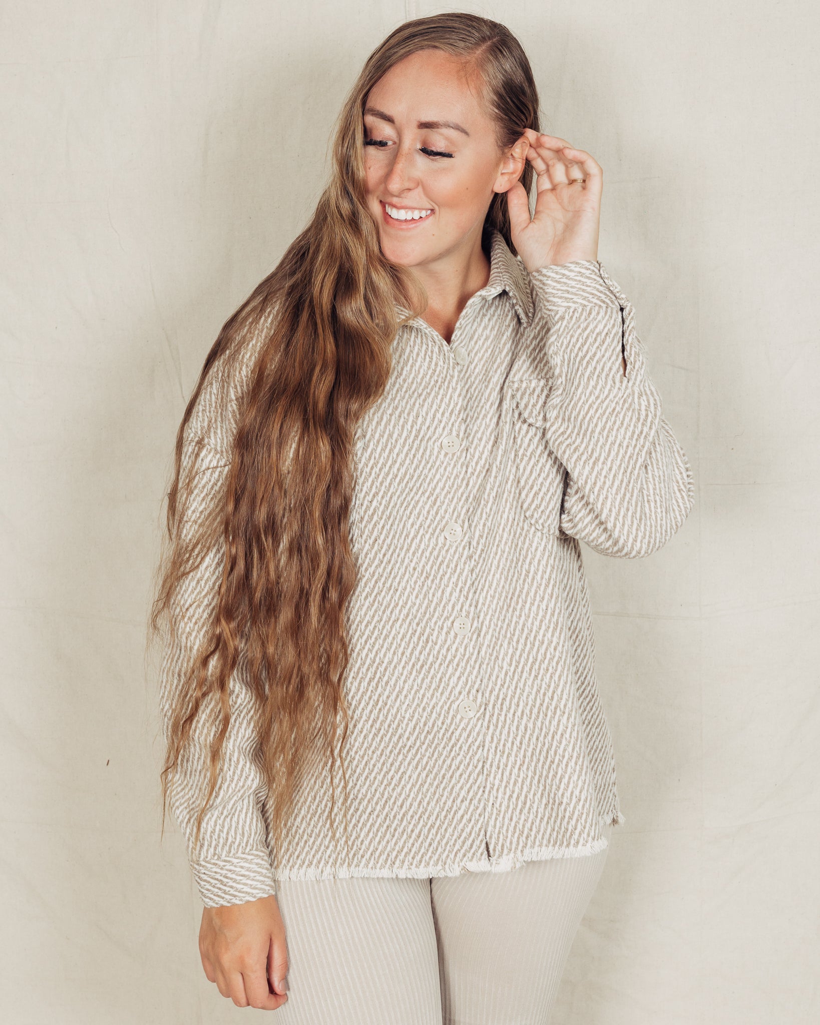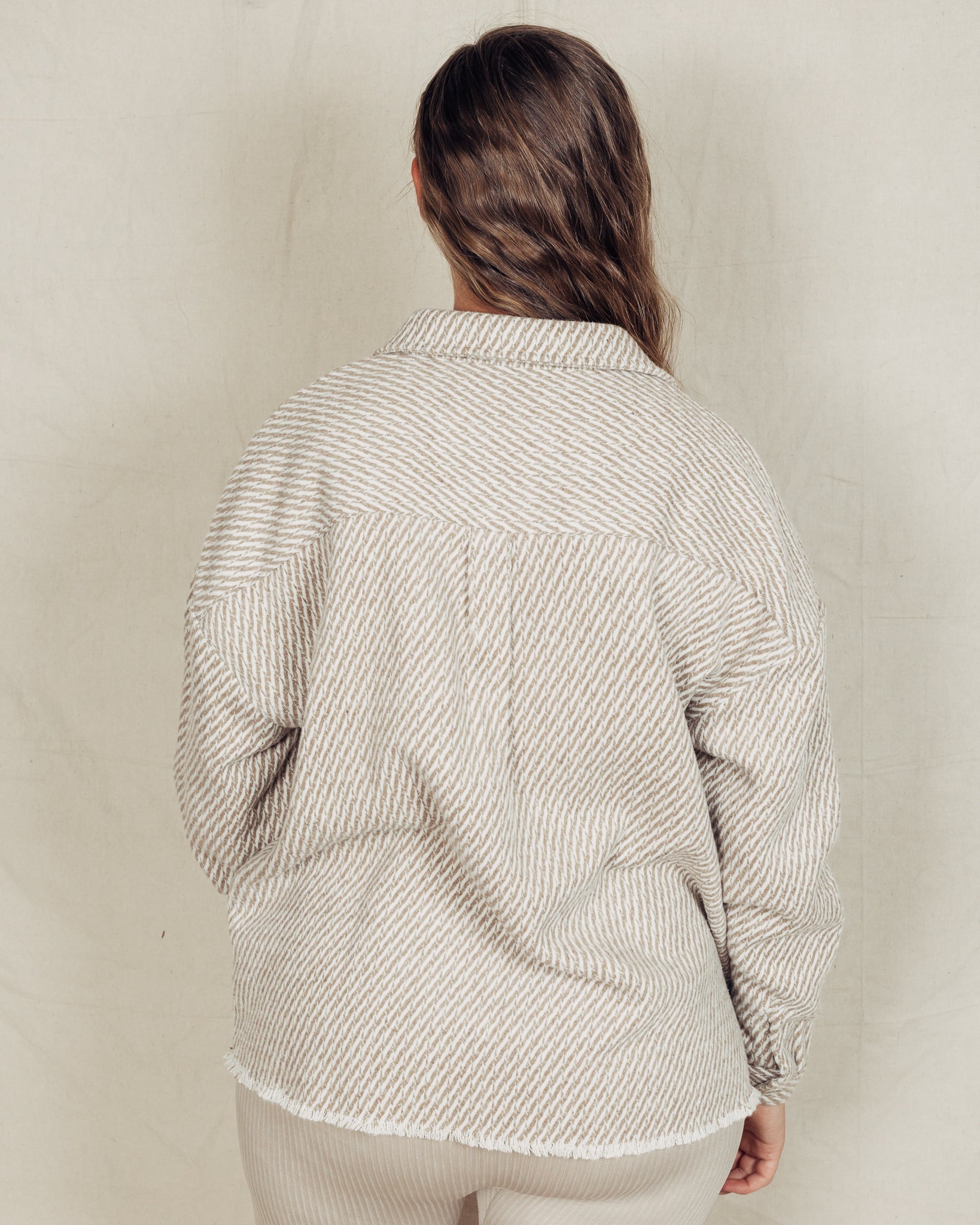 The Sandy Shacket is the perfect neutral to wear with anything. the buttons are all functional. I am 5'9" and wearing a size small. The fabric content is 100% polyester.