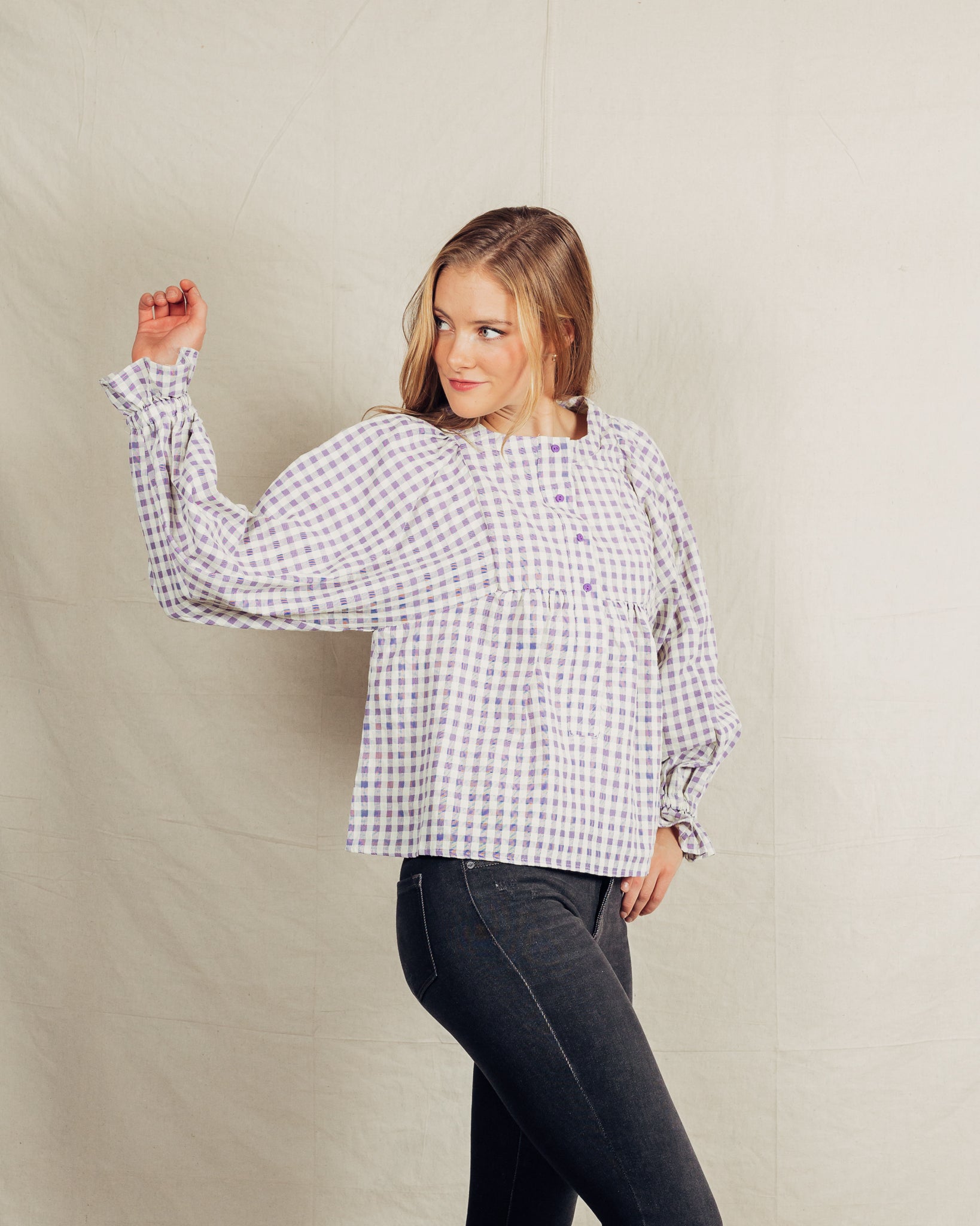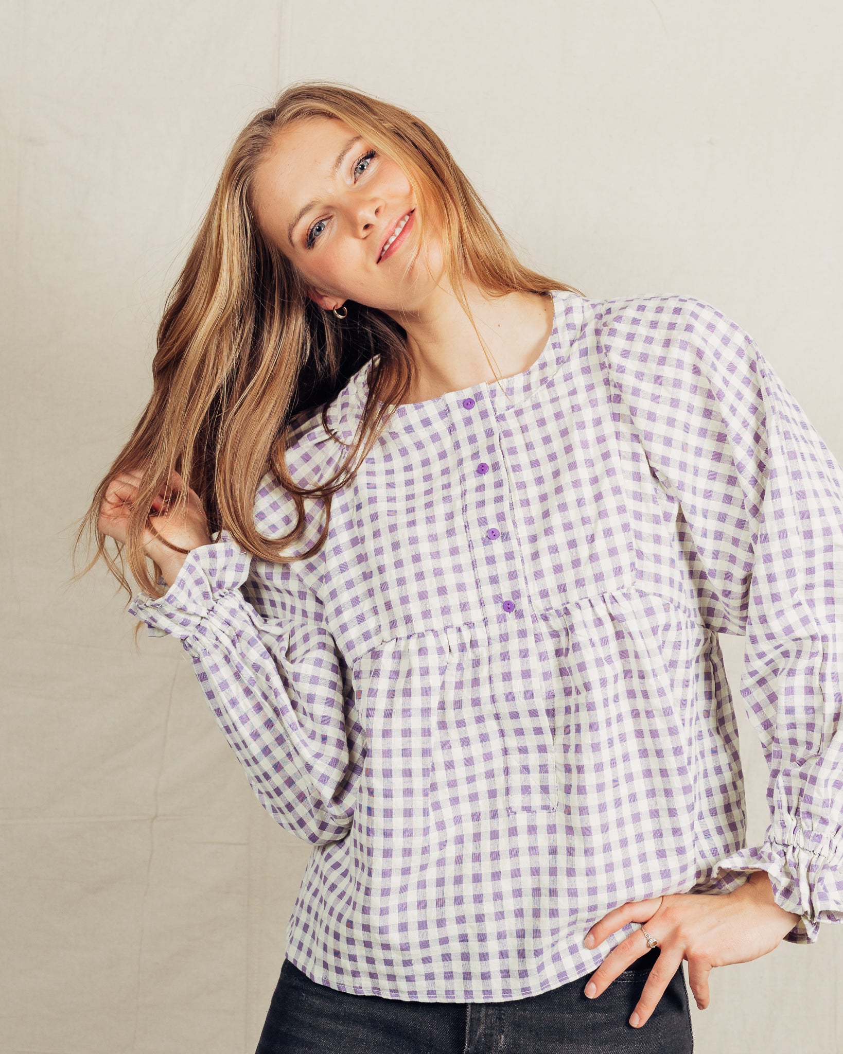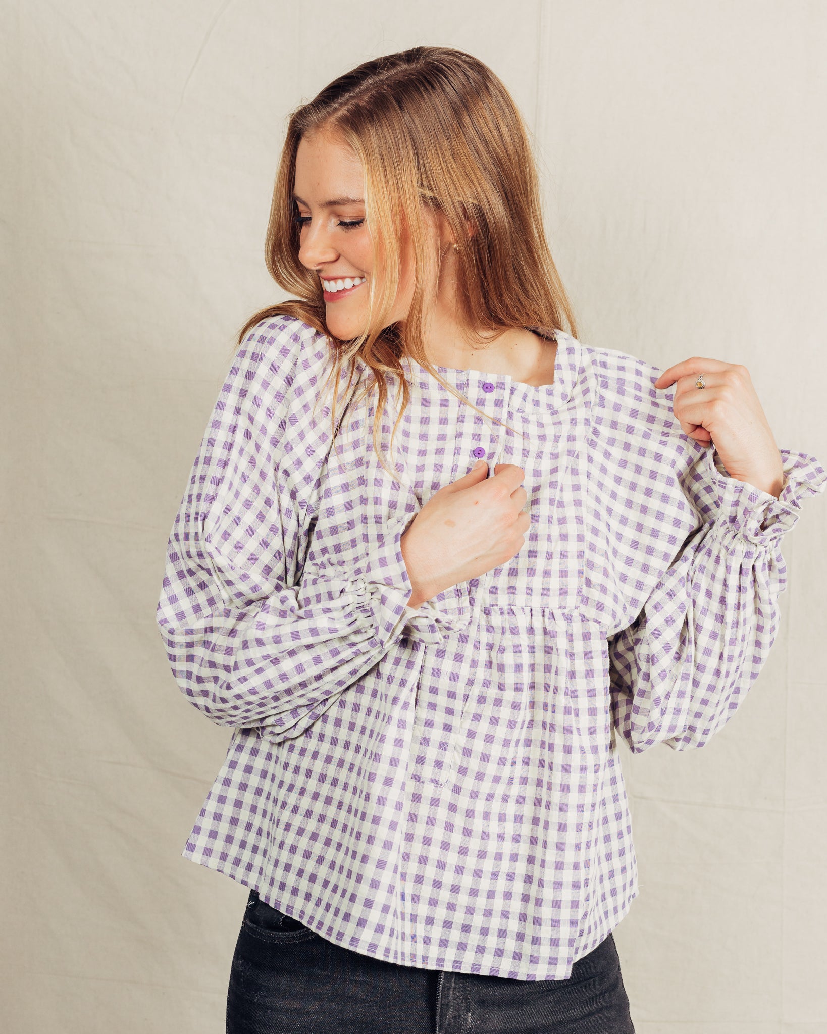 The Savy Top is so feminine! It is lined, and it has functional buttons, too. The model is 5'10" and wearing a size small. The fabric content is 55% polyester and 45% cotton.