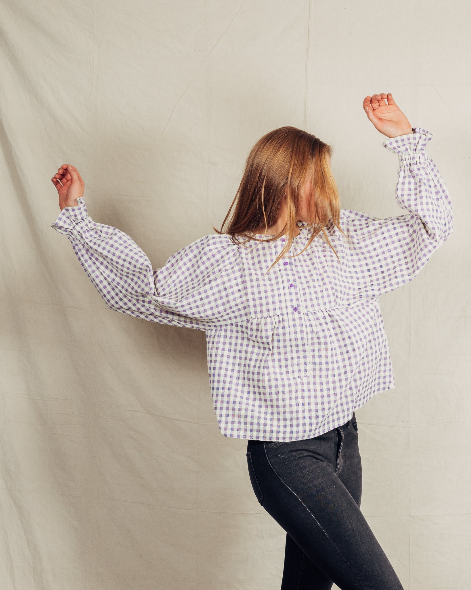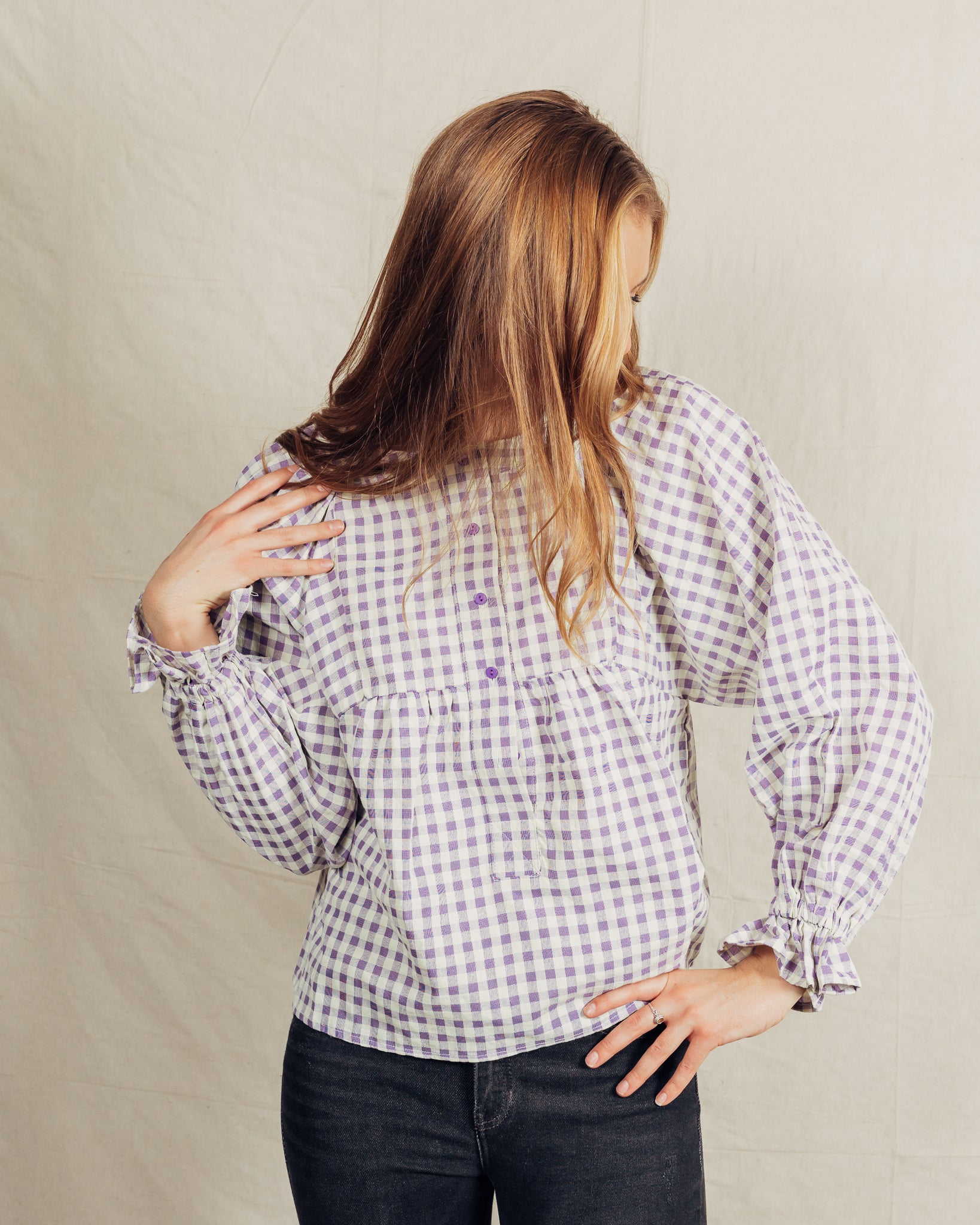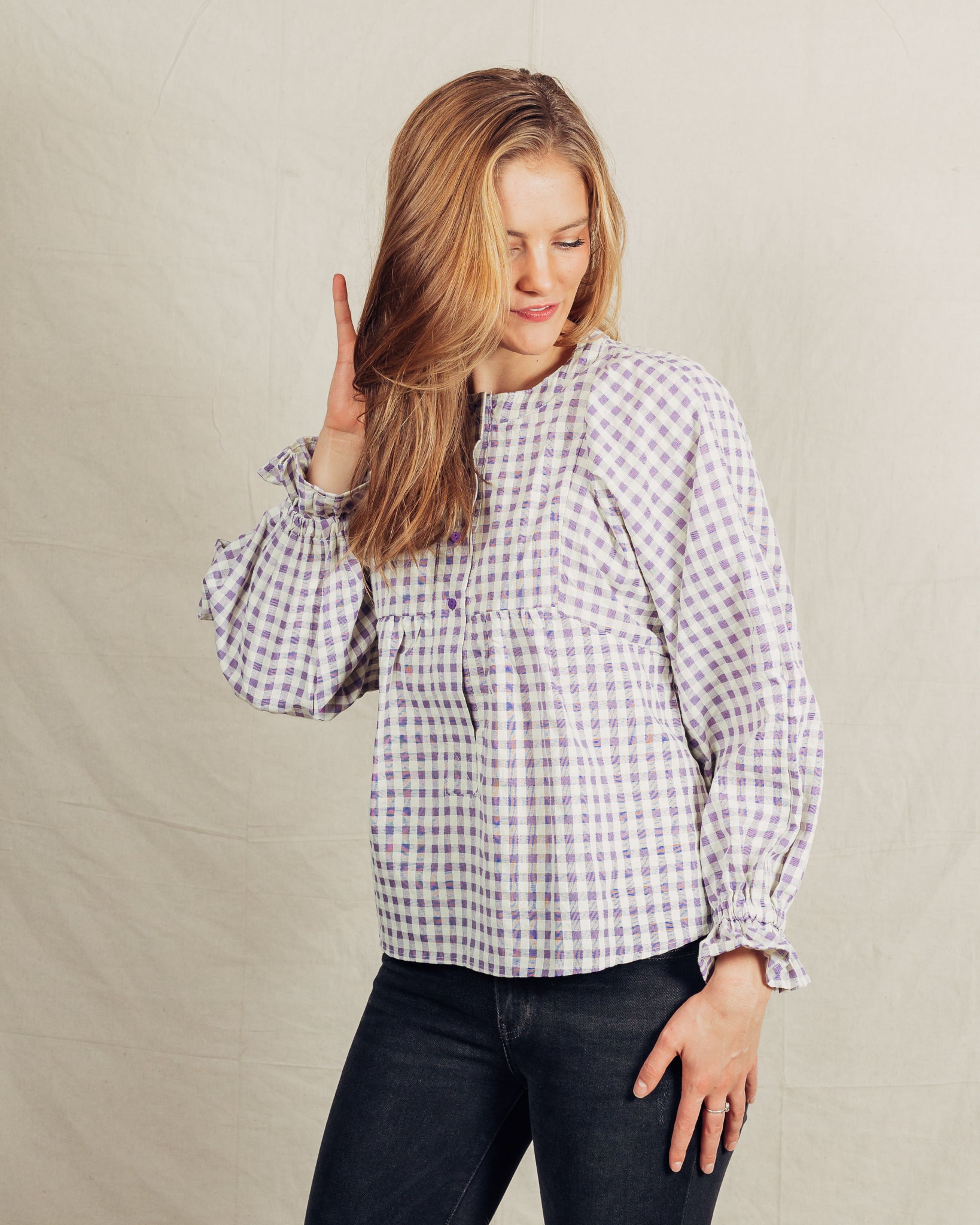 The Savy Top is so feminine! It is lined, and it has functional buttons, too. The model is 5'10" and wearing a size small. The fabric content is 55% polyester and 45% cotton.