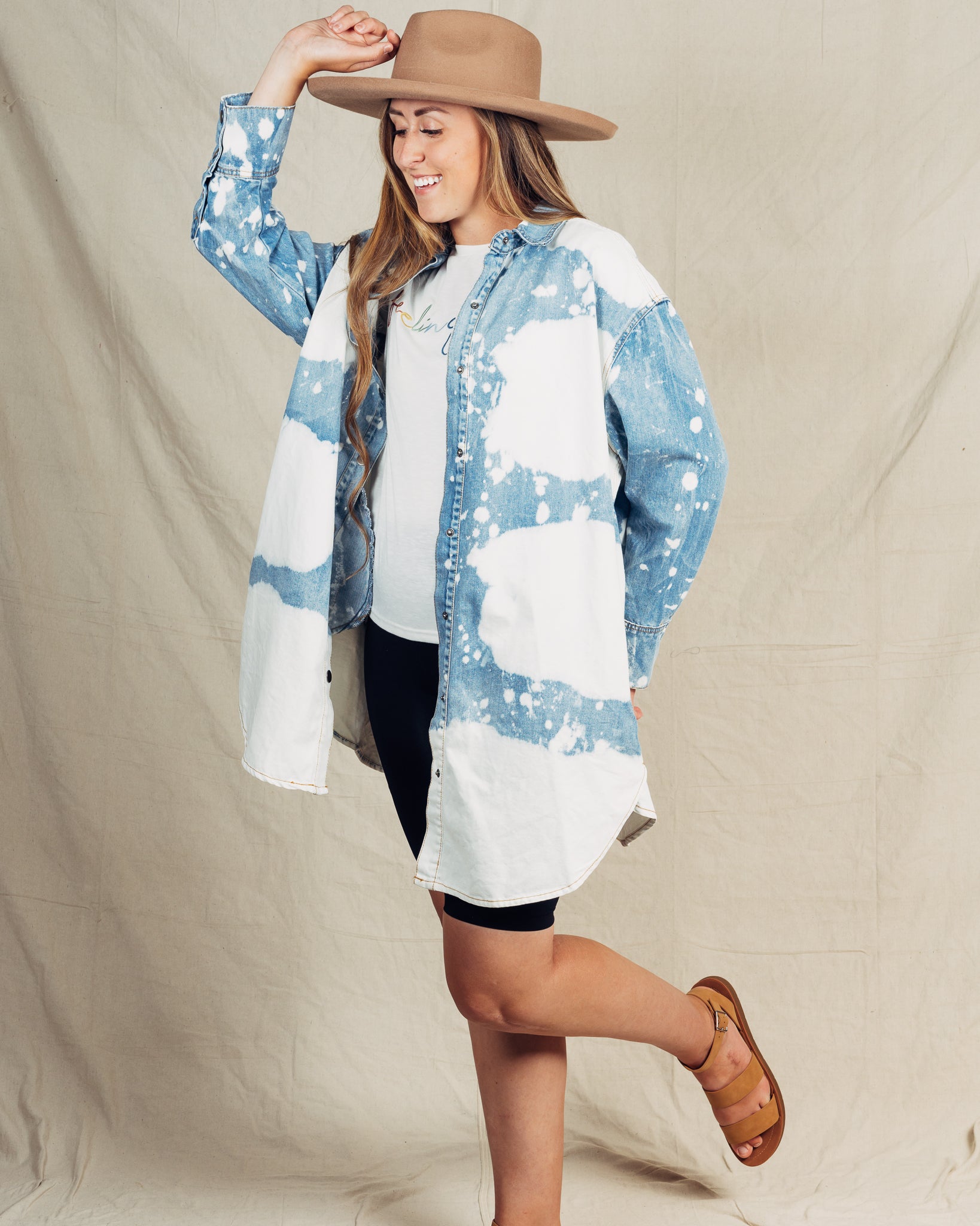 The splotch denim shacket is awesome. It's not as thick as a normal denim jacket, and it's long enough to almost be a dress. Wear it as a jacket or a top. I am 5'9" and wearing a size small. The fabric content is 100% cotton.