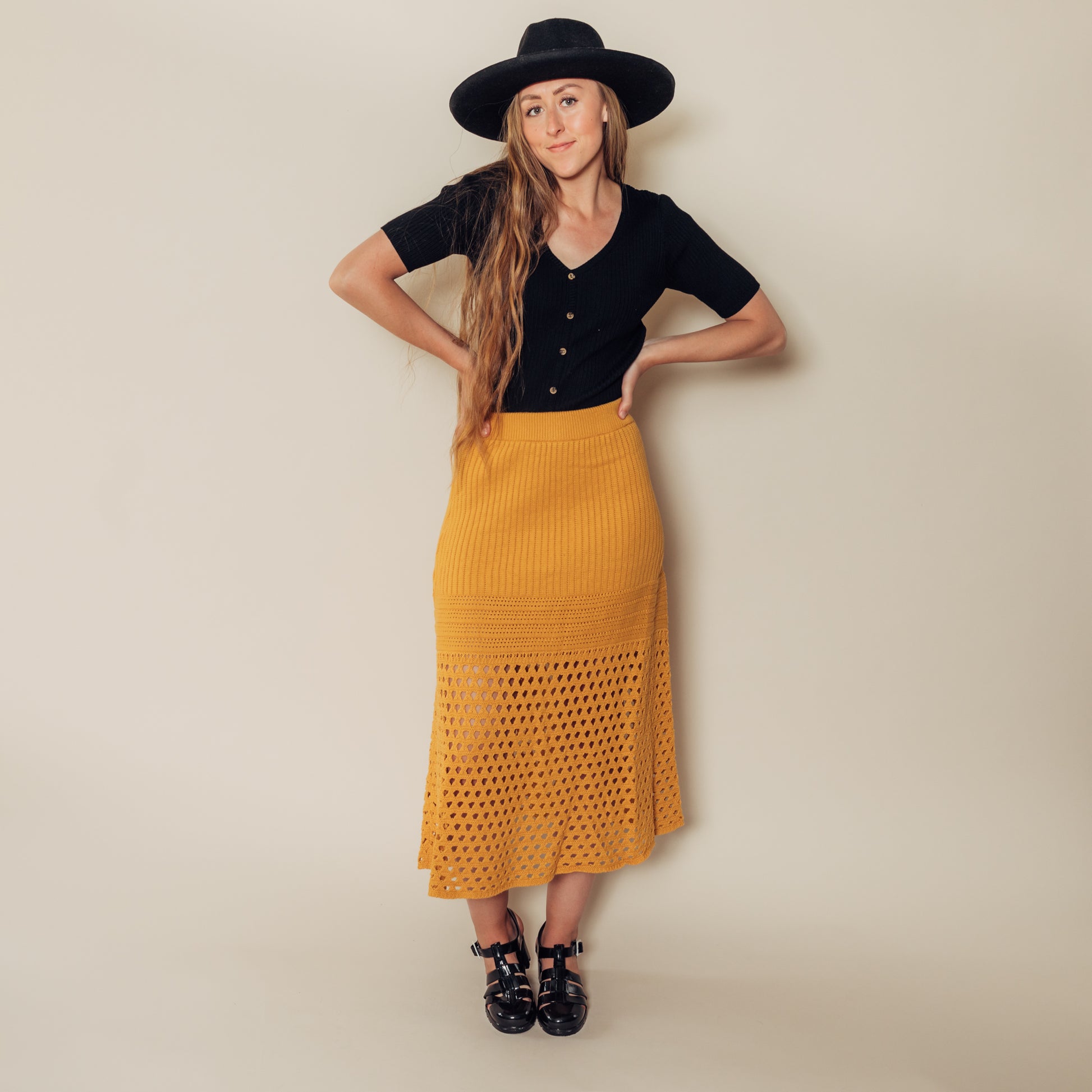 I have paired it with our jen top in black, jelly shoes in black, and lenny hat in black.