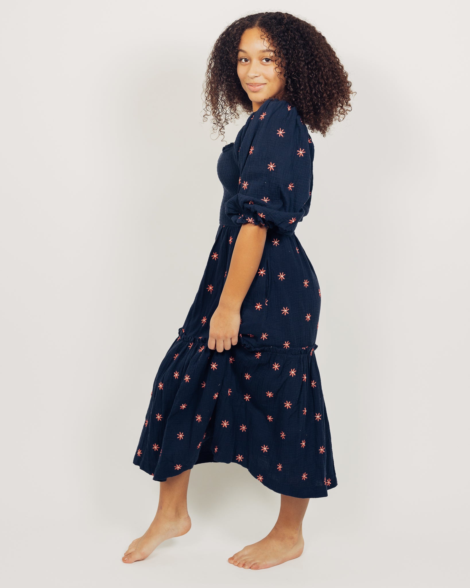 The Tabi Dress is lined and has a smocked top. It's non-sheer and has pockets, too! I am 5'9" and wearing a size small. The fabric content is 100% cotton.