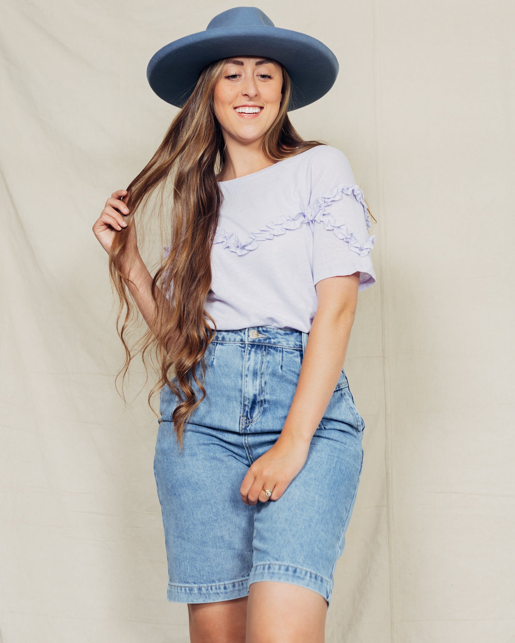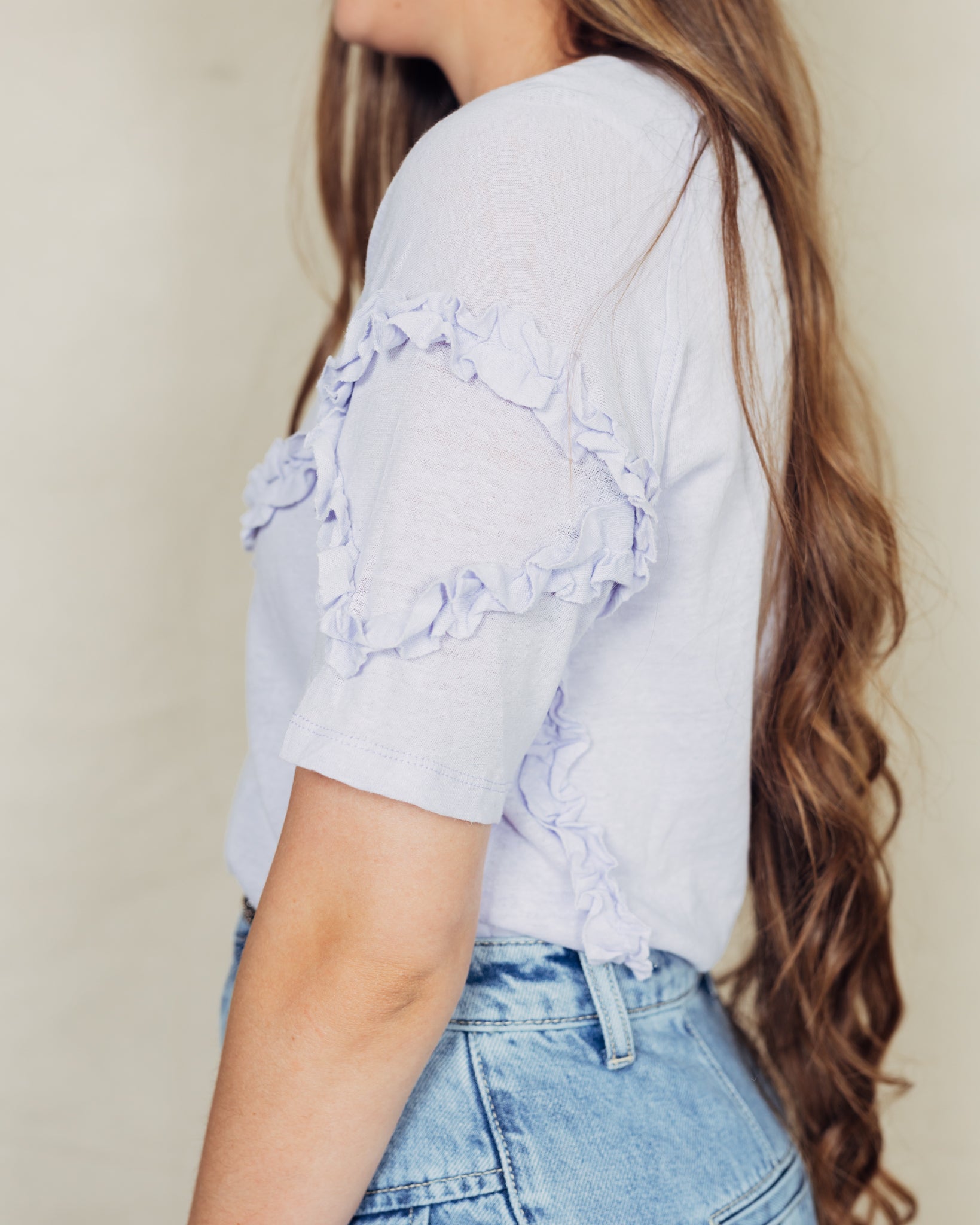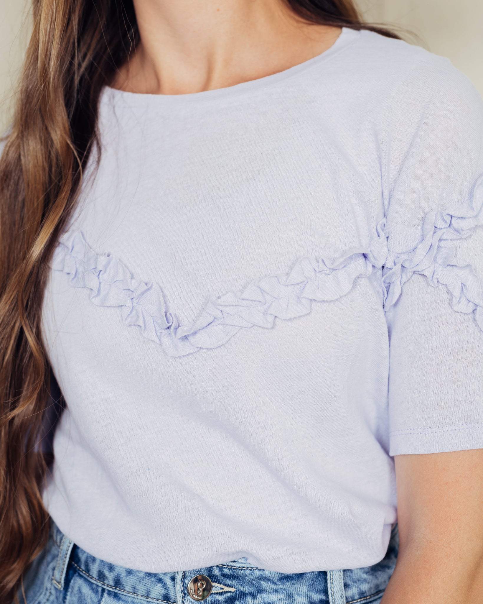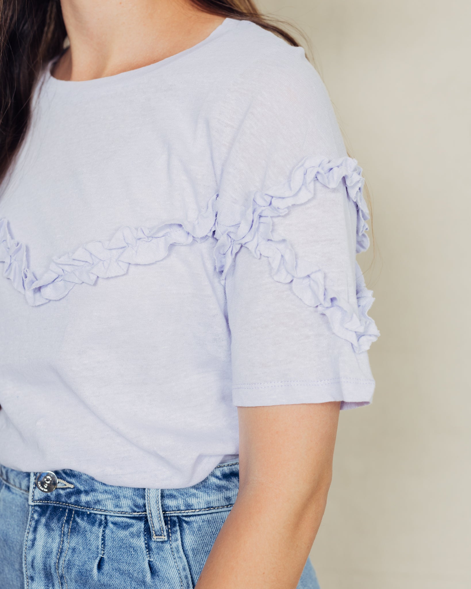 The Trae Top is a tee with a feminine flair. I am 5'9" and wearing a size small. The fabric content is 100% cotton.